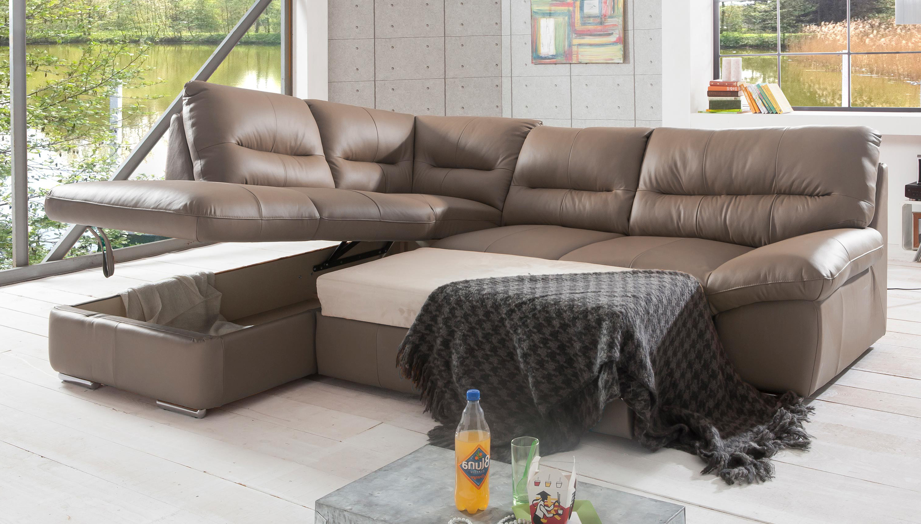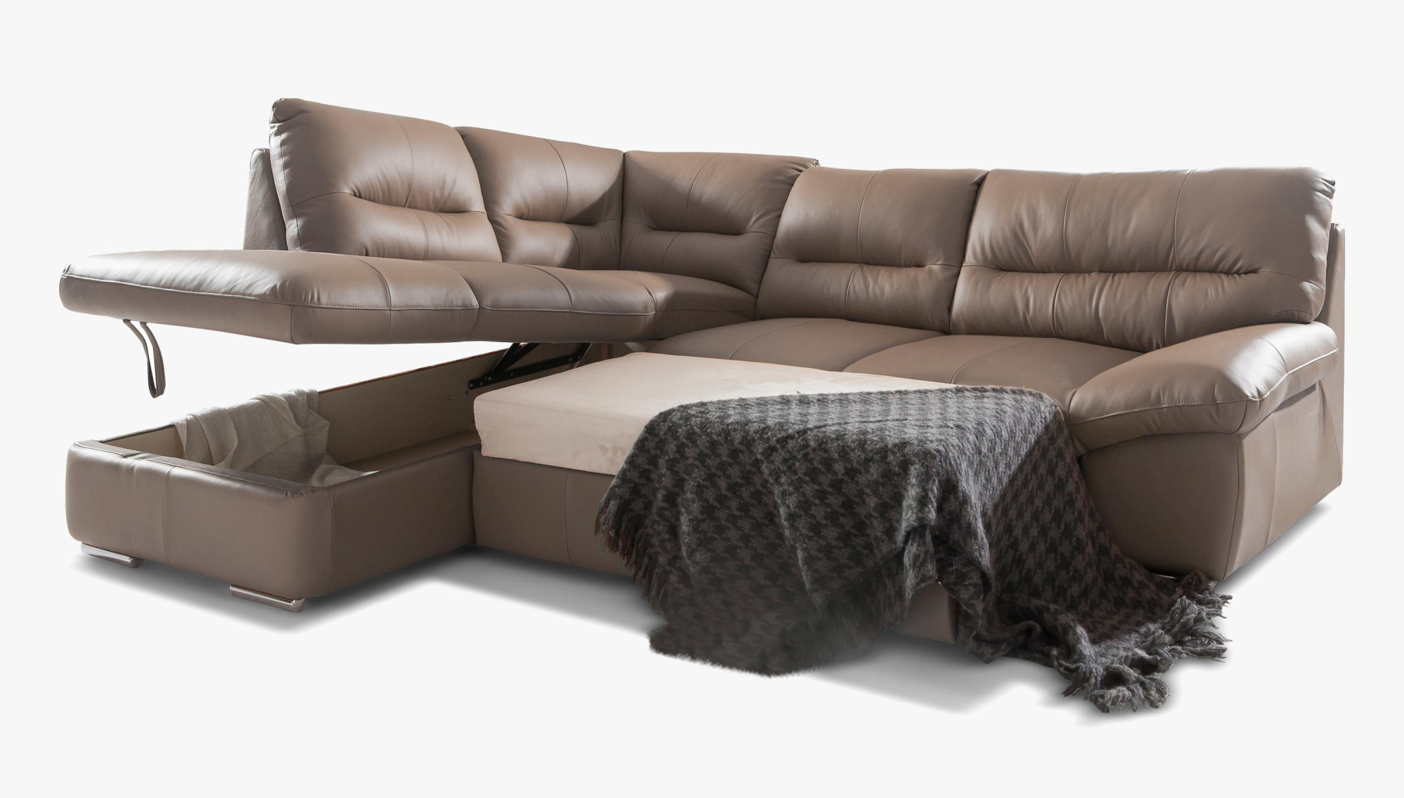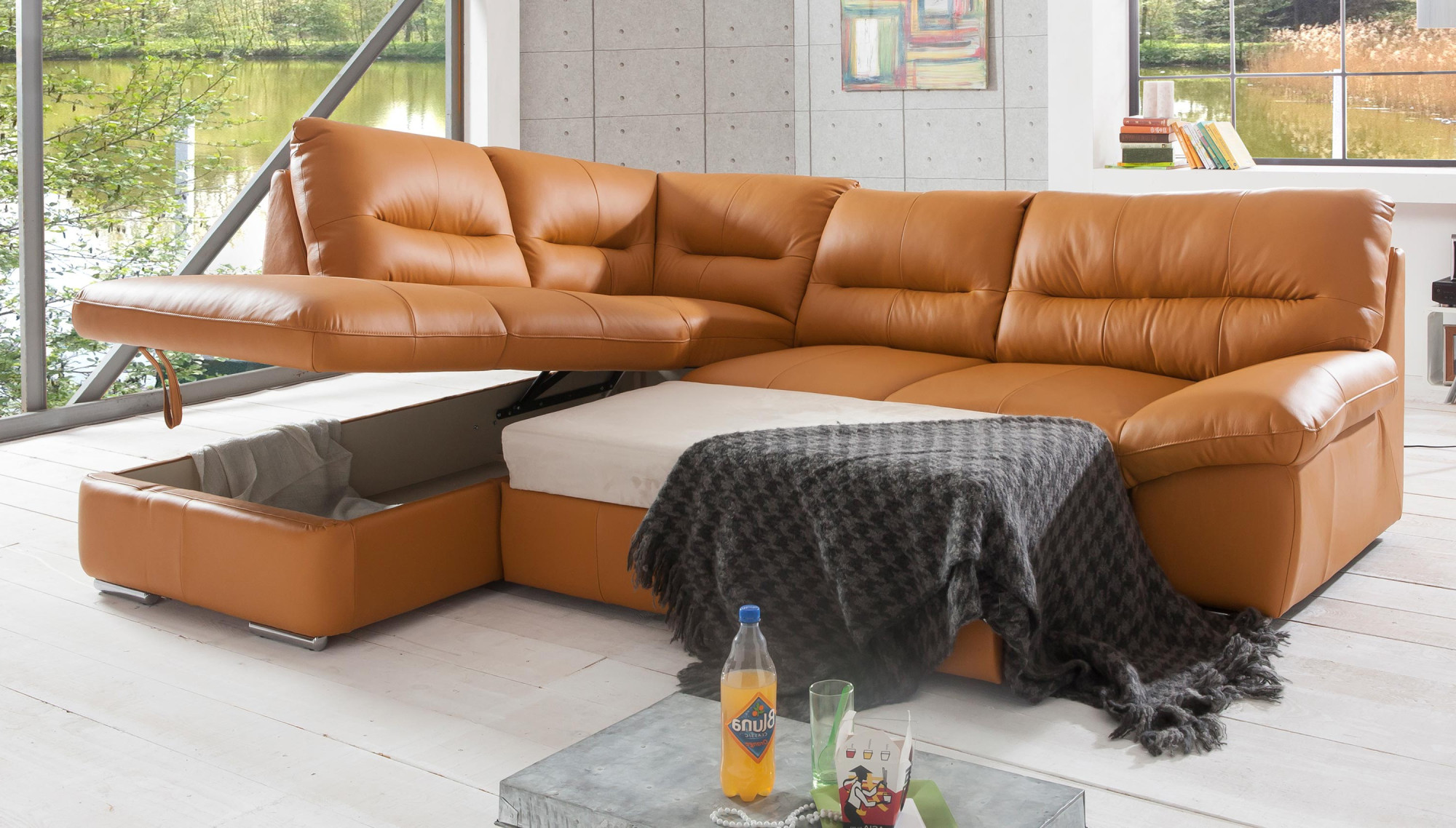 Wünschen Sie sich eine geräumige, bequeme und zugleich stilvolle Eckcouch aus echtem Leder? Das Modell William ist so konzipiert, dass es auch die höchsten Ansprüche erfüllt. Dank massivem Leder mit einer Dicke von 0,9–1,1 mm können Sie die angenehme Haptik des Materials genießen, das sich auch bei längerem Sitzen bewährt. Die Couch ist ausziehbar und bietet eine Liegefläche von 183 × 123 cm – ideal für gelegentliche Übernachtungsgäste oder entspannte Lesestunden. Der großzügige Stauraum, der unter dem gesamten Eckteil verborgen ist, ermöglicht es Ihnen, Bettwäsche oder andere Gegenstände leicht zu verstauen, die Sie stets griffbereit, aber außer Sichtweite haben möchten.