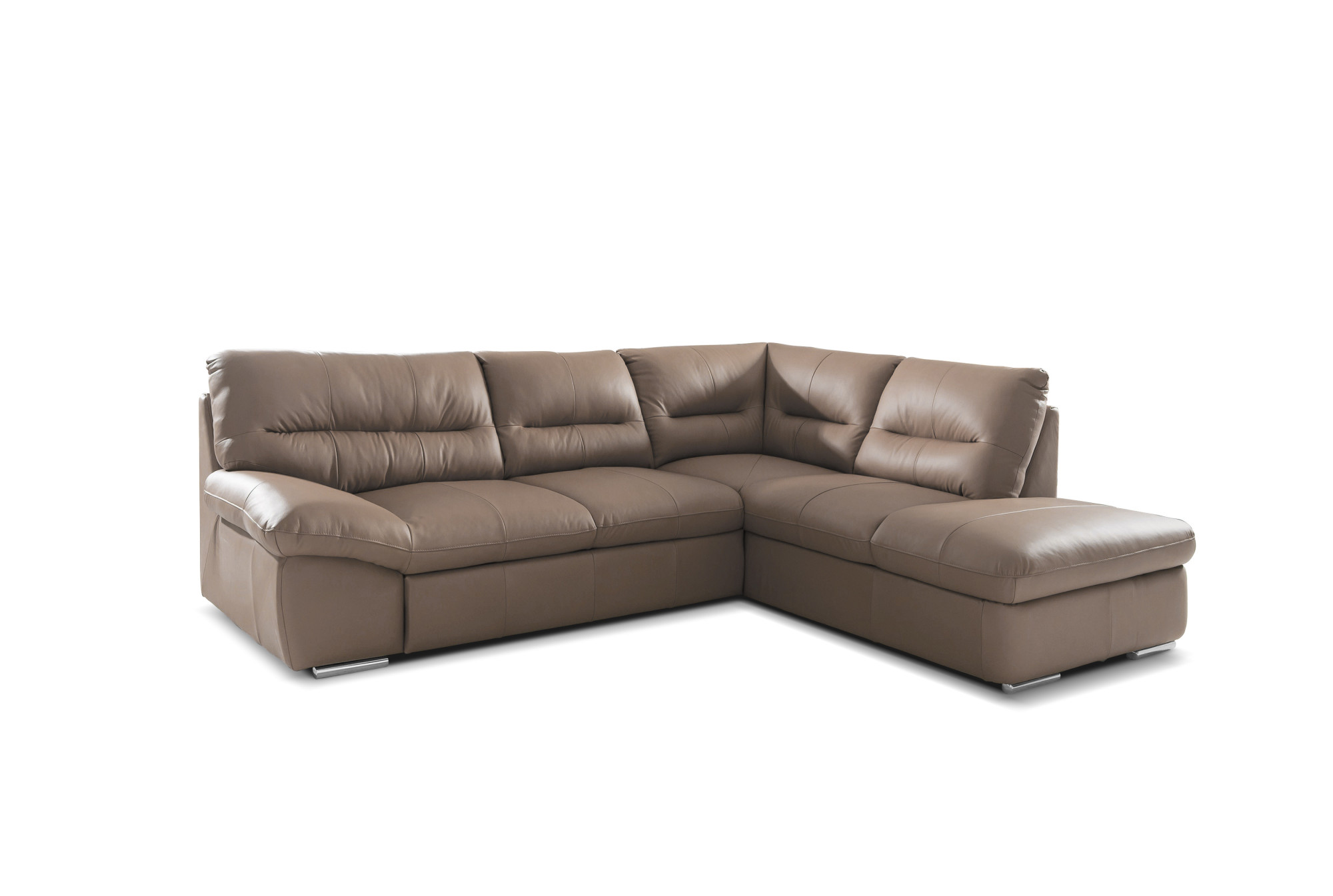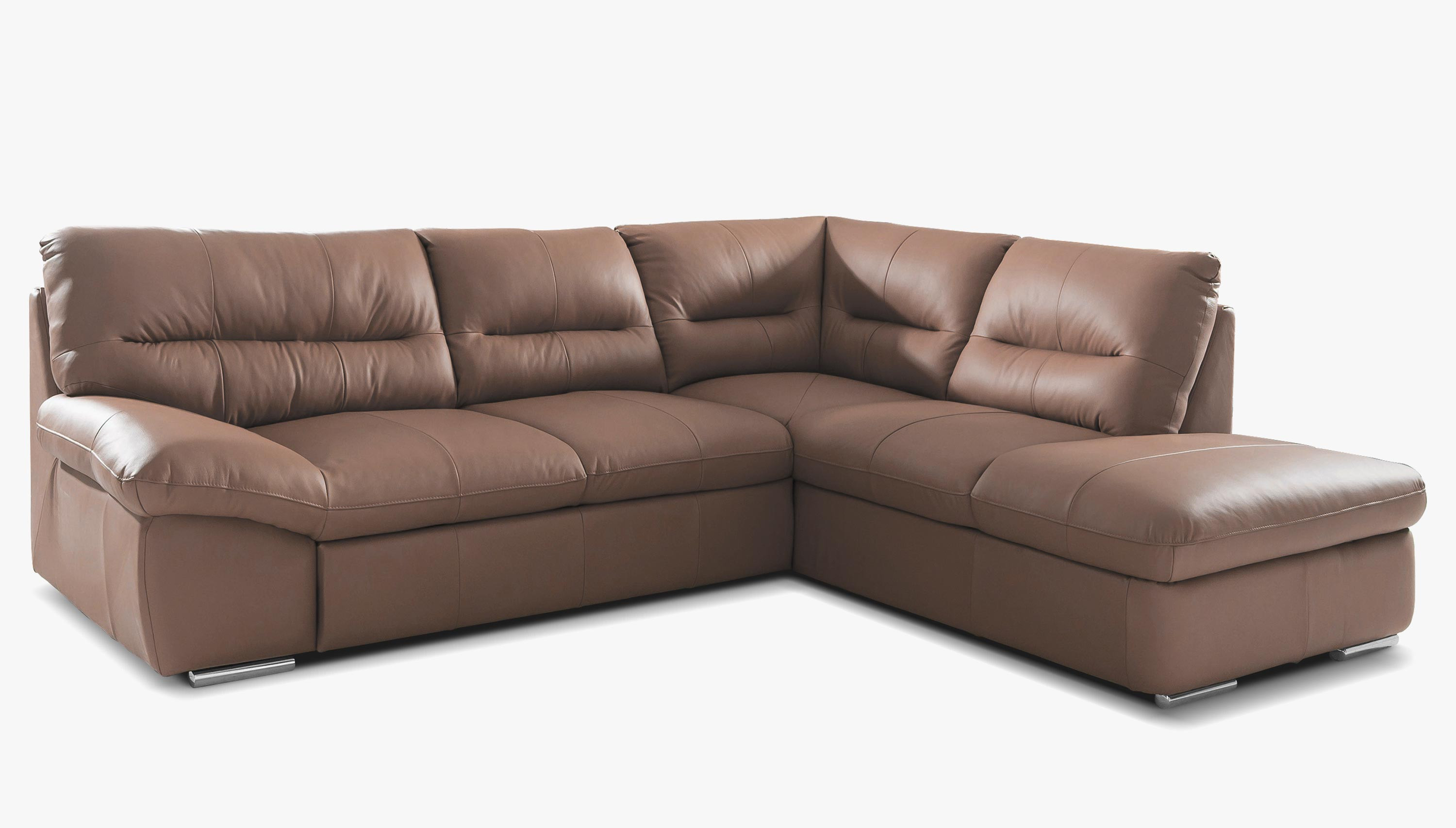 Wenn Sie jedoch eine andere Farbe oder sogar einen Stoff anstelle von Leder bevorzugen, ist eine Anfertigung in kundenspezifischer anderer Farbgebung kein Problem. Robuste metallene Füße mit einer Höhe von 4 cm verleihen dem Sofa nicht nur einen modernen Charakter, sondern erleichtern auch die Reinigung des Bereichs darunter. Sie können außerdem wählen, ob Sie die linke oder rechte Eckvariante bevorzugen, sodass das Sofa perfekt in Ihr Interieur passt.