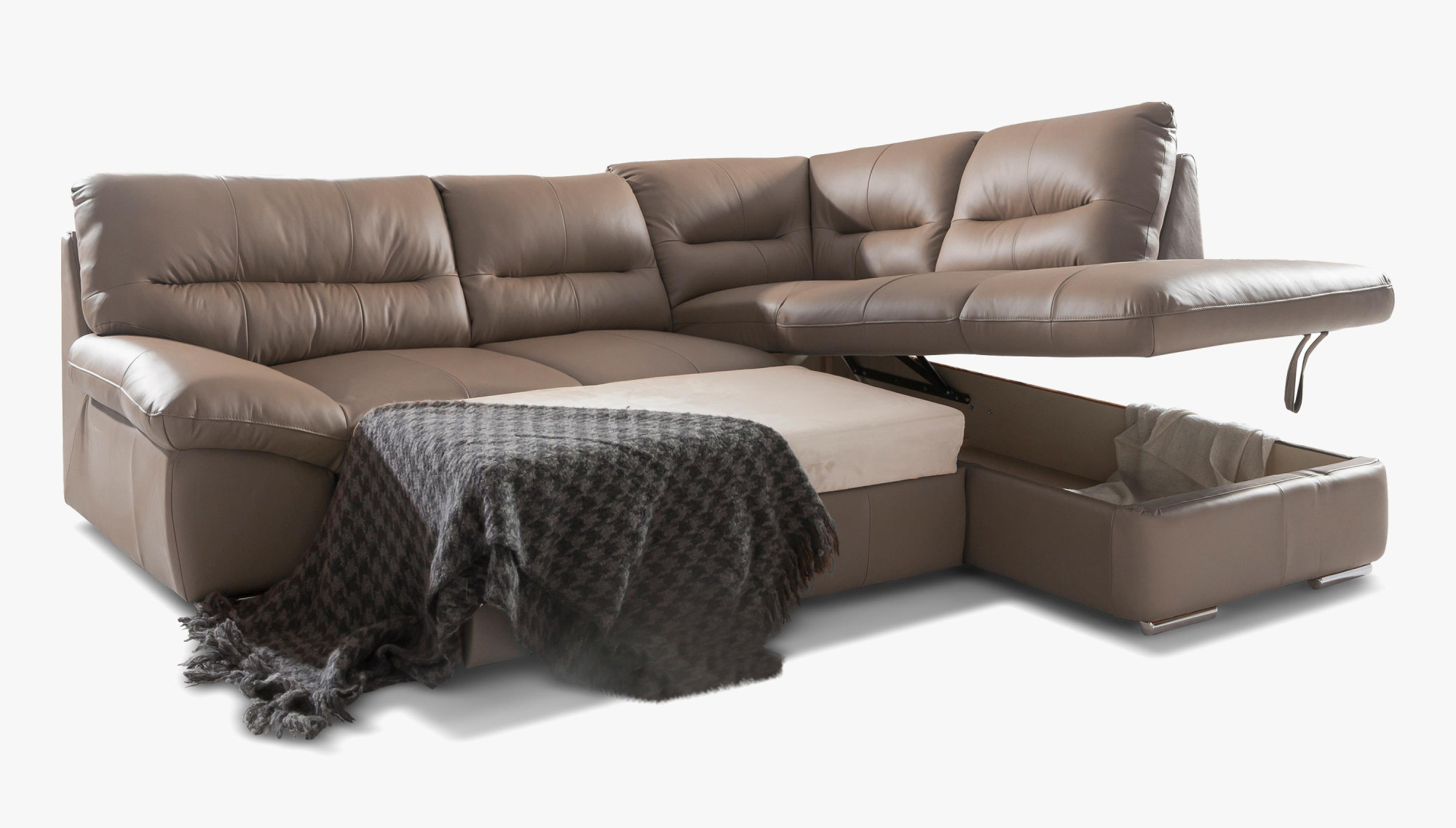 Sie wünschen sich ein geräumiges, bequemes und gleichzeitig stylisches Ecksofa aus echtem Leder? Das Modell William wurde so gestaltet, dass es auch die höchsten Ansprüche erfüllt. Dank massivem Leder mit einer Stärke von 0,9–1,1 mm können Sie die angenehme Materialhaptik genießen, die sich auch bei längerem Sitzen bewährt. Das Sofa ist ausziehbar und bietet eine Liegefläche von 183 × 123 cm – ideal für gelegentliche Übernachtung von Gästen oder entspannte Lesestunden. Der großzügige Stauraum, der unter der gesamten Eckpartie verborgen ist, ermöglicht es Ihnen, Bettwäsche oder andere Gegenstände einfach zu verstauen, die Sie stets griffbereit, aber außer Sichtweite haben möchten.
