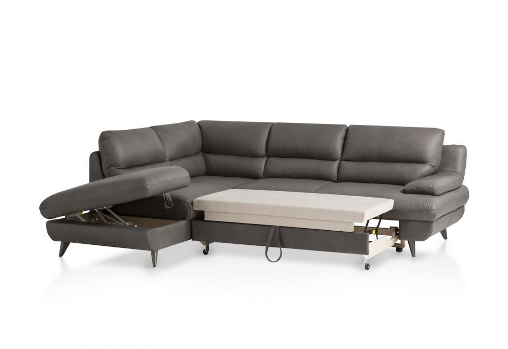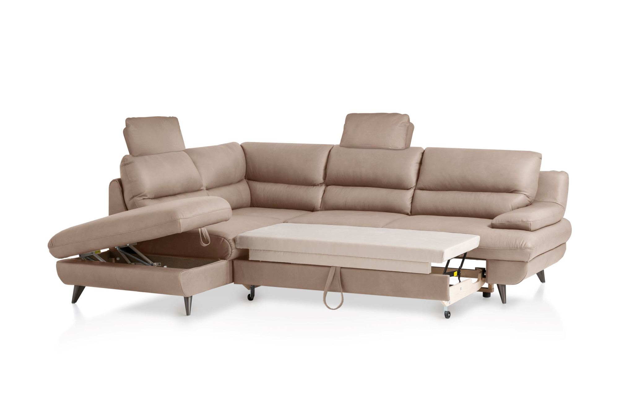 Der Rahmen besteht aus massivem Hartholz und Kiefer, was Stabilität und lange Lebensdauer garantiert. Der Sitzbereich ist mit Stahlwellenfedern und hochwertigem HR-Schaum mit unterschiedlicher Dichte ausgestattet, sodass er optimale Unterstützung und gleichzeitig Weichheit bietet. Die Rückseite des Sofas ist mit statischen Gurten und Polsterkarton versehen, was zu Komfort und Robustheit beiträgt. Neben dem Komfort freut auch die Ausklappfunktion und der Stauraum, der sich hervorragend zur Aufbewahrung von Bettwäsche oder anderen Zubehörteilen eignet.