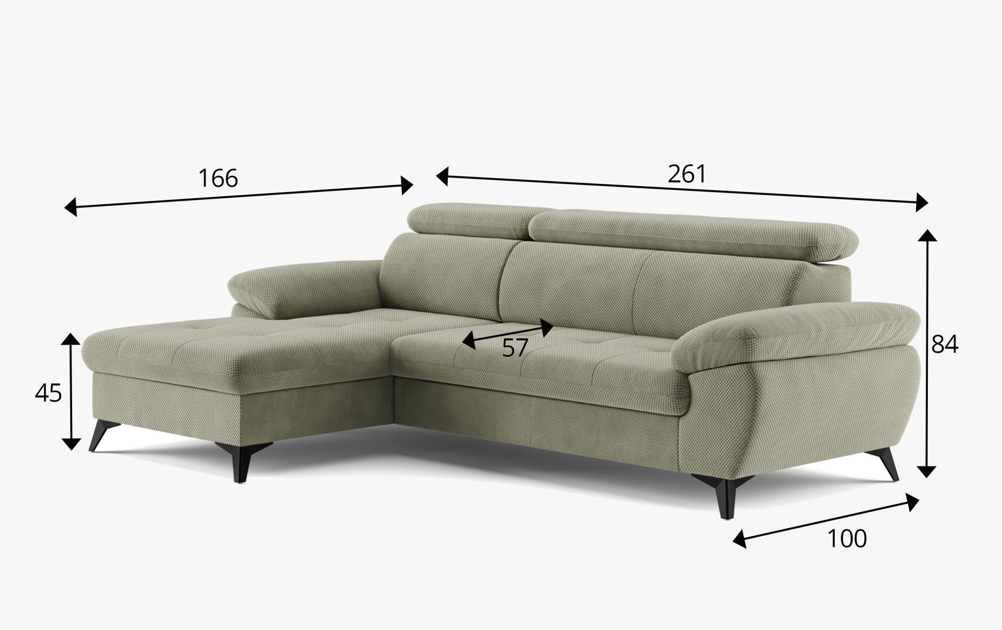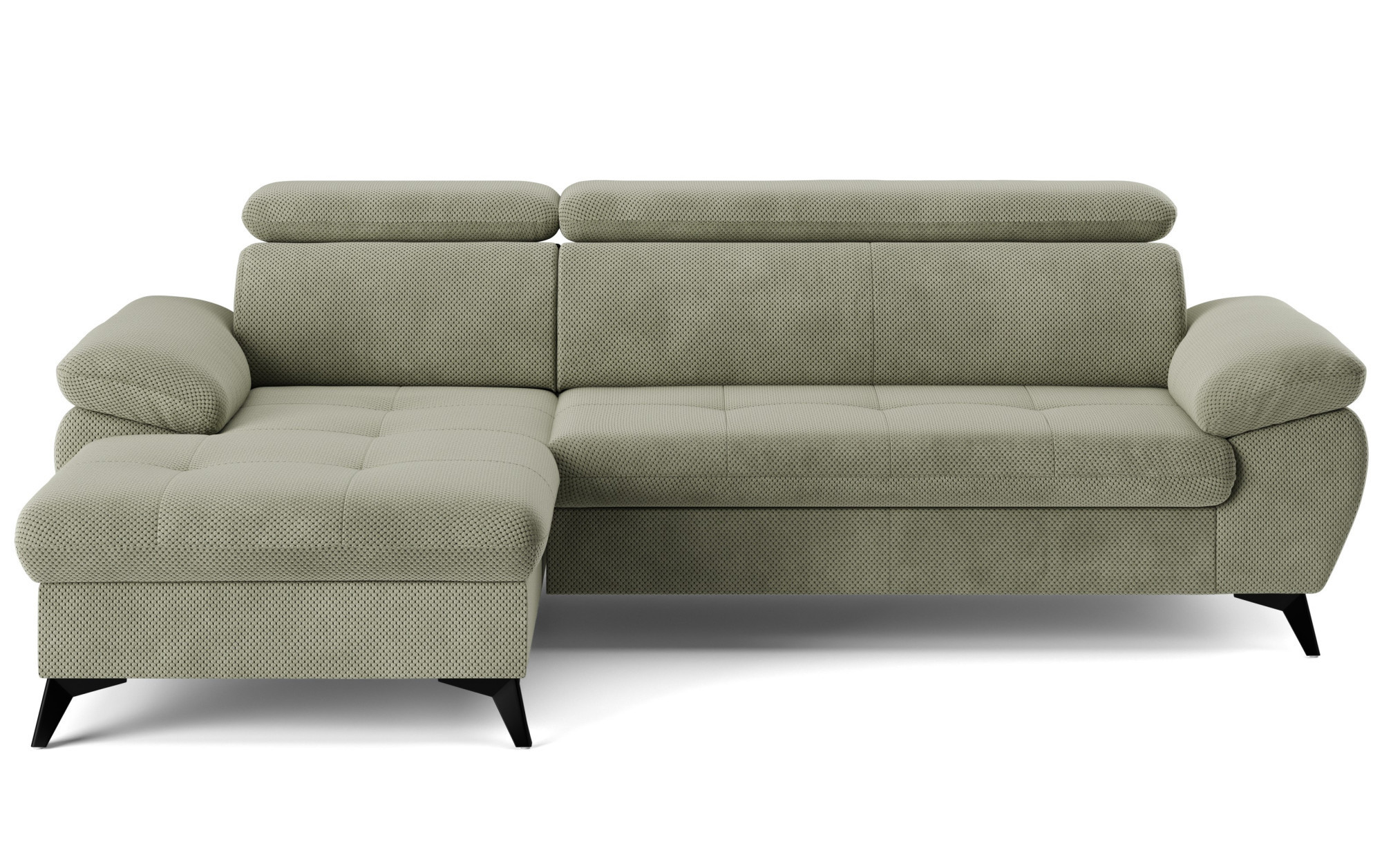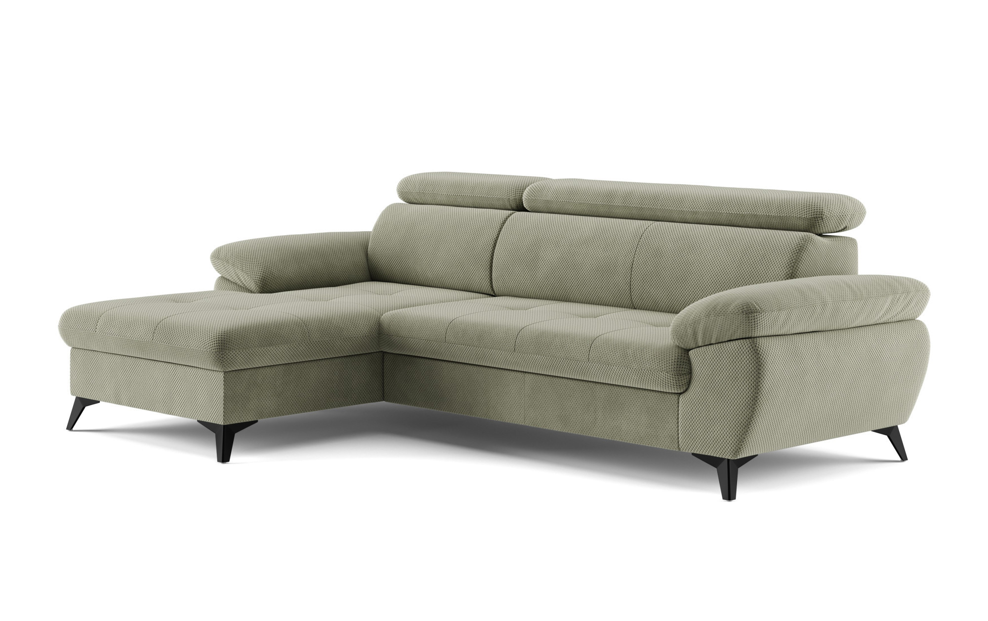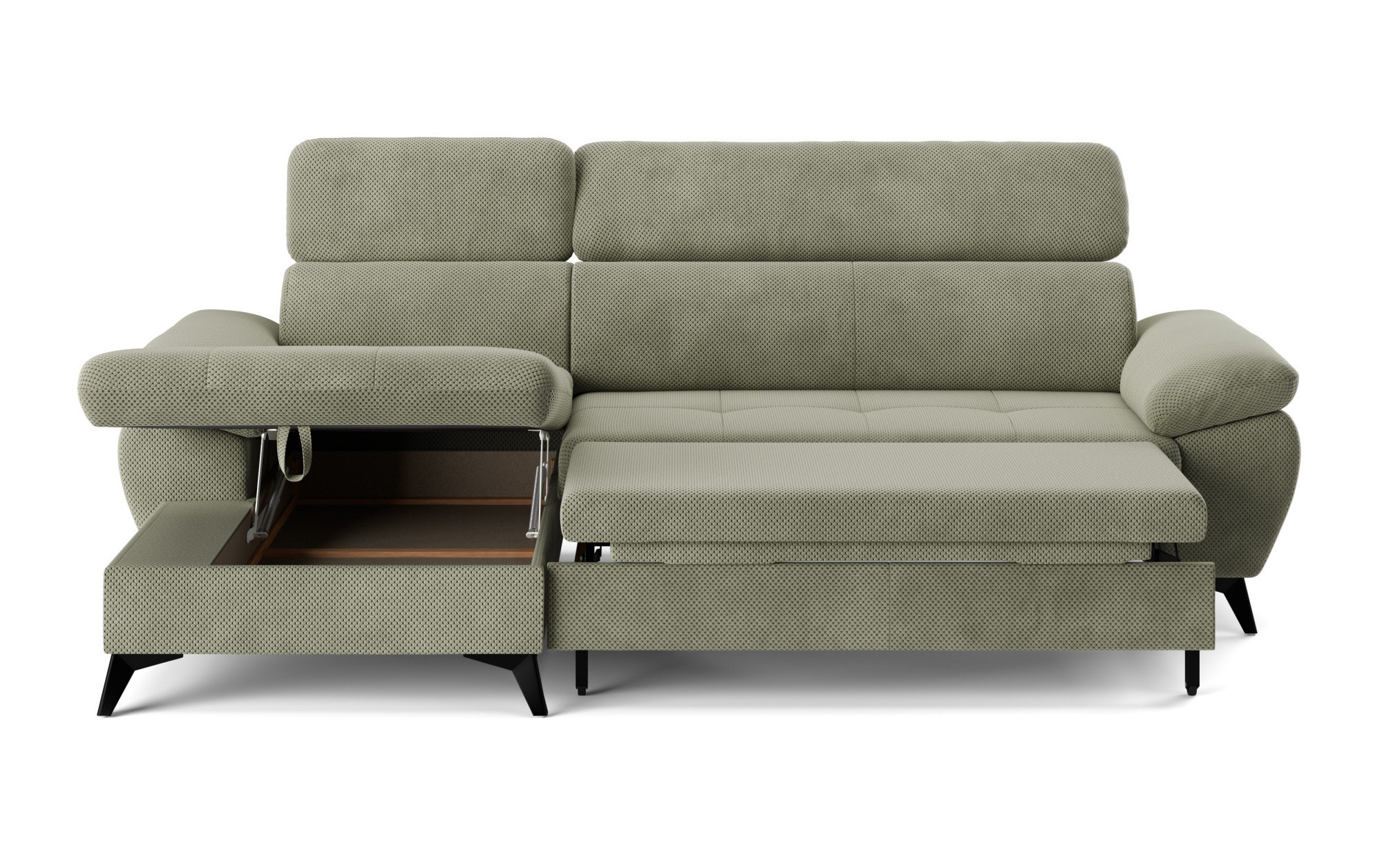 Im Lieferumfang dieser Eckgarnitur ist auch die Schlafgelegenheit enthalten, die Sie bei Besuch von Gästen oder wenn Sie schnell eine komfortable Ruhezone schaffen möchten, zu schätzen wissen. Für noch mehr Bequemlichkeit besteht die Sitzfläche aus Schaumstoff verschiedener Dichten und stahlgewellten Federn, was ein Gleichgewicht zwischen Weichheit und stabiler Unterstützung gewährleistet. Dank der höheren Metallfüße ist die Reinigung unter dem Sofa nicht aufwendig, und außerdem wirkt das Möbelstück insgesamt leicht und luftig.