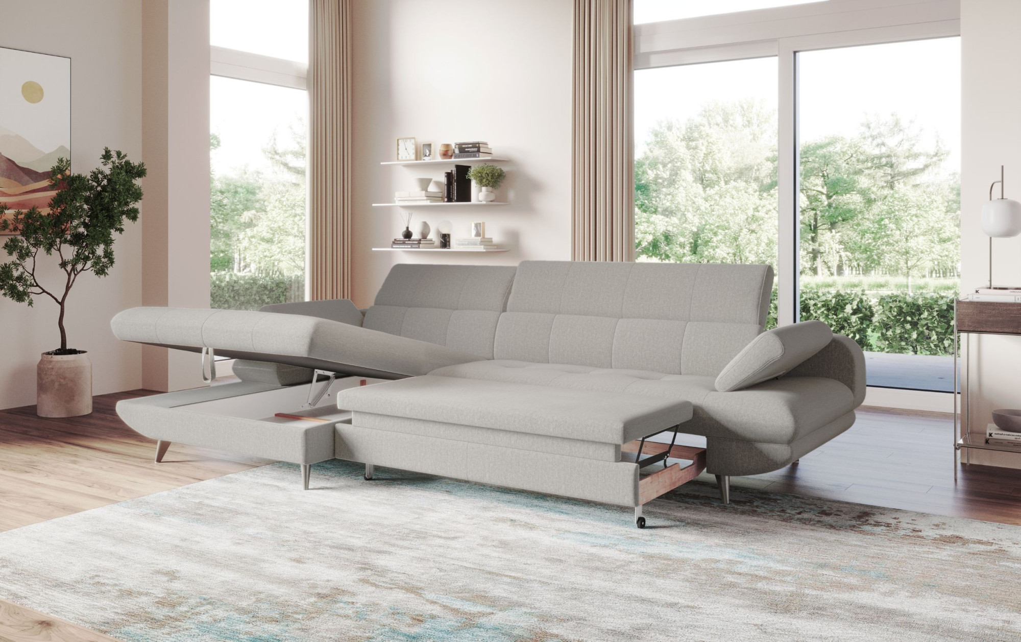 Modernes Ecksofa mit Ausziehfunktion und Stauraum, linke