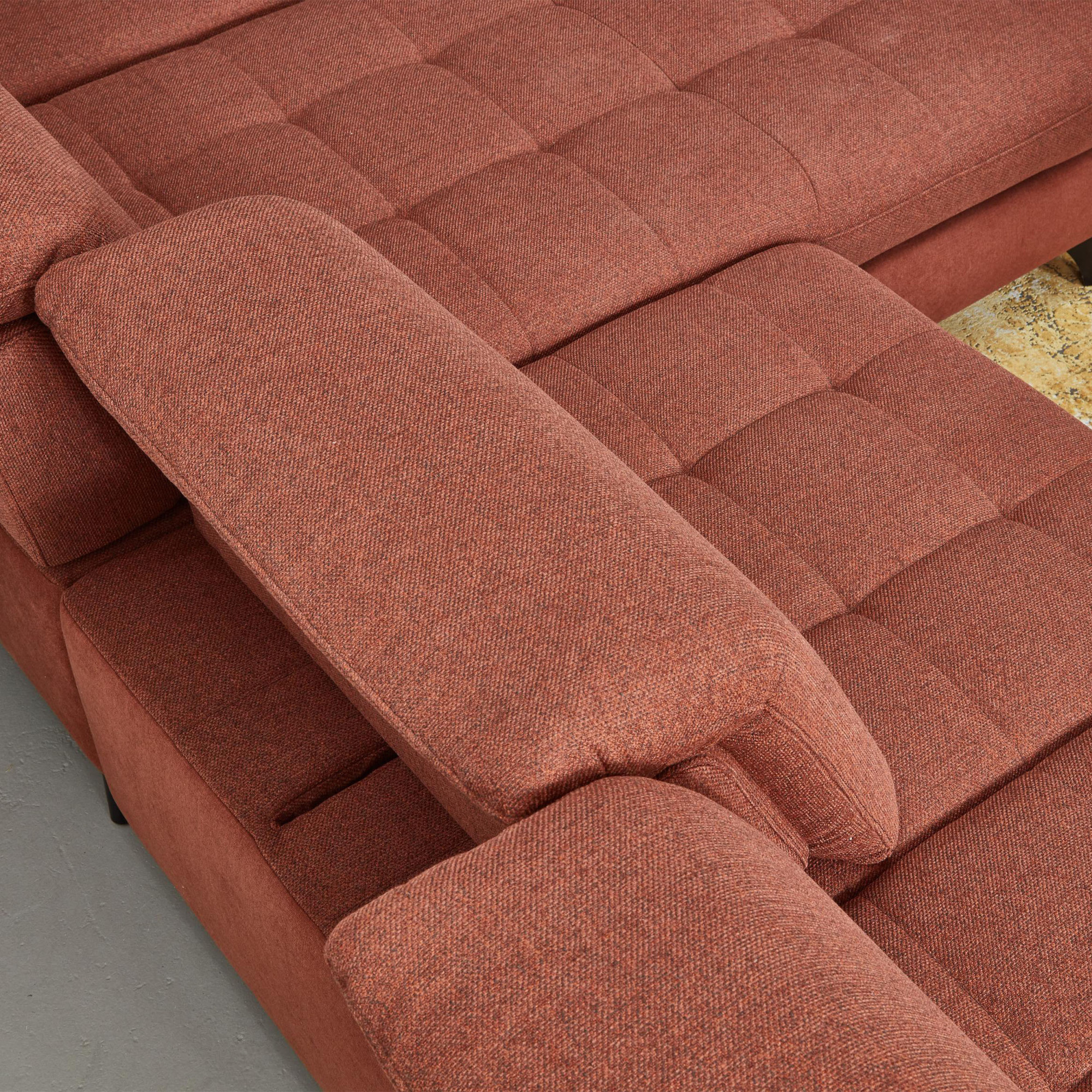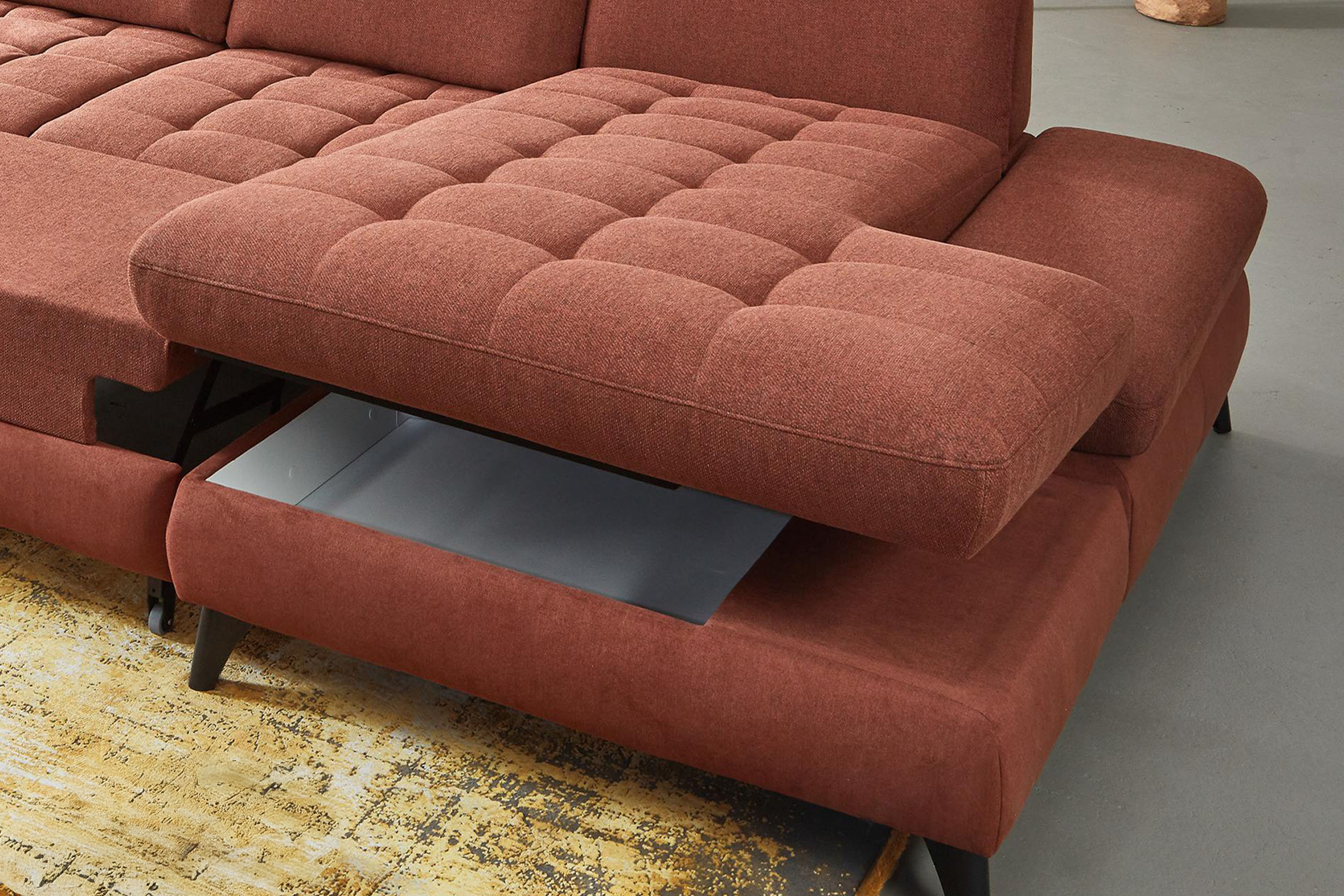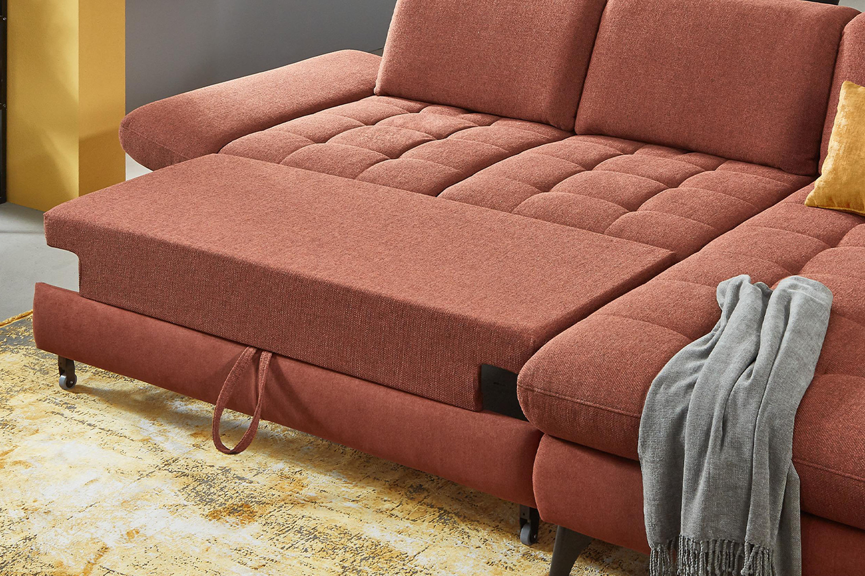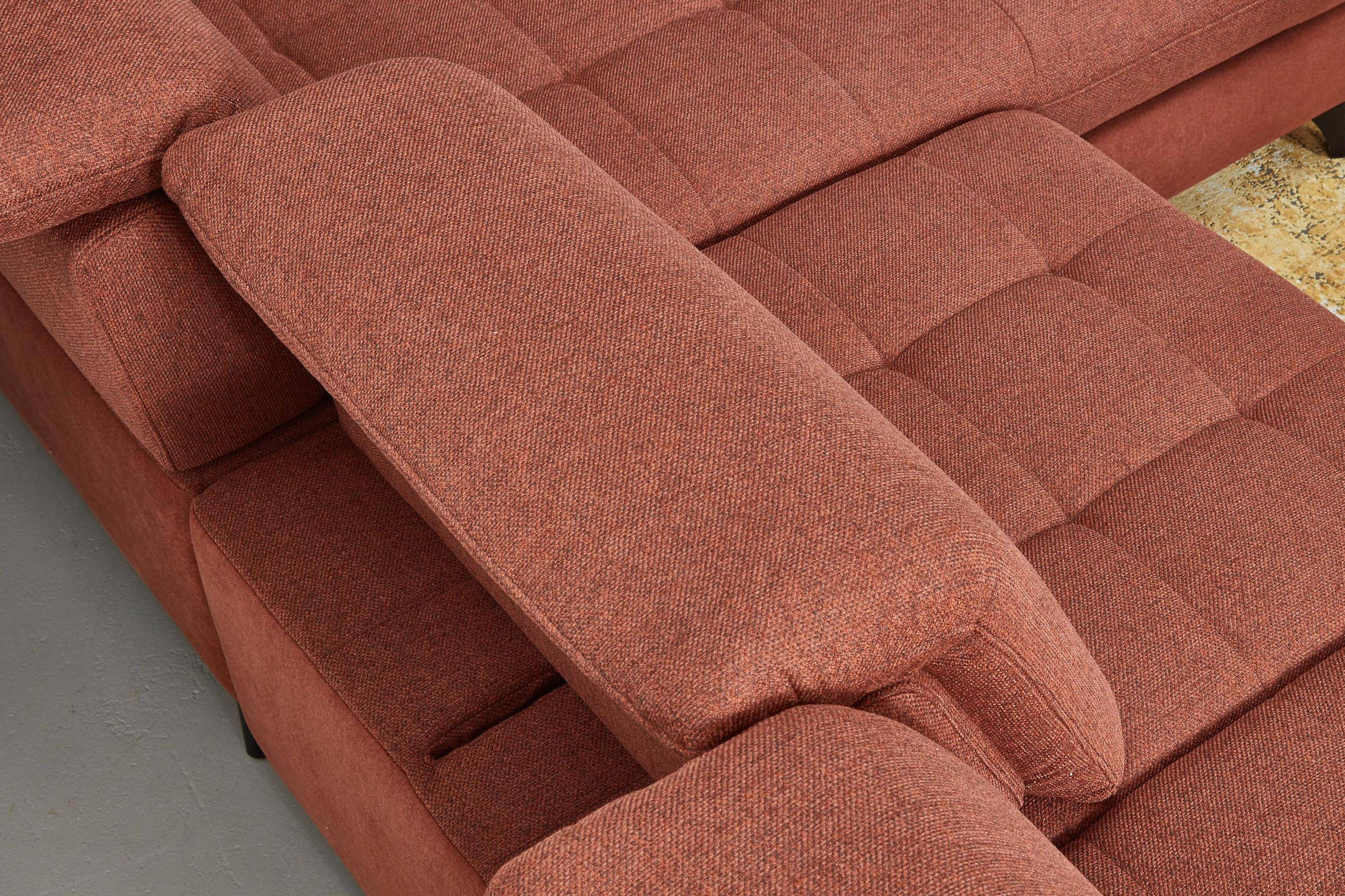 * Auf dem Foto ist ein Sofa mit Schlaf- und Stauraumfunktion, die Modellbezeichnung ist 2100_68.BETT.E 8142_68_BK, Rückenlehnen-Typ B, Füße Typ 1 matt schwarz, im Stoff Paris kupfer.