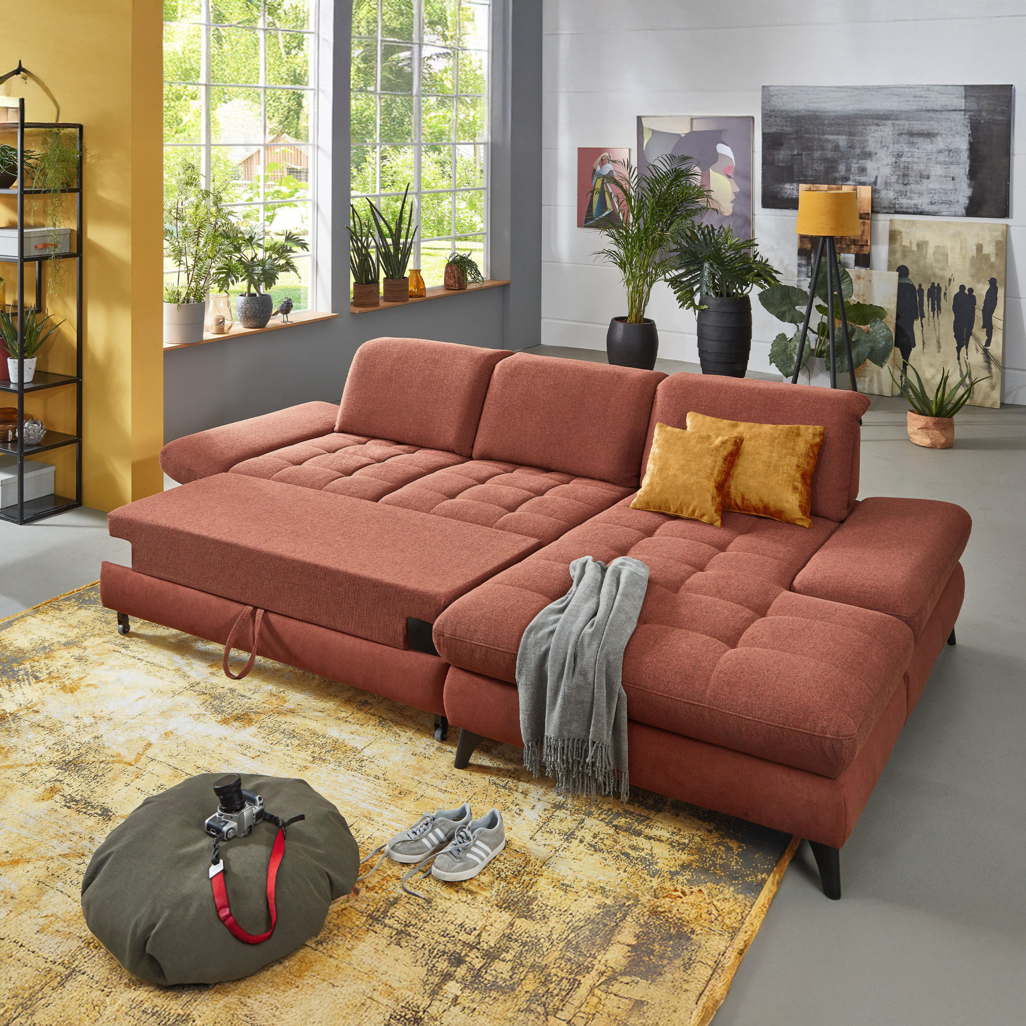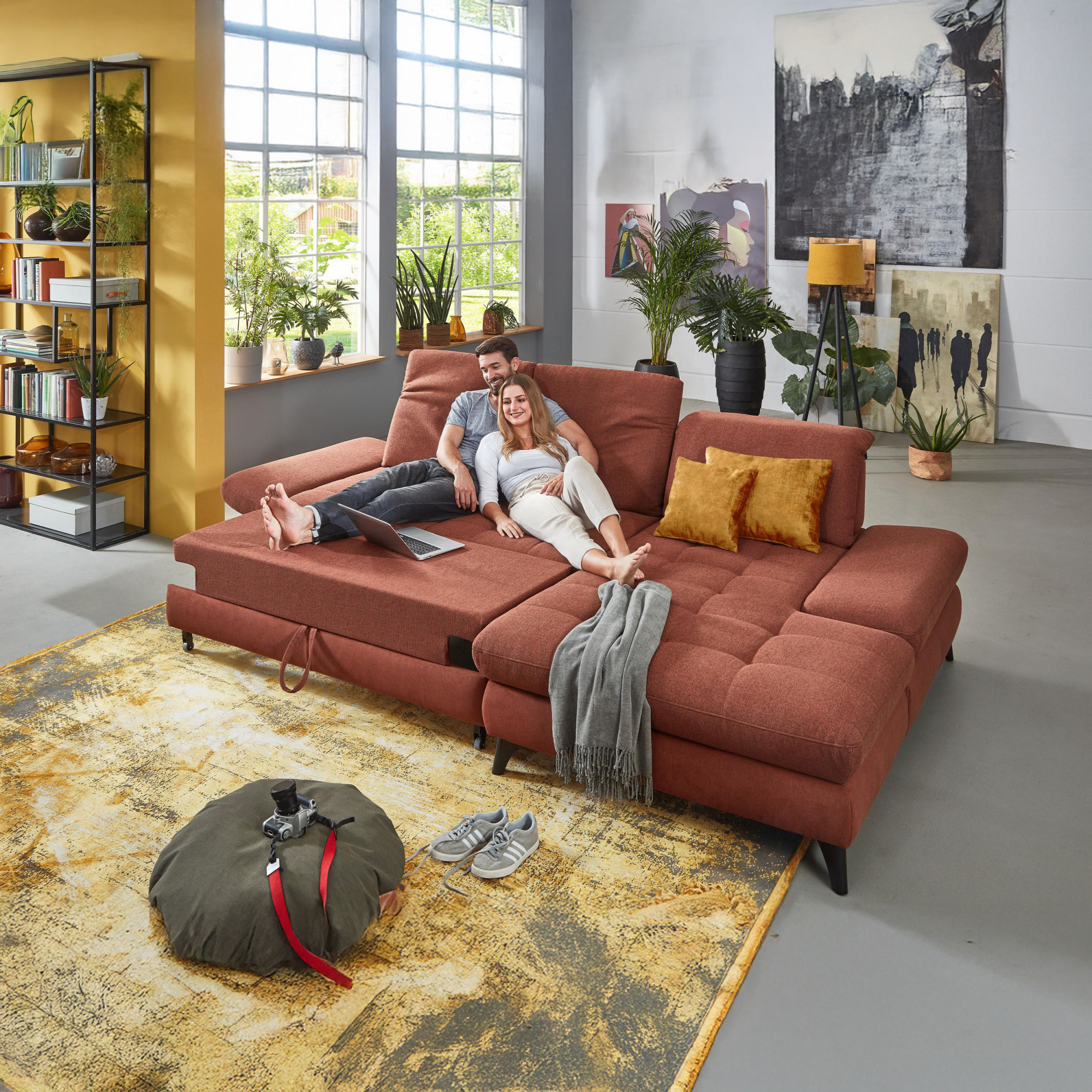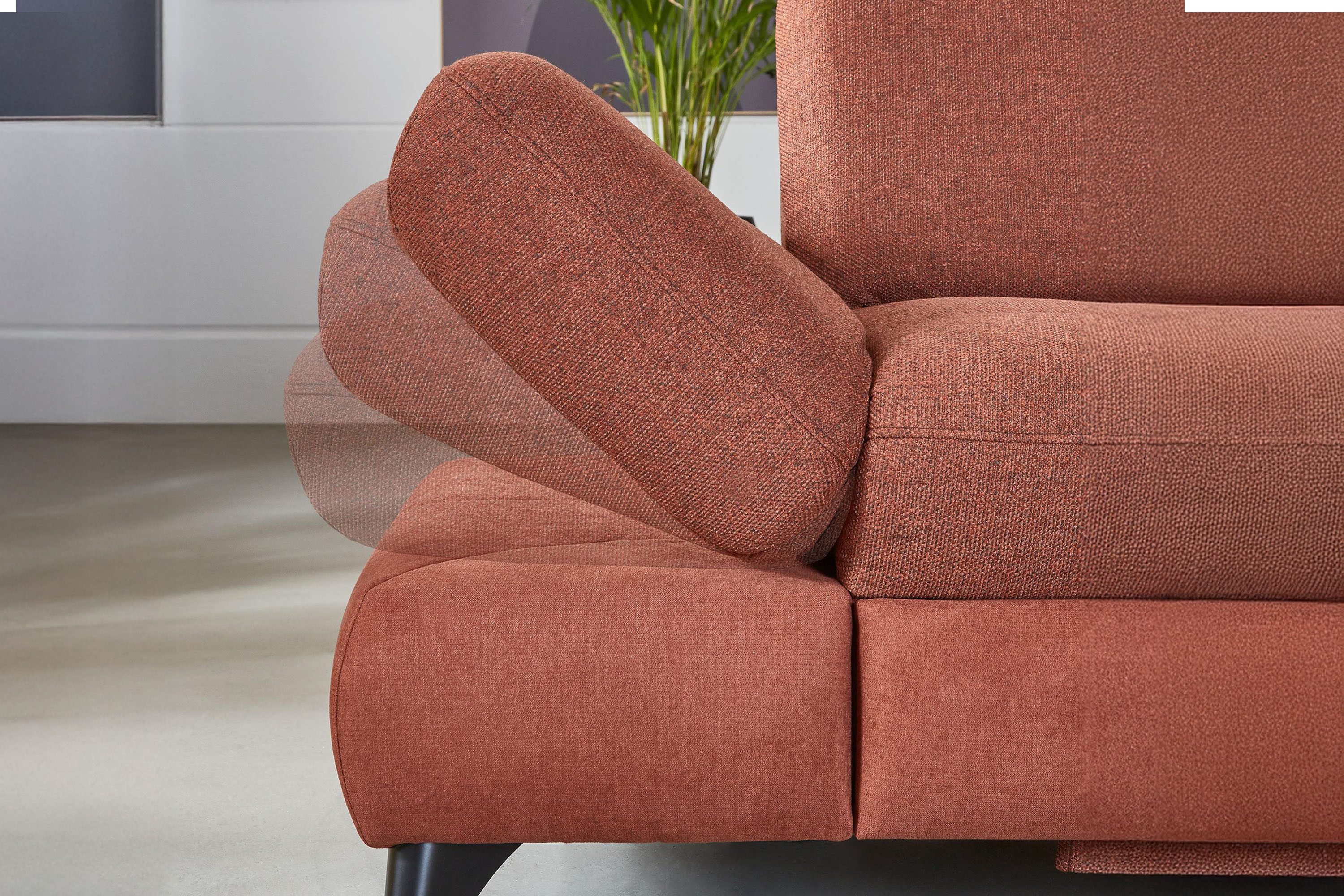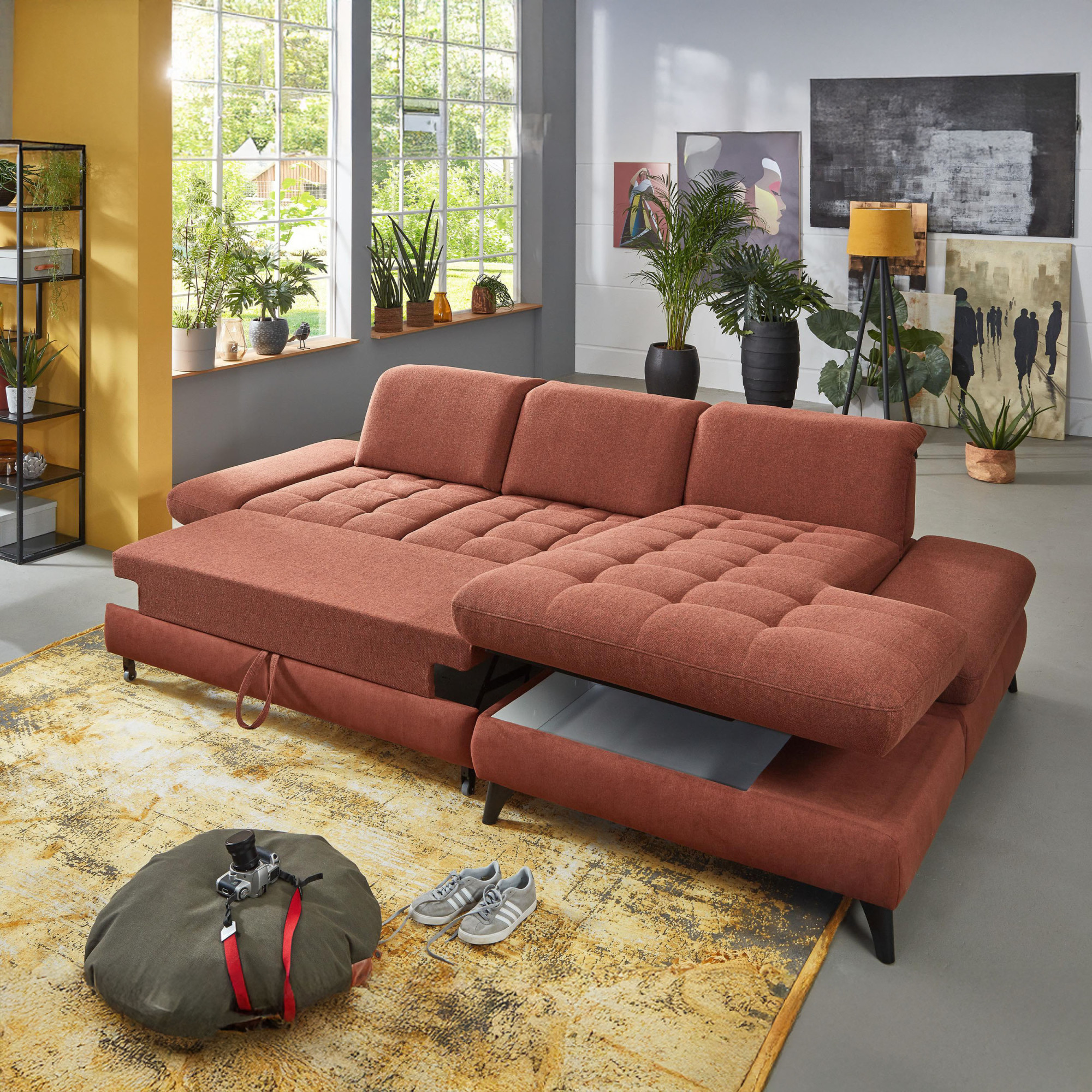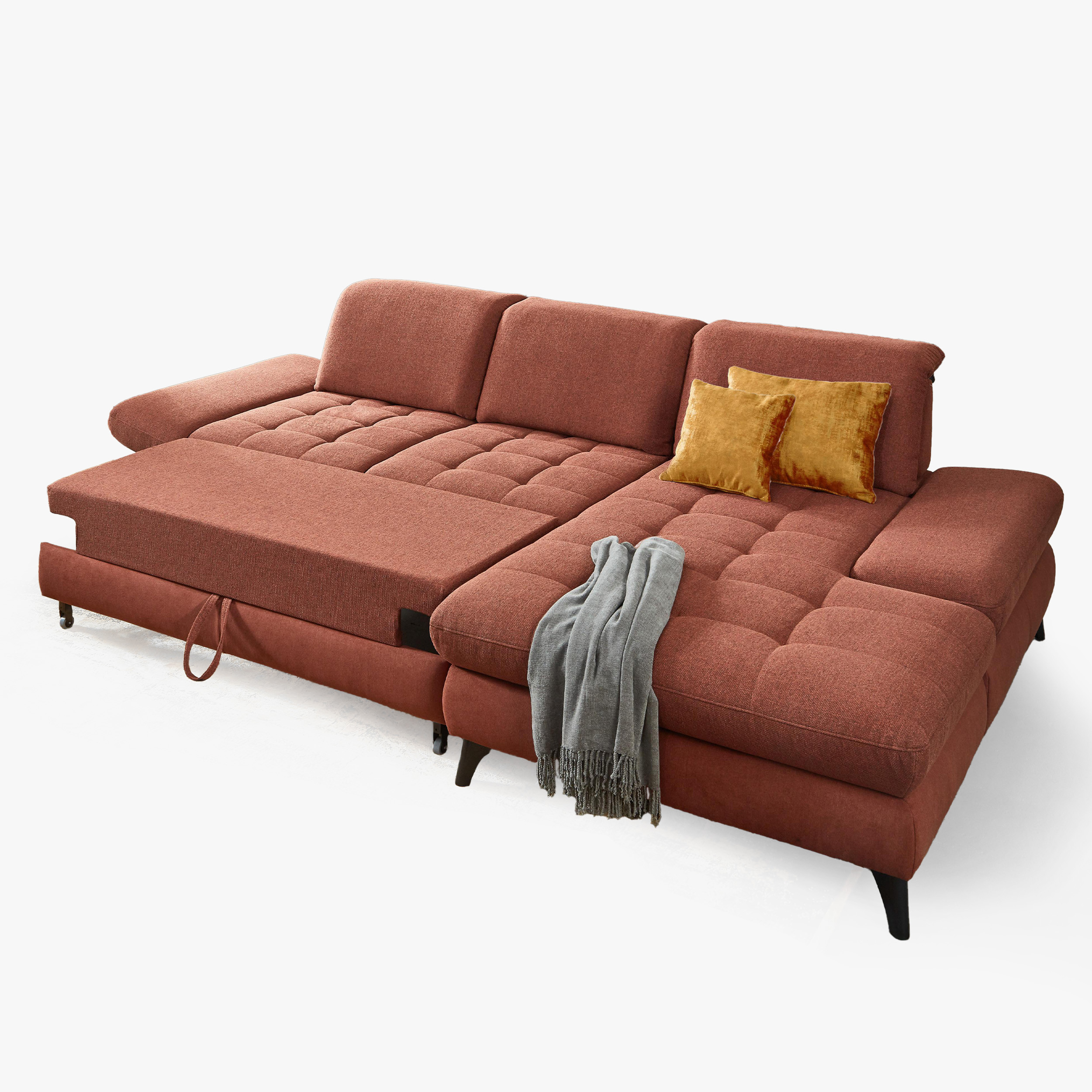 * Auf dem Foto ist ein Sofa mit Schlaf- und Stauraumfunktion, die Modellbezeichnung ist 2100_68.BETT.E 8142_68_BK, Rückenlehnen-Typ B, Füße Typ 1 matt schwarz, im Stoff Paris kupfer.