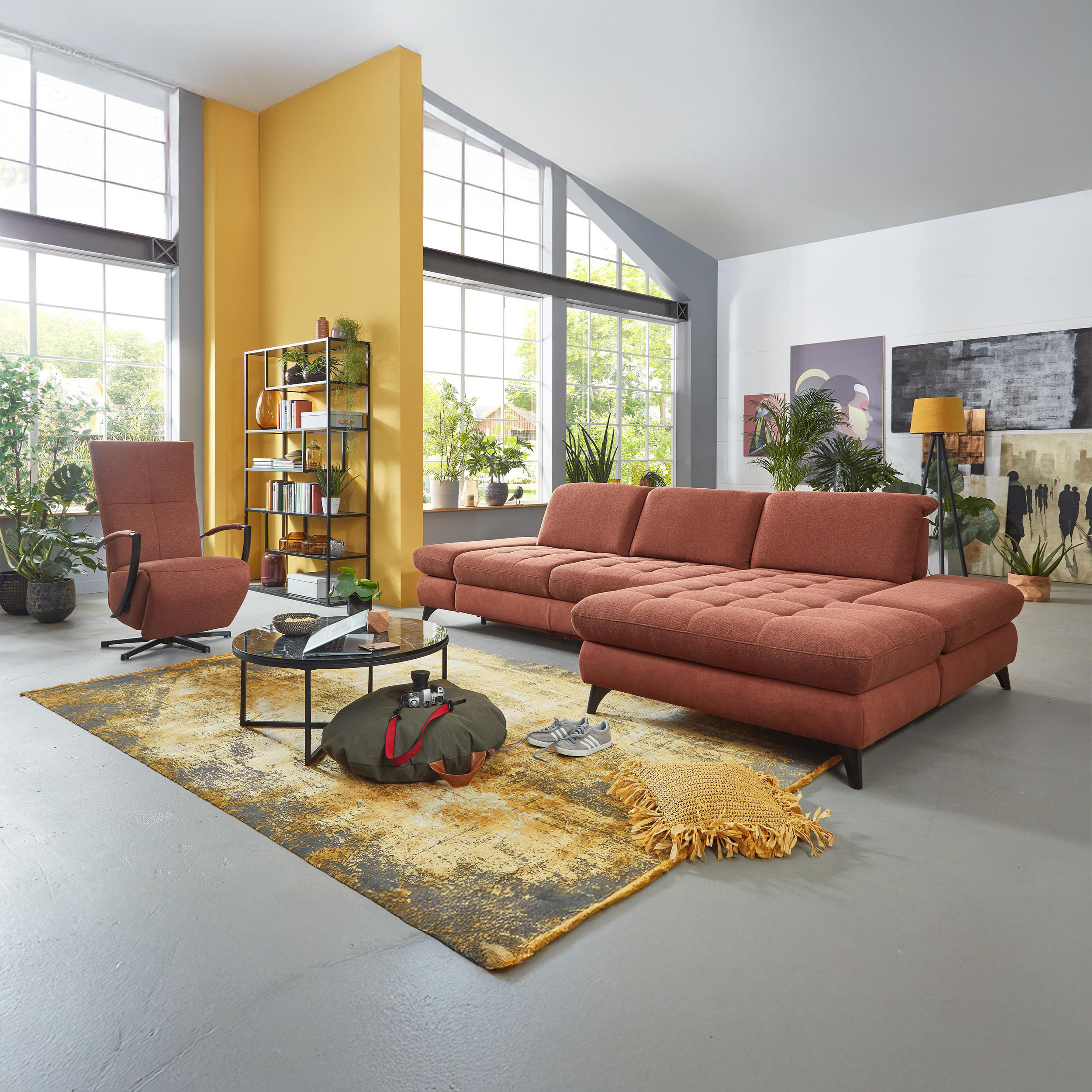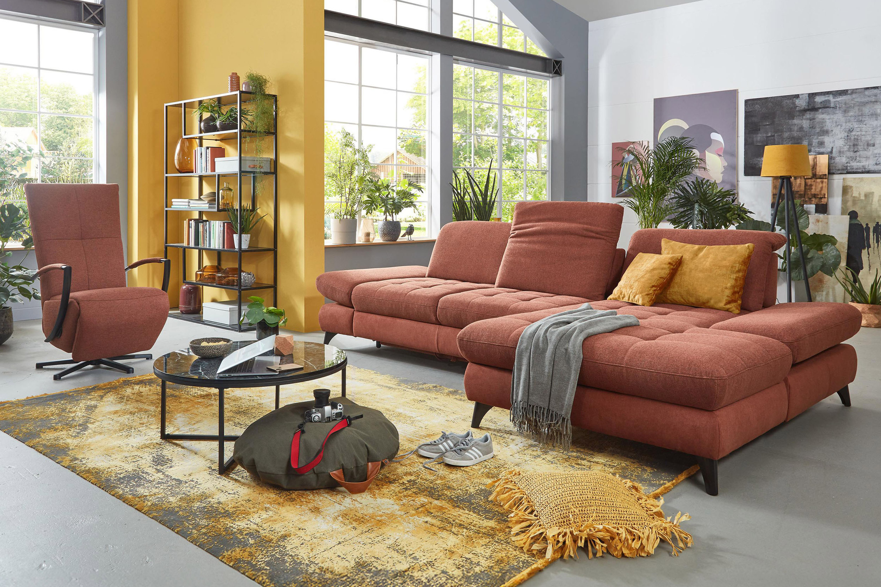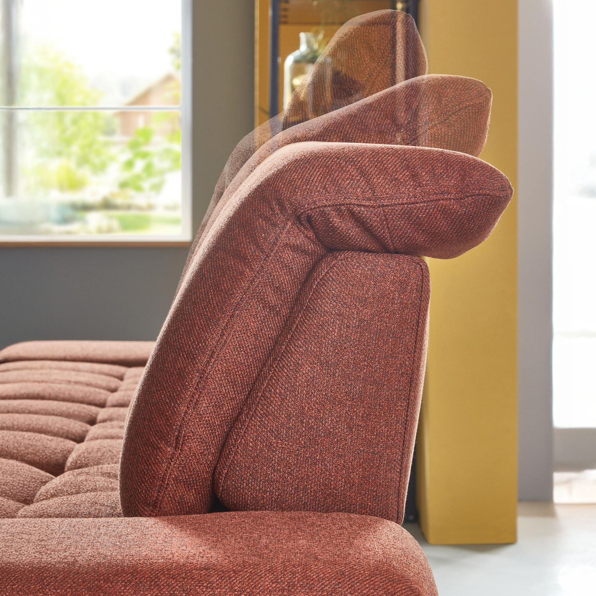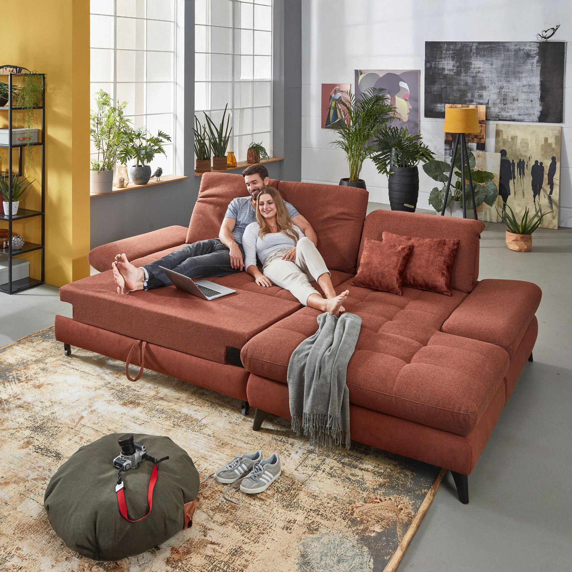 * Auf dem Foto ist ein Sofa mit Schlaf- und Stauraumfunktion, die Modellbezeichnung ist 2100_68.BETT.E 8142_68_BK, Rückenlehnen-Typ B, Füße Typ 1 matt schwarz, im Stoff Paris kupfer.