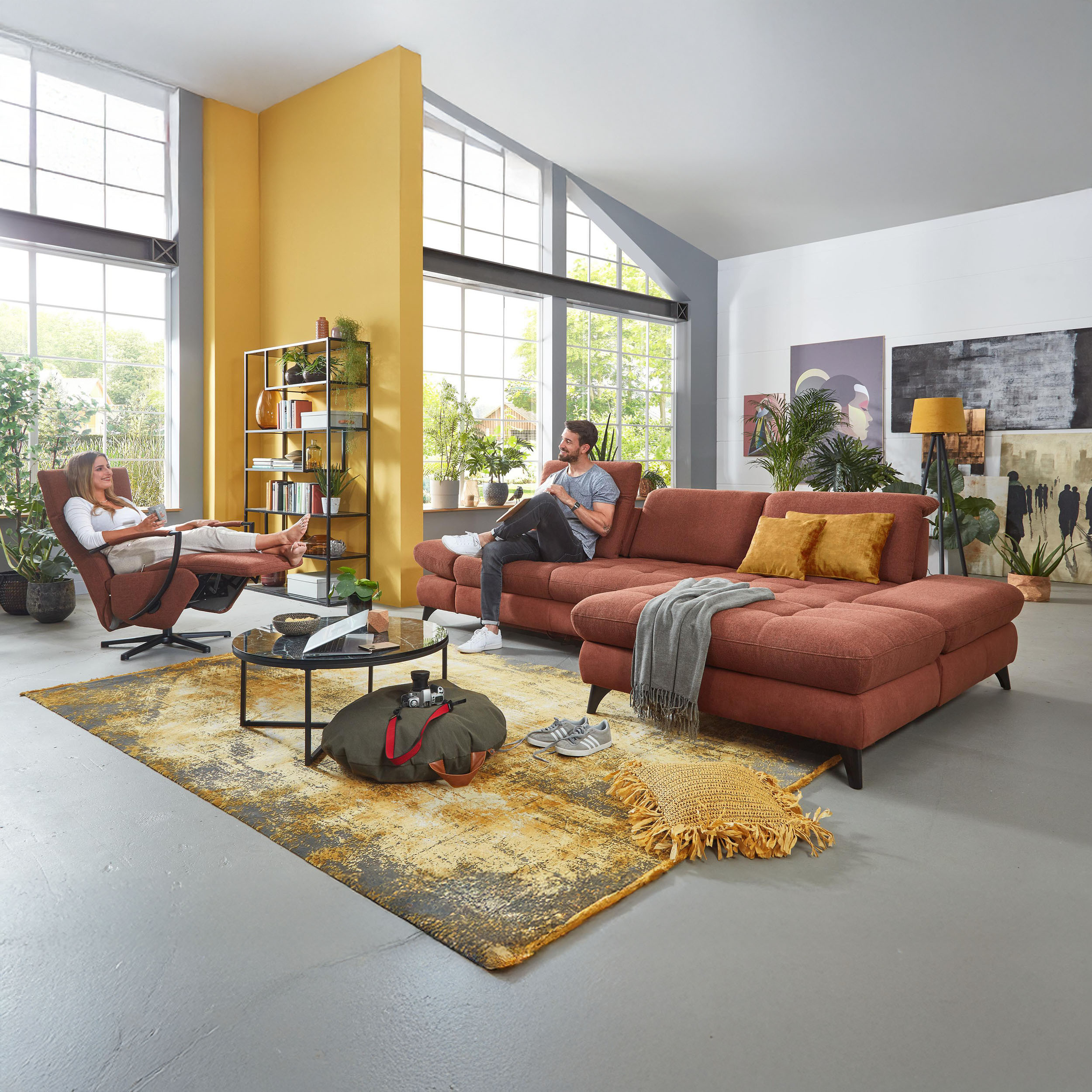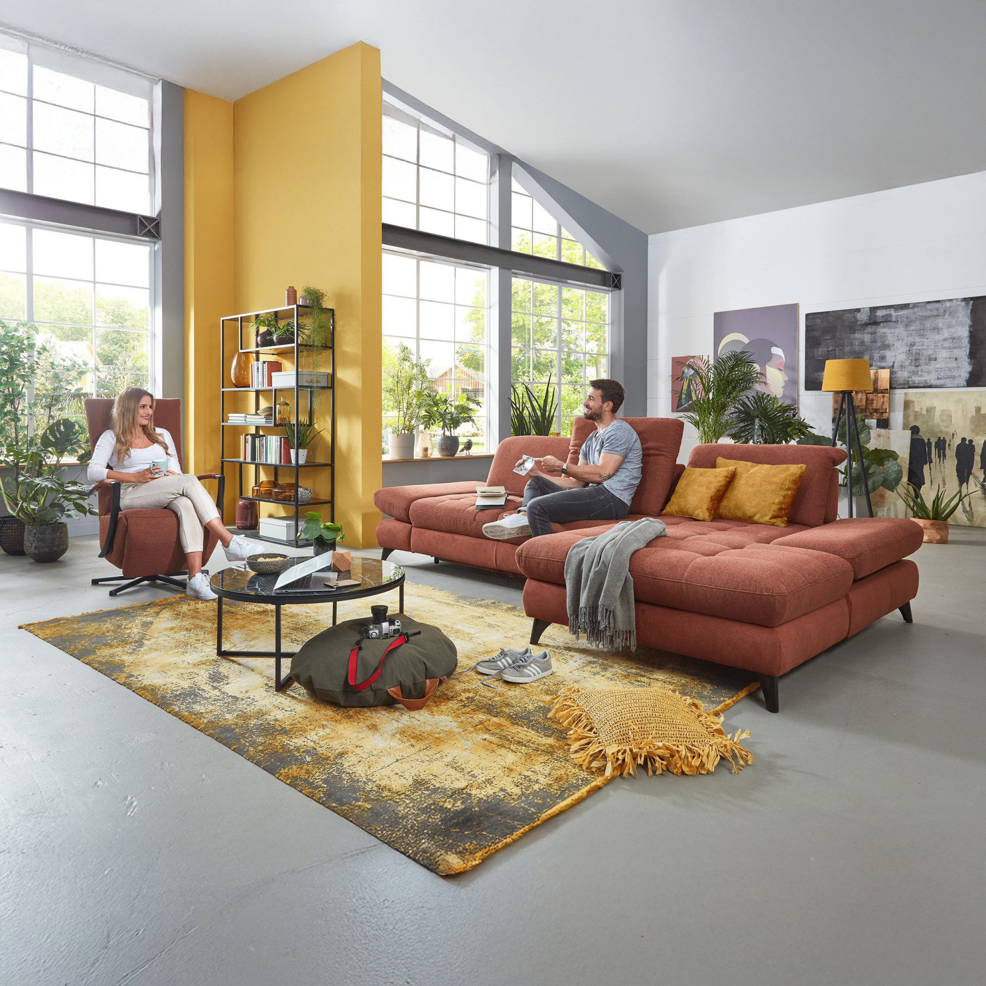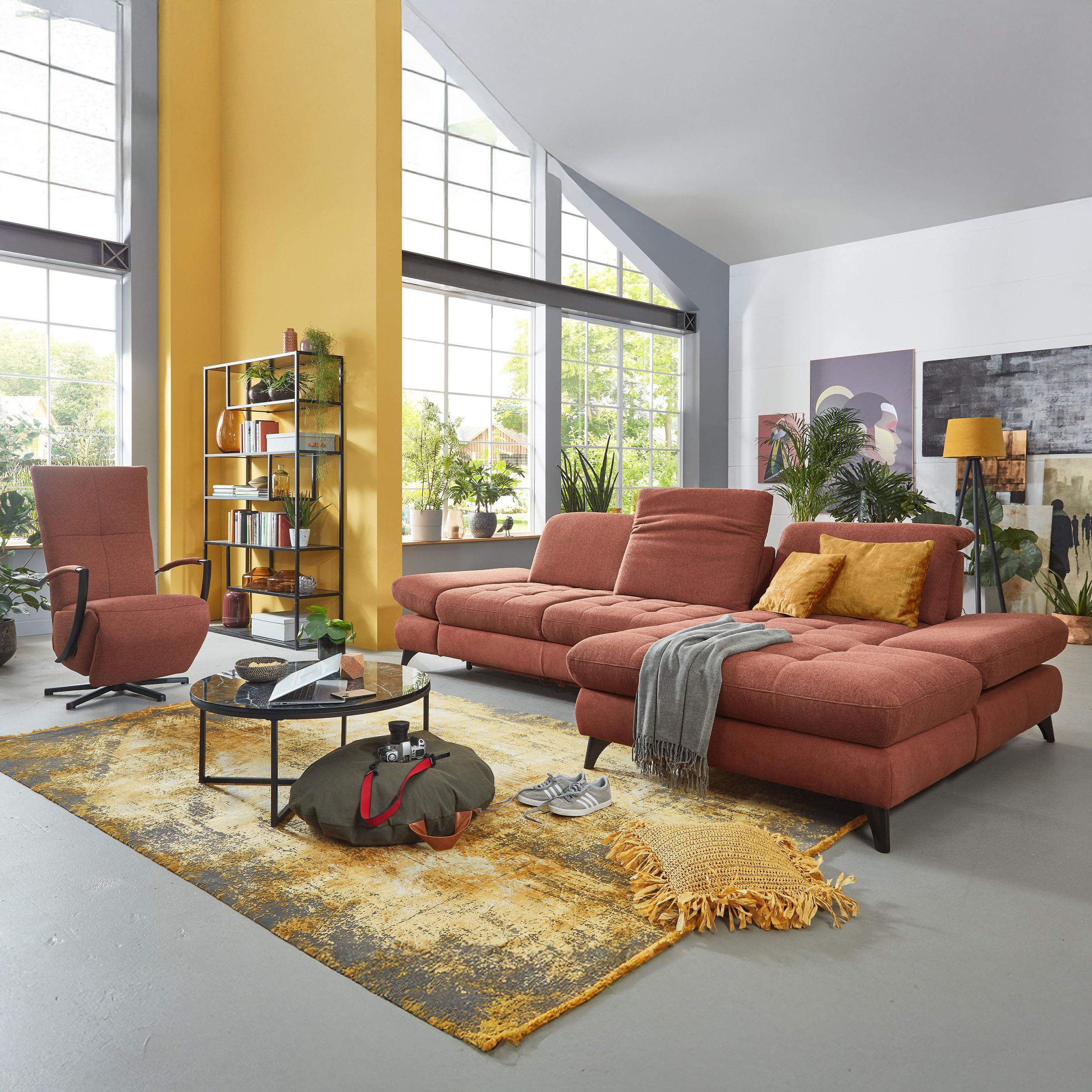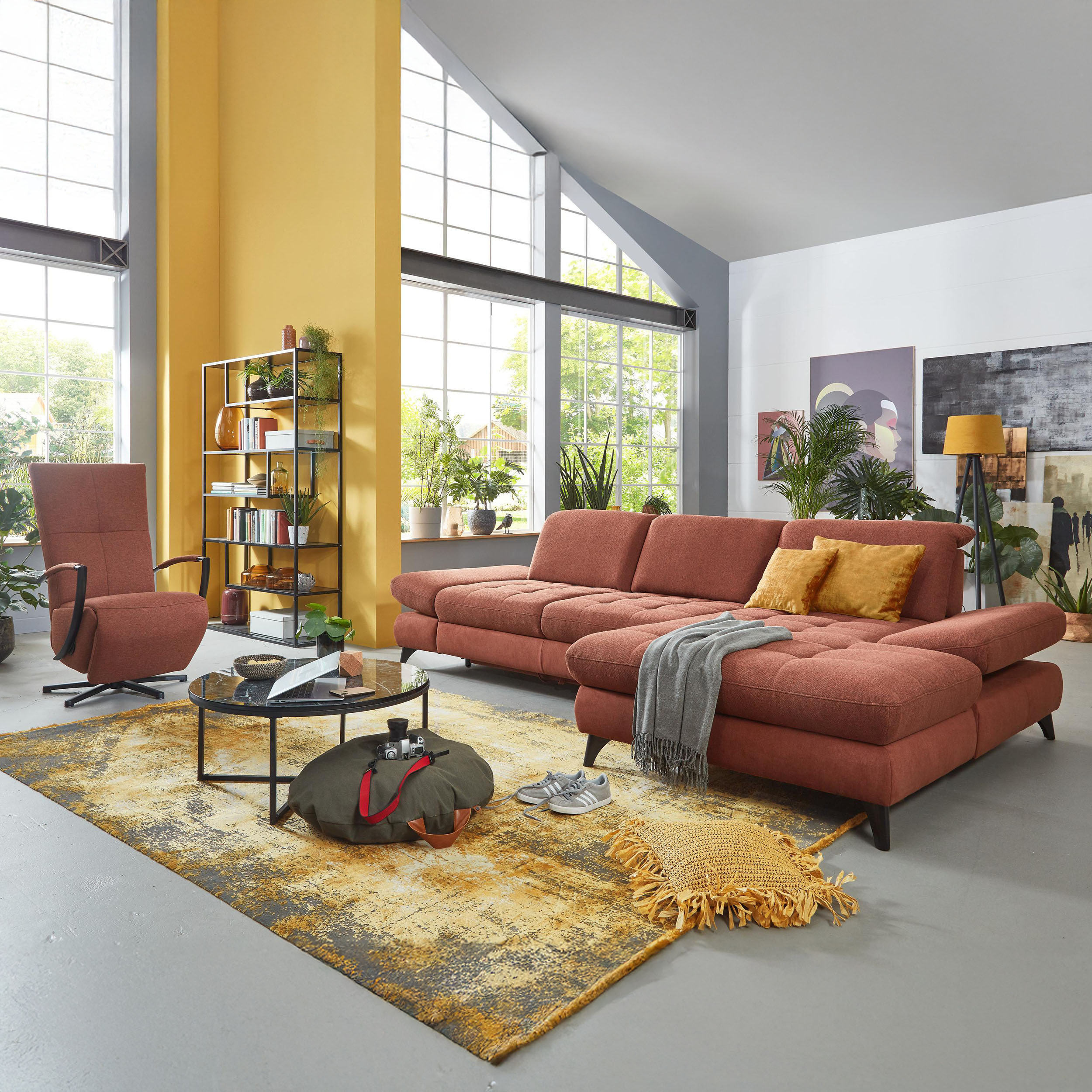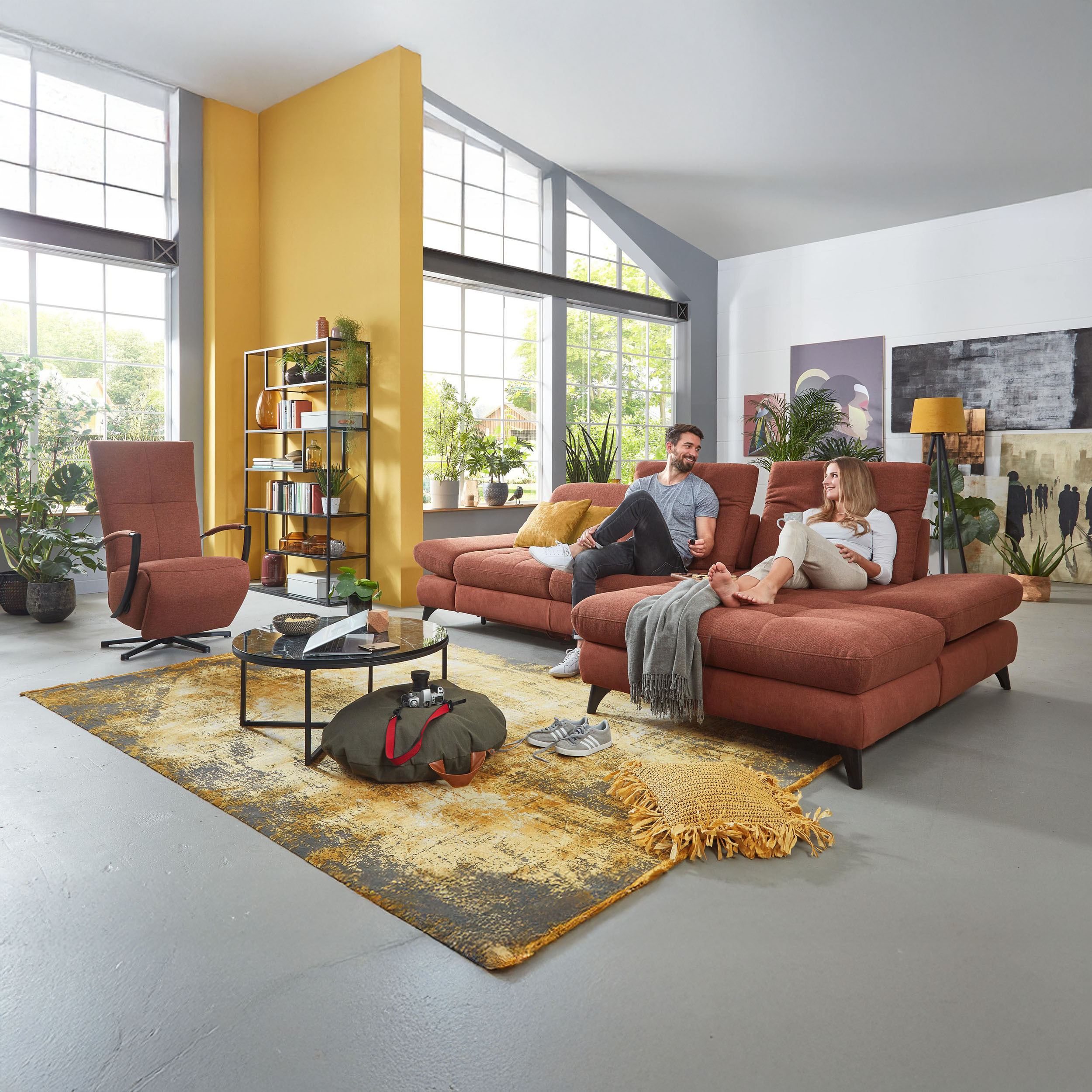 * Auf dem Foto ist ein Sofa mit Schlaf- und Stauraumfunktion, die Modellbezeichnung ist 2100_68.BETT.E 8142_68_BK, Rückenlehnen-Typ B, Füße Typ 1 matt schwarz, im Stoff Paris kupfer.