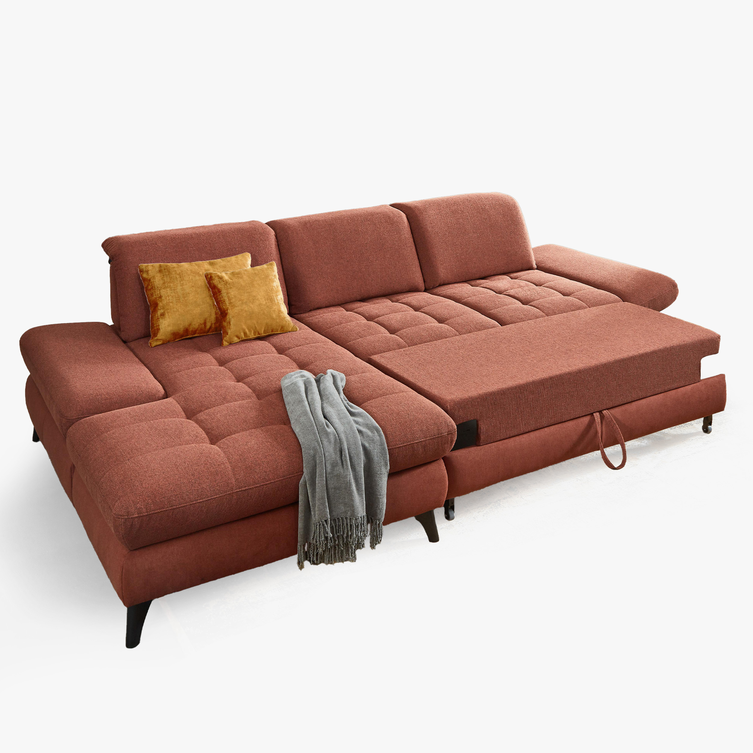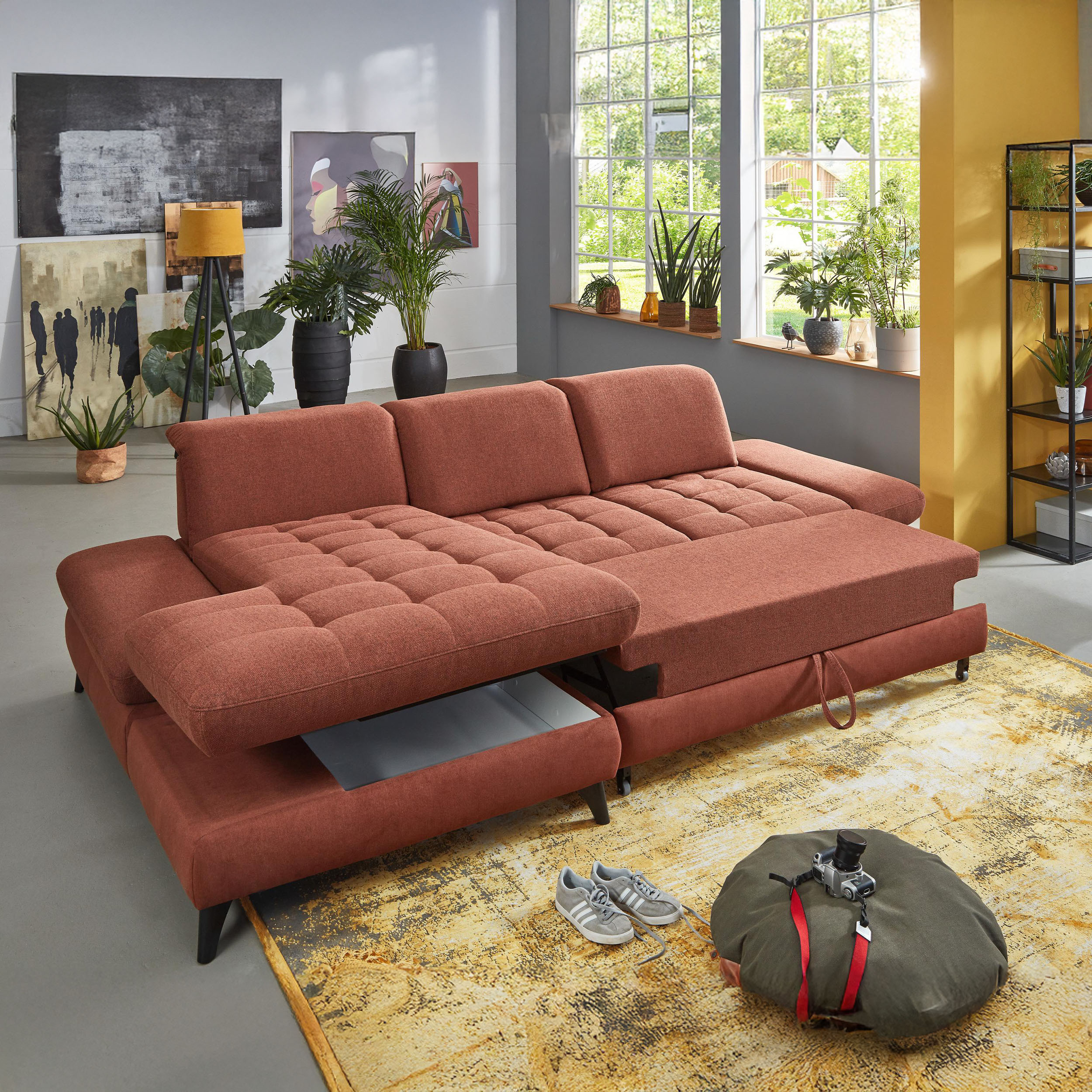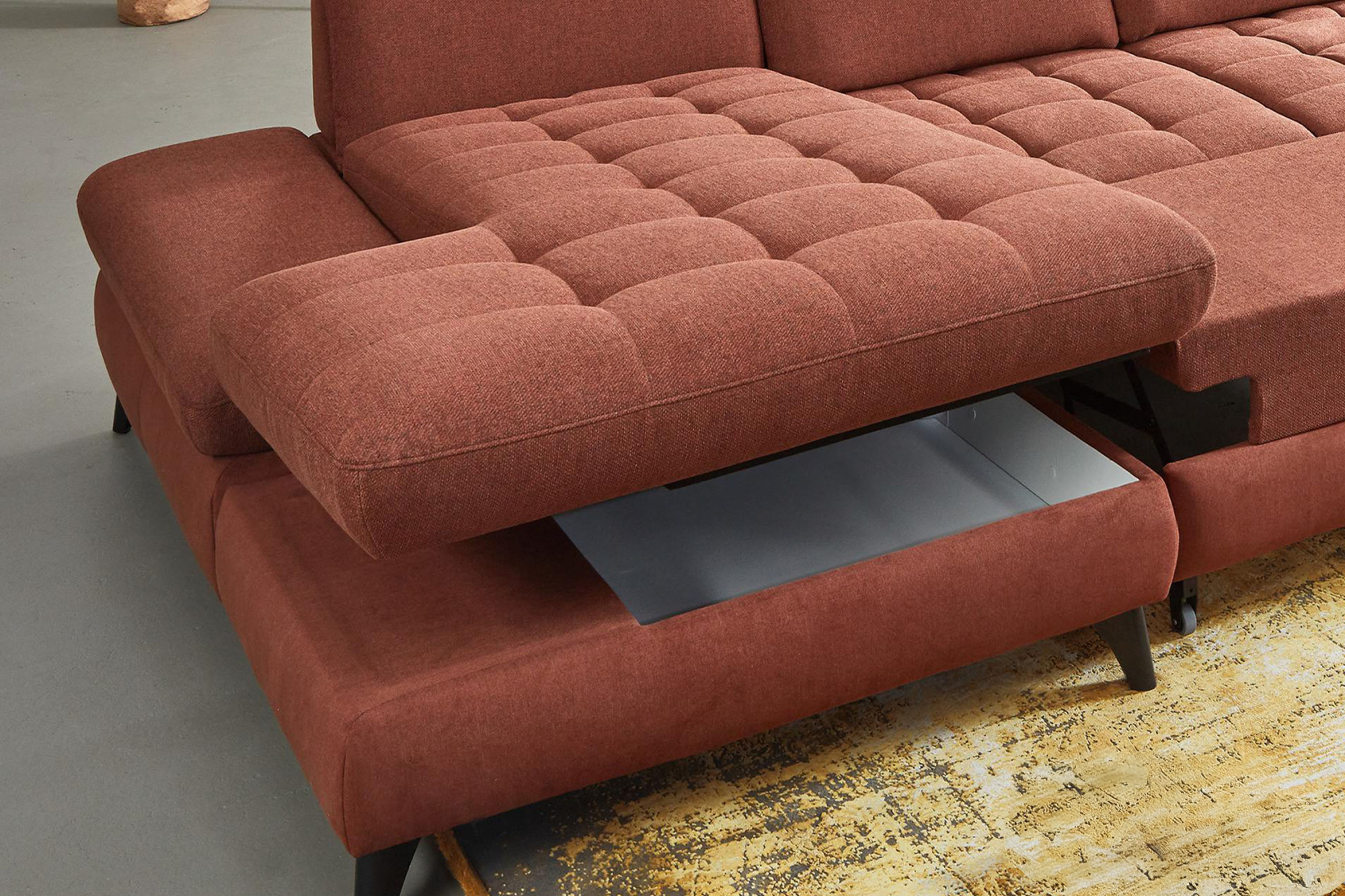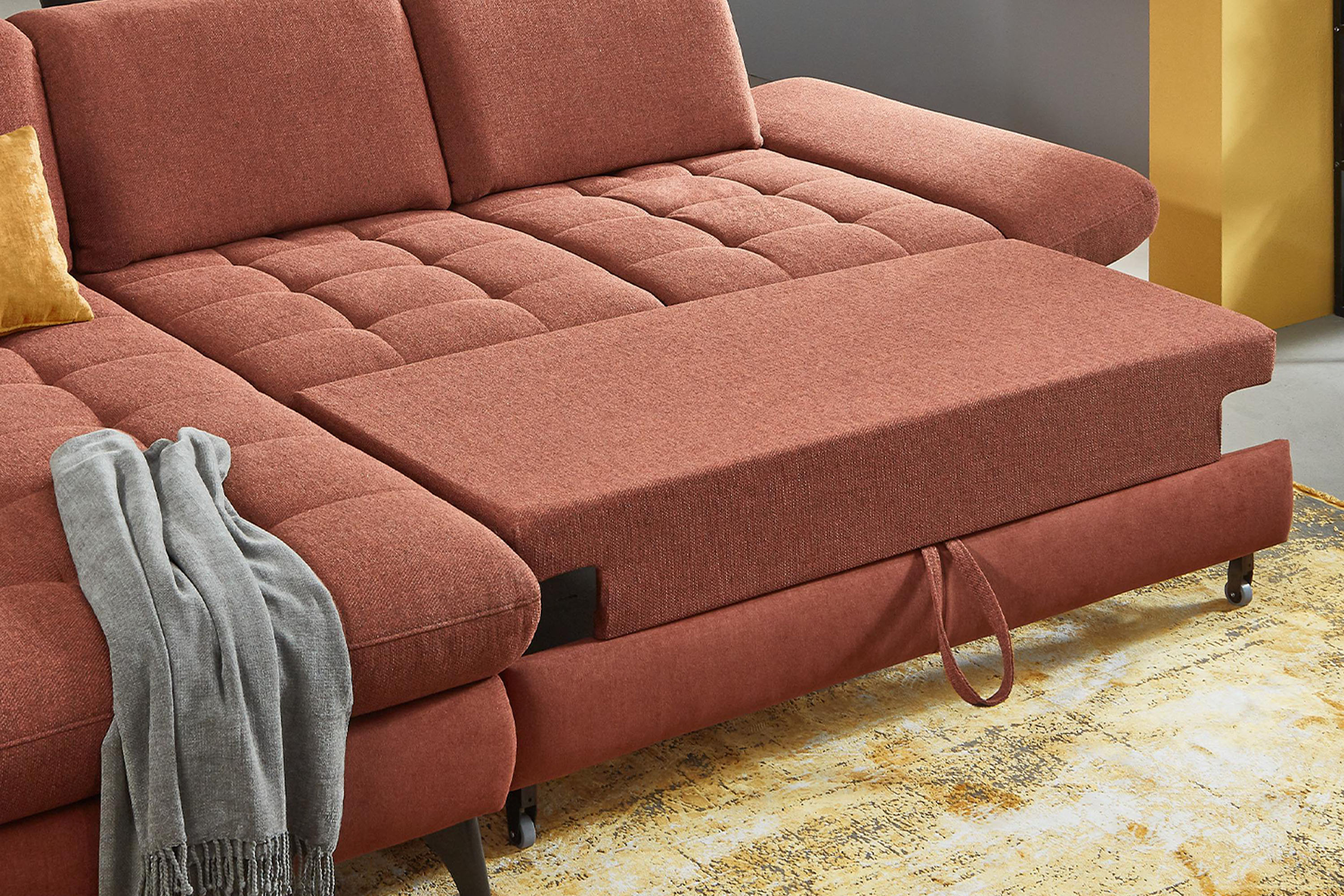 * Auf dem Foto ist ein Sofa mit Schlaffunktion und Stauraum zu sehen, das Modell trägt die Bezeichnung 2300_78_BETT.E+8141_68_BK+, Rückentyp B, Beine Typ 1 matt schwarz im Stoff Paris kupfer.