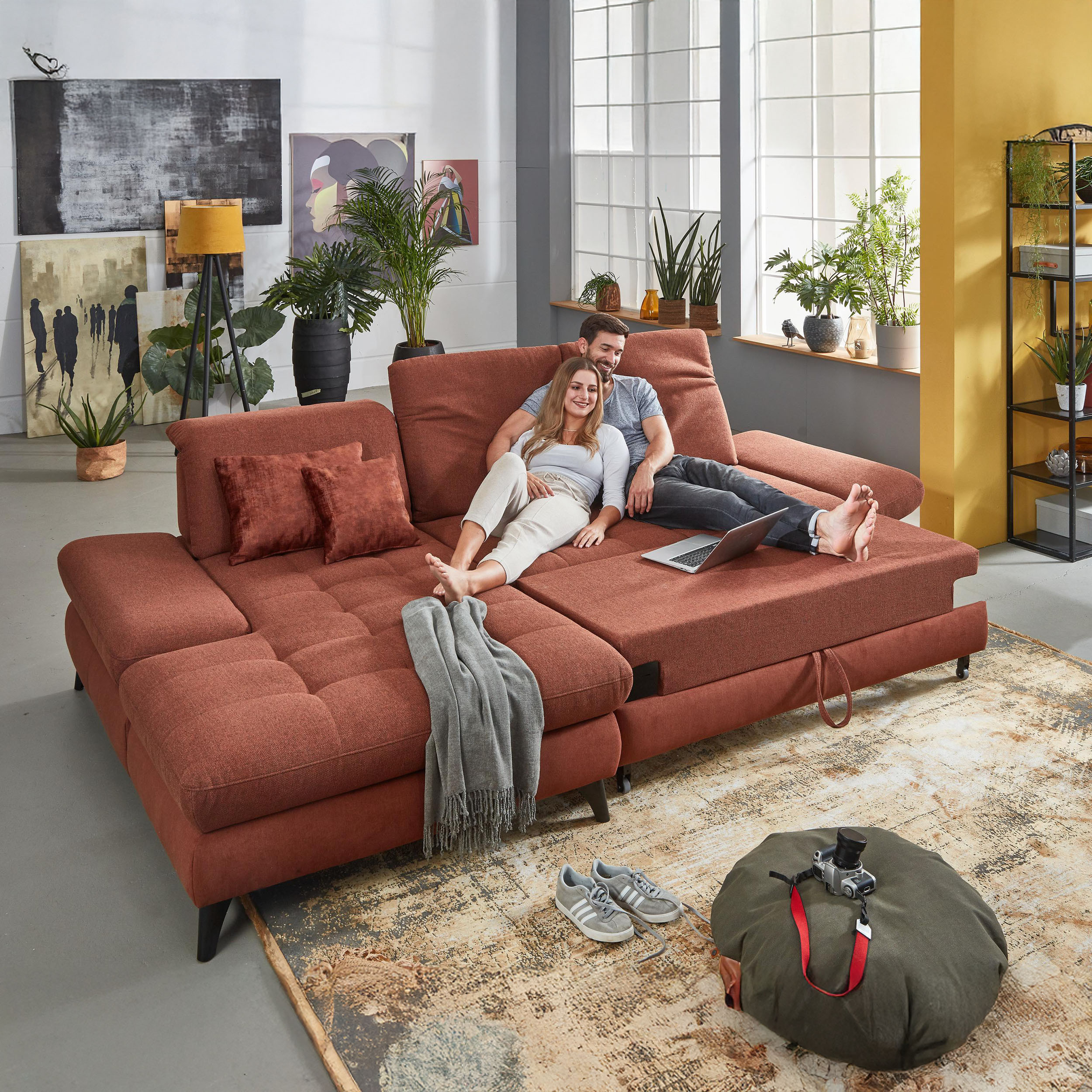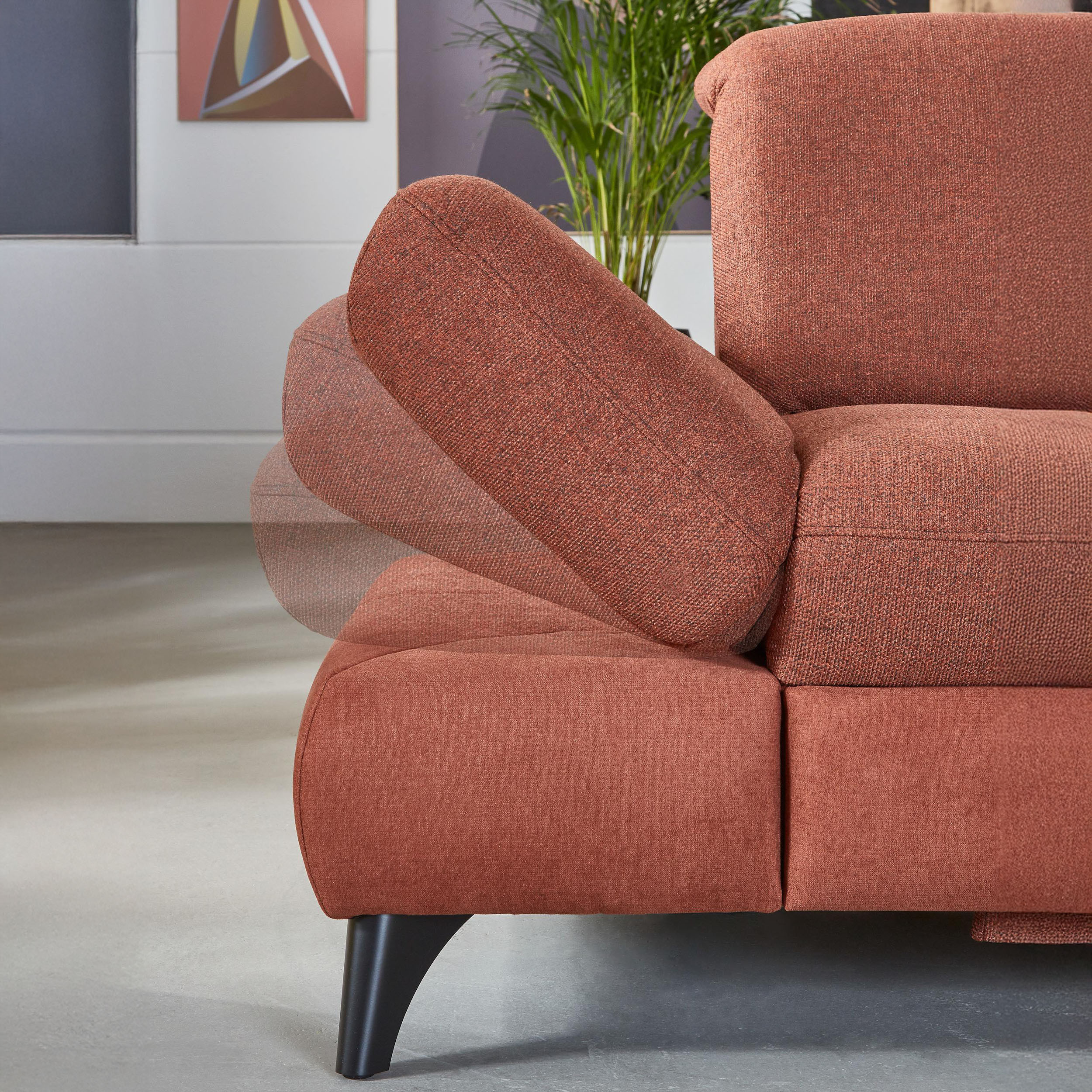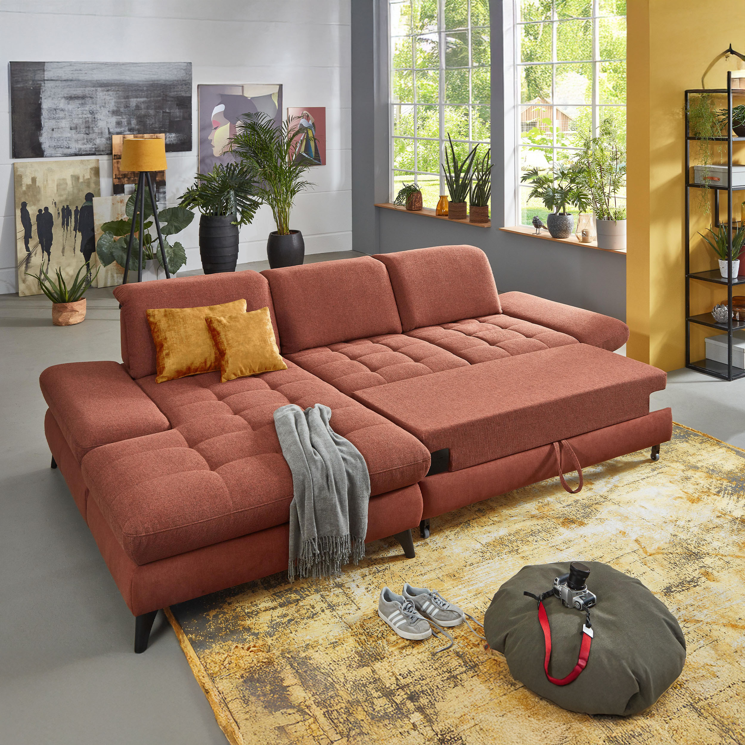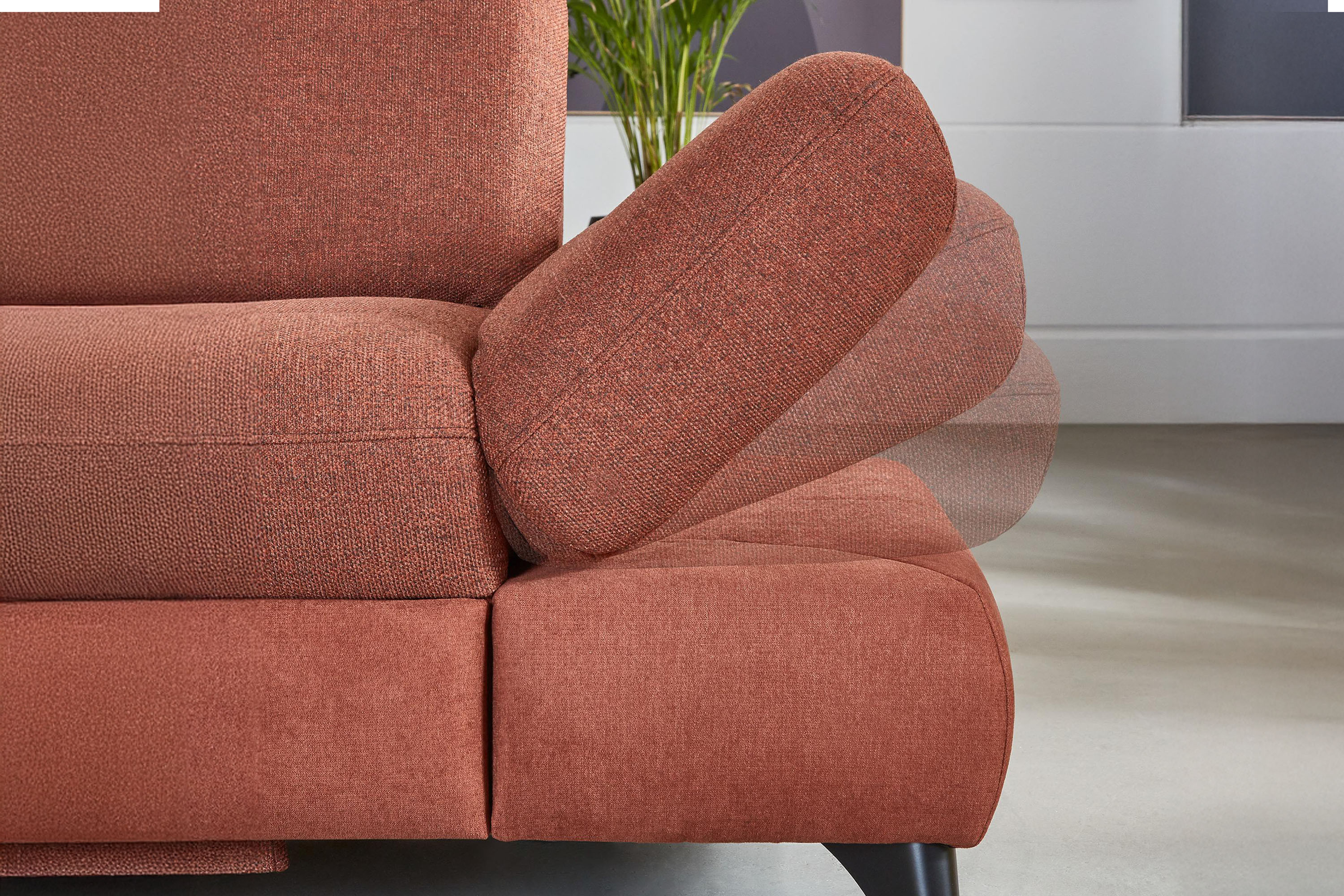 * Auf dem Foto ist ein Sofa mit Schlaffunktion und Stauraum zu sehen, das Modell trägt die Bezeichnung 2300_78_BETT.E+8141_68_BK+, Rückentyp B, Beine Typ 1 matt schwarz im Stoff Paris kupfer.