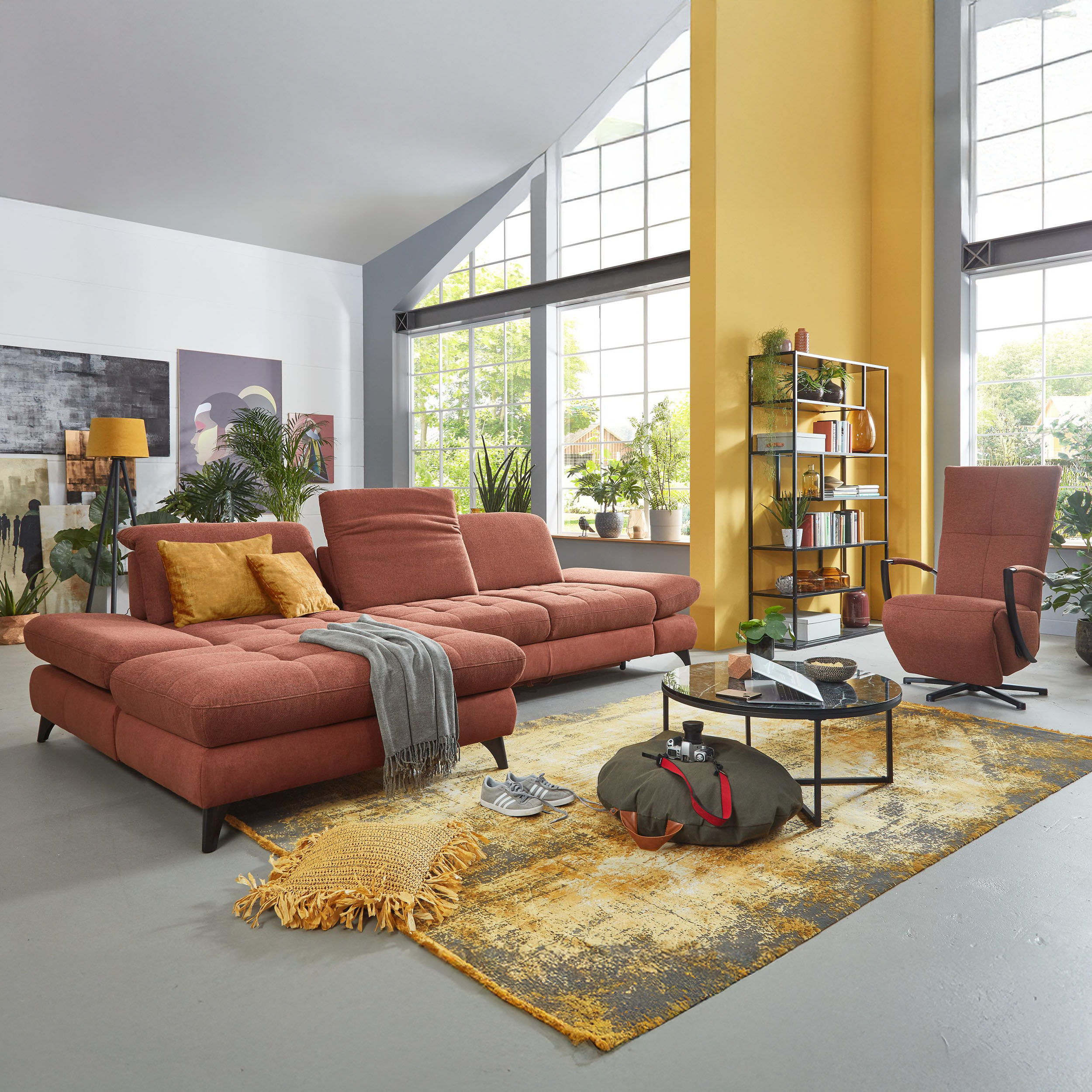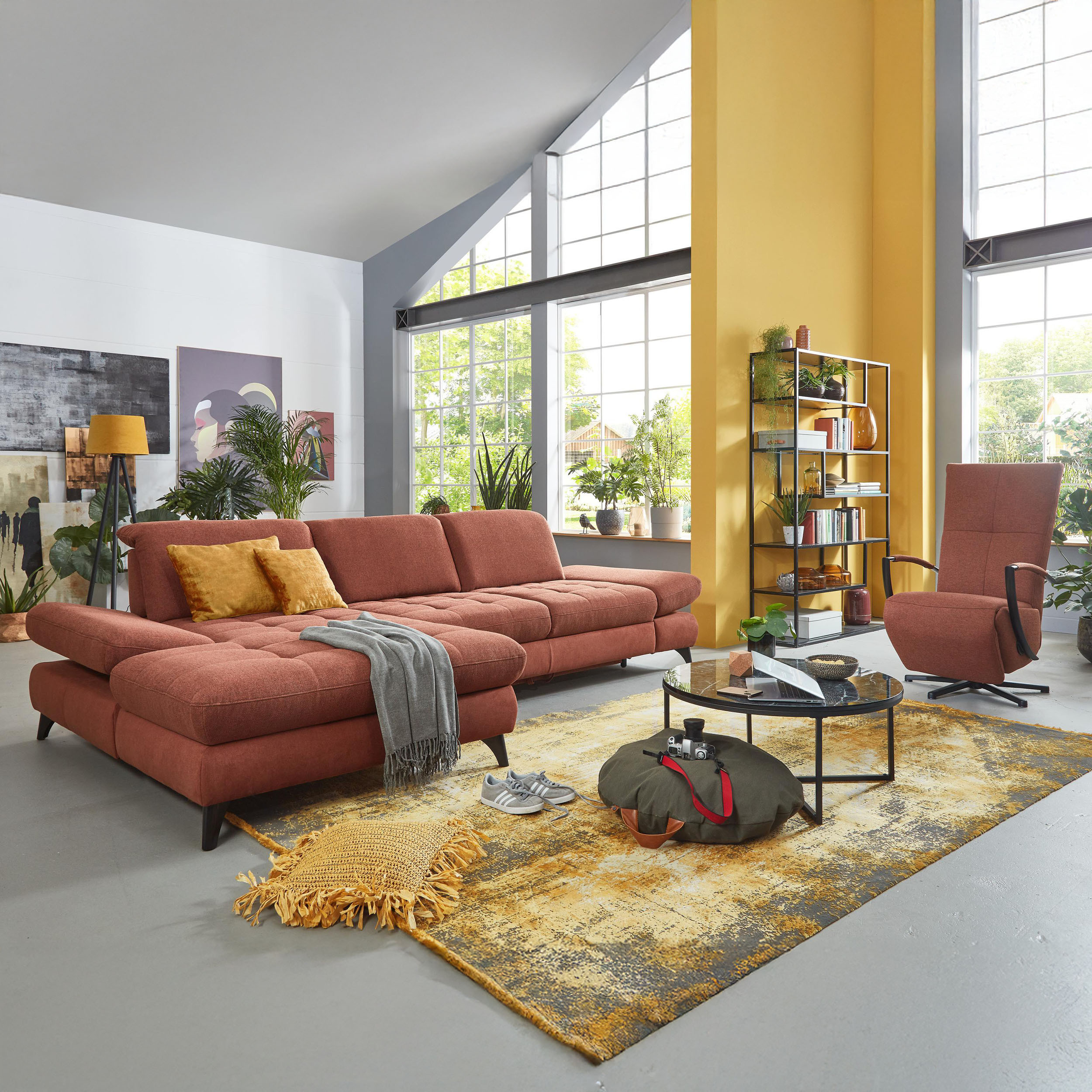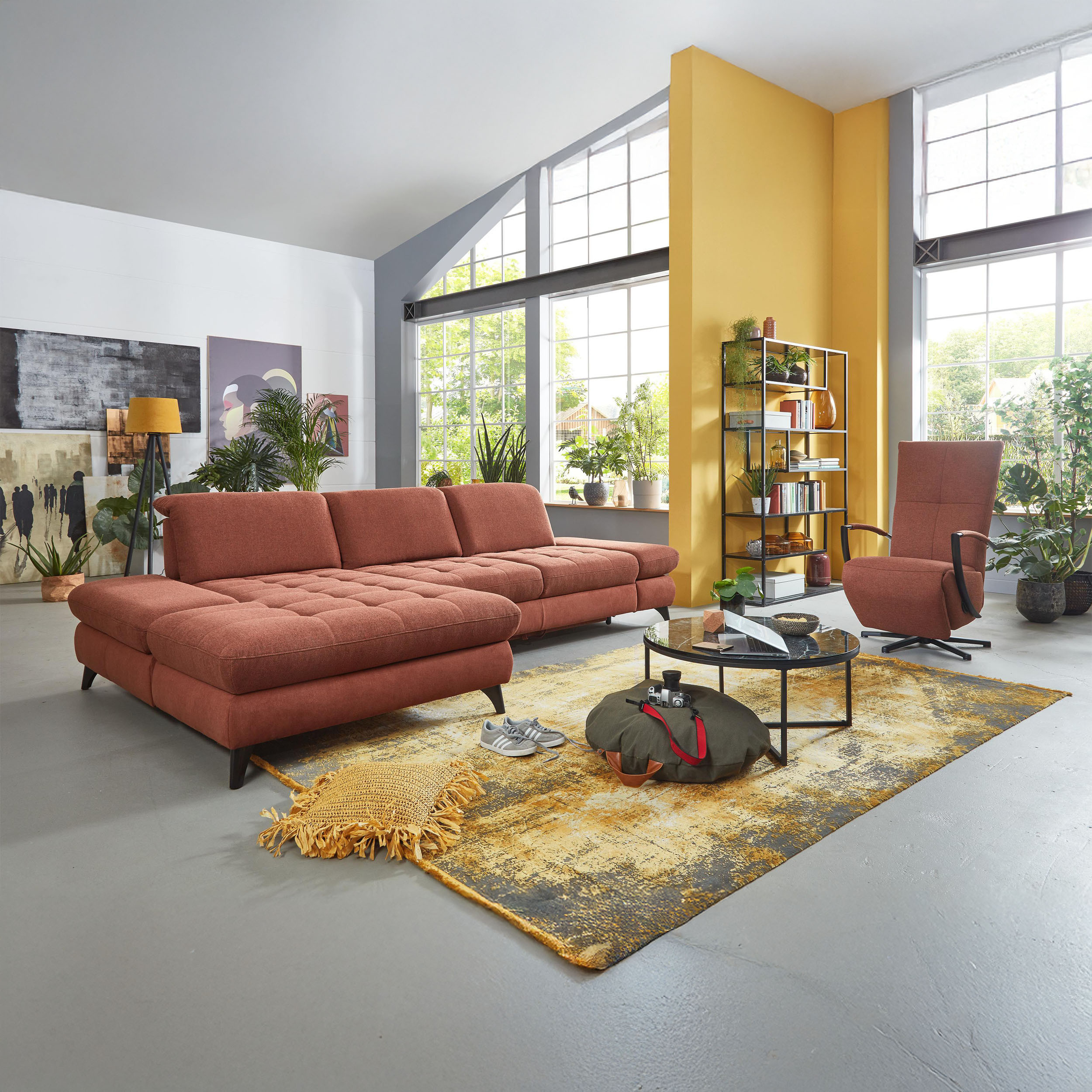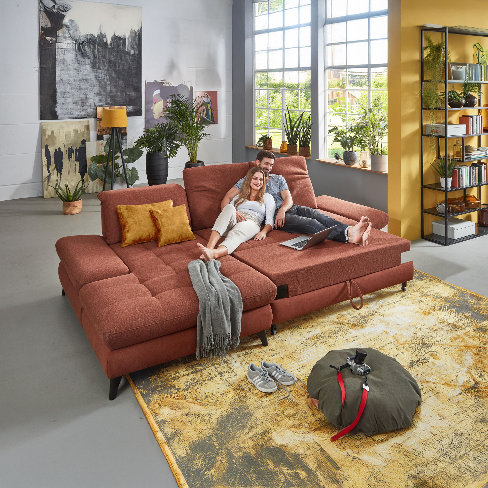 * Auf dem Foto ist ein Sofa mit Schlaffunktion und Stauraum zu sehen, das Modell trägt die Bezeichnung 2300_78_BETT.E+8141_68_BK+, Rückentyp B, Beine Typ 1 matt schwarz im Stoff Paris kupfer.