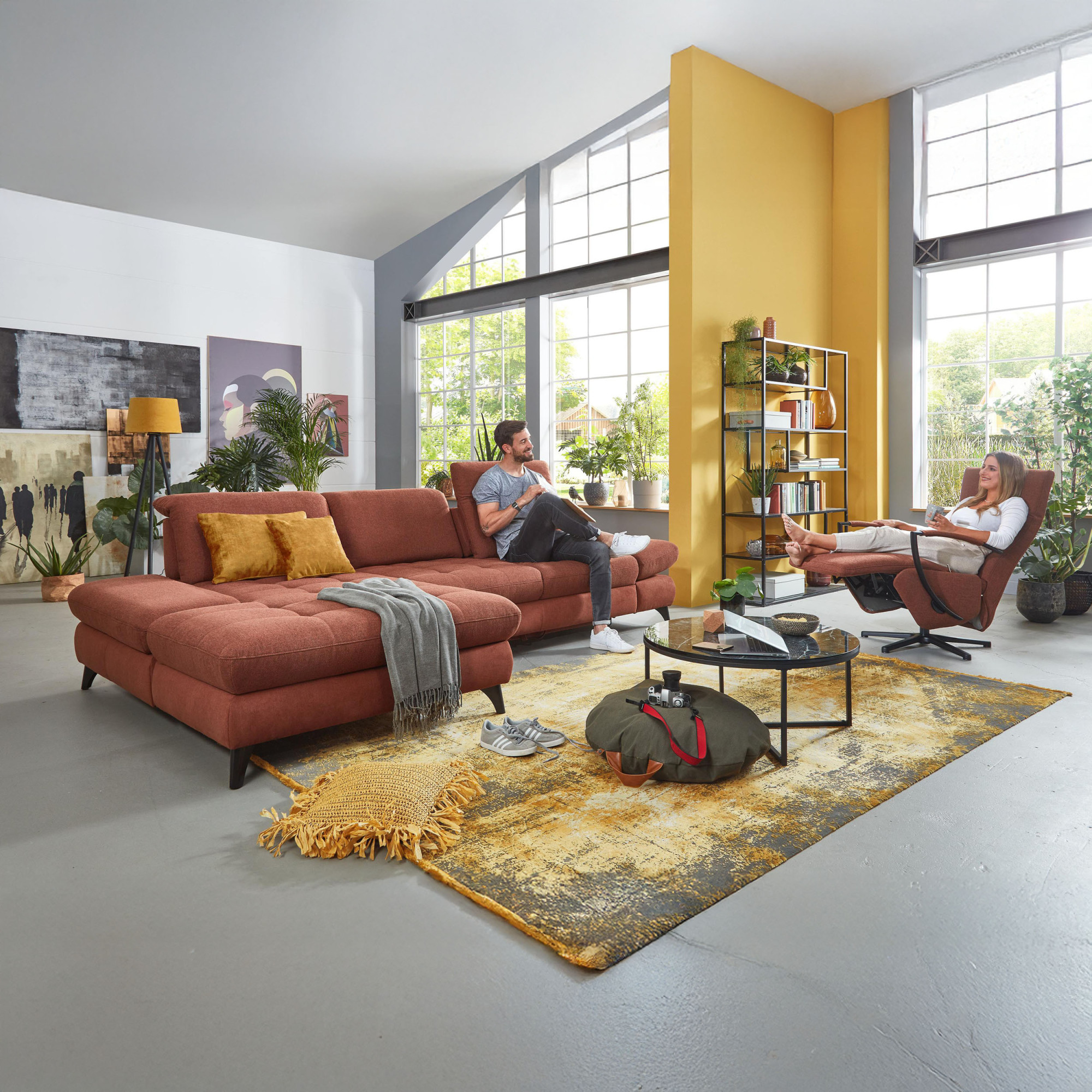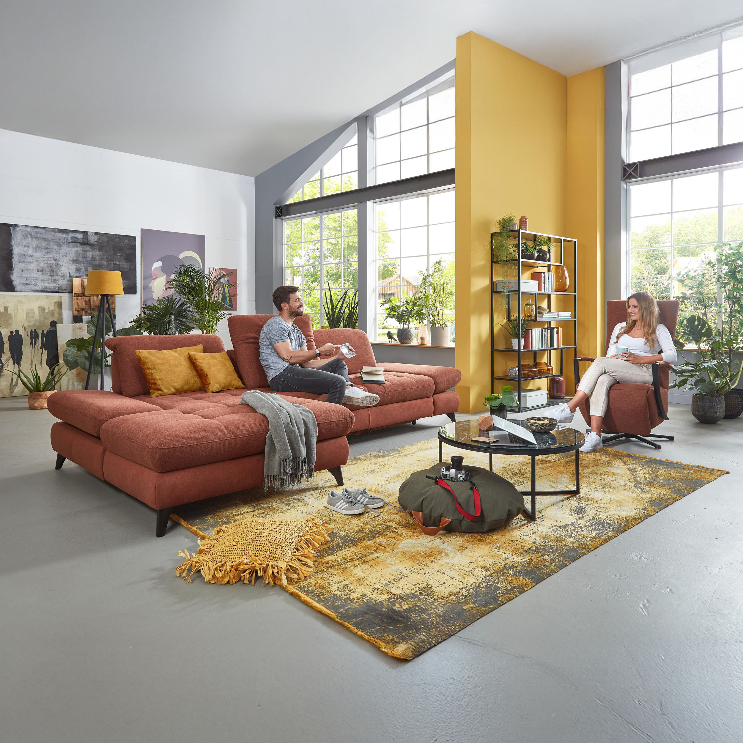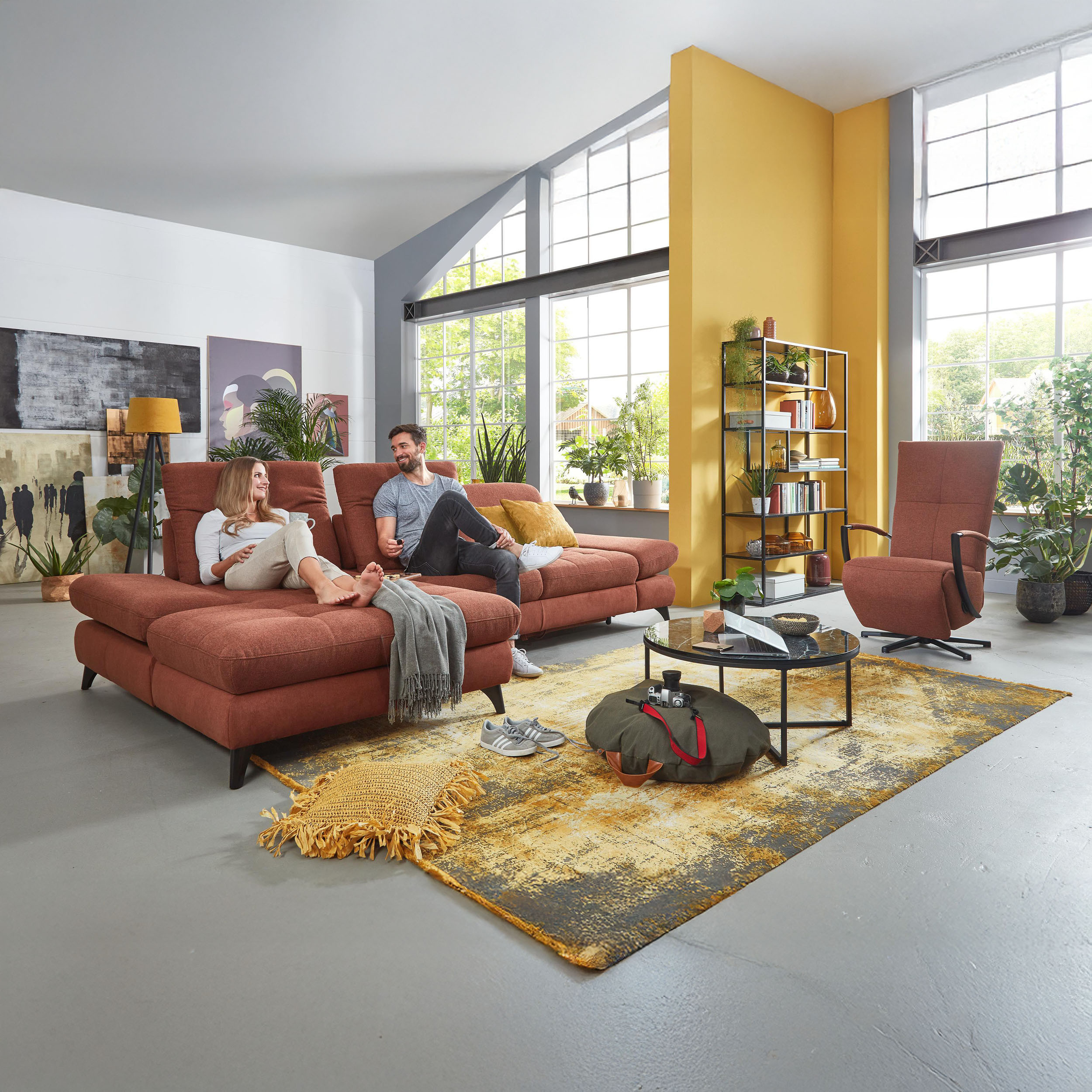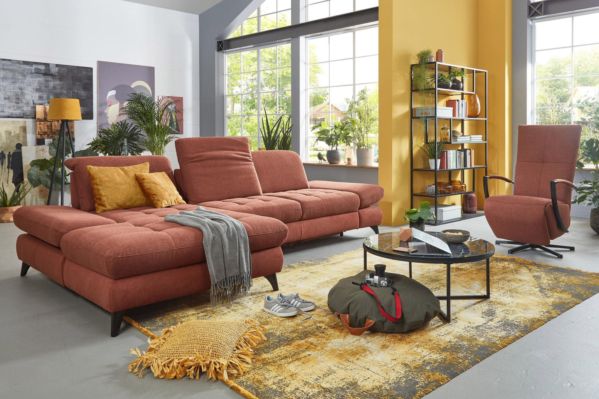 * Auf dem Foto ist ein Sofa mit Schlaffunktion und Stauraum zu sehen, das Modell trägt die Bezeichnung 2300_78_BETT.E+8141_68_BK+, Rückentyp B, Beine Typ 1 matt schwarz im Stoff Paris kupfer.