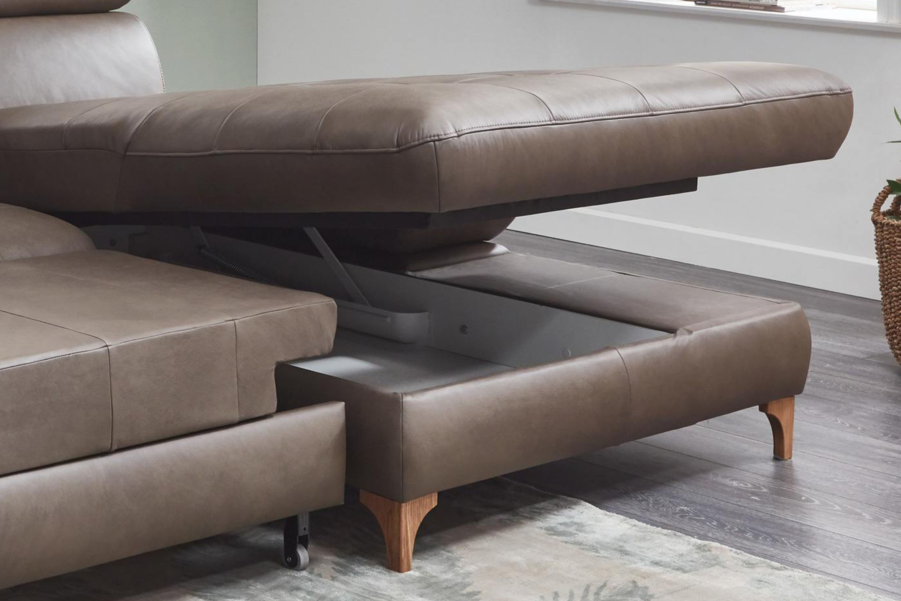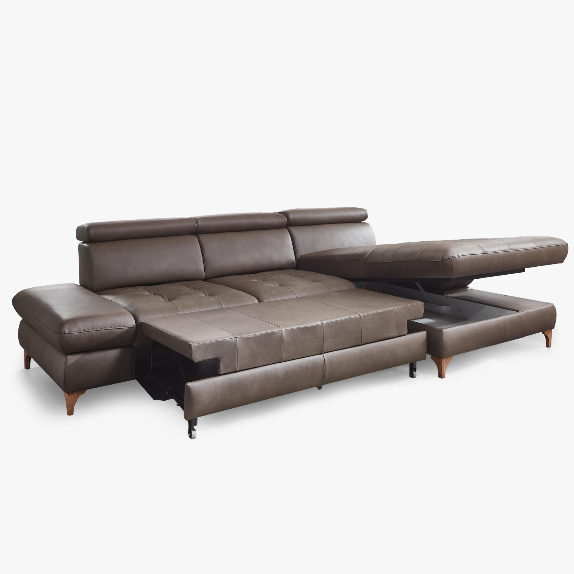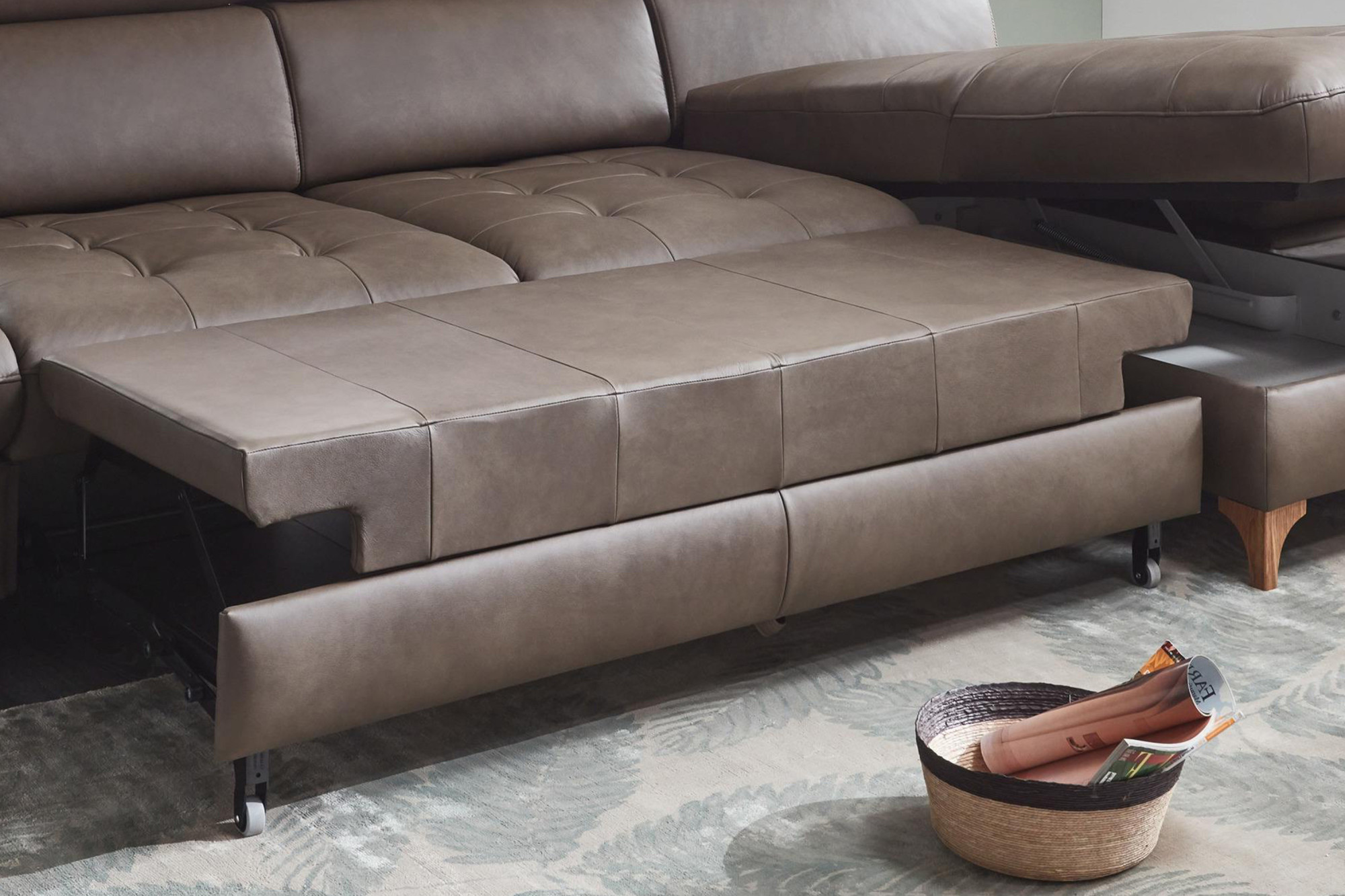 * Auf dem Foto ist ein Sofa mit Schlaf-Funktion zu sehen, das Modell trägt die Bezeichnung 2300_78_BETT.E, verstellbares Kopfteil Typ B, Beine Typ 3 in der Farbe Wildeiche und in Punch Delphine Leder mit Steppnähten, die bei der Bestellung des Sofas in Leder erforderlich sind.