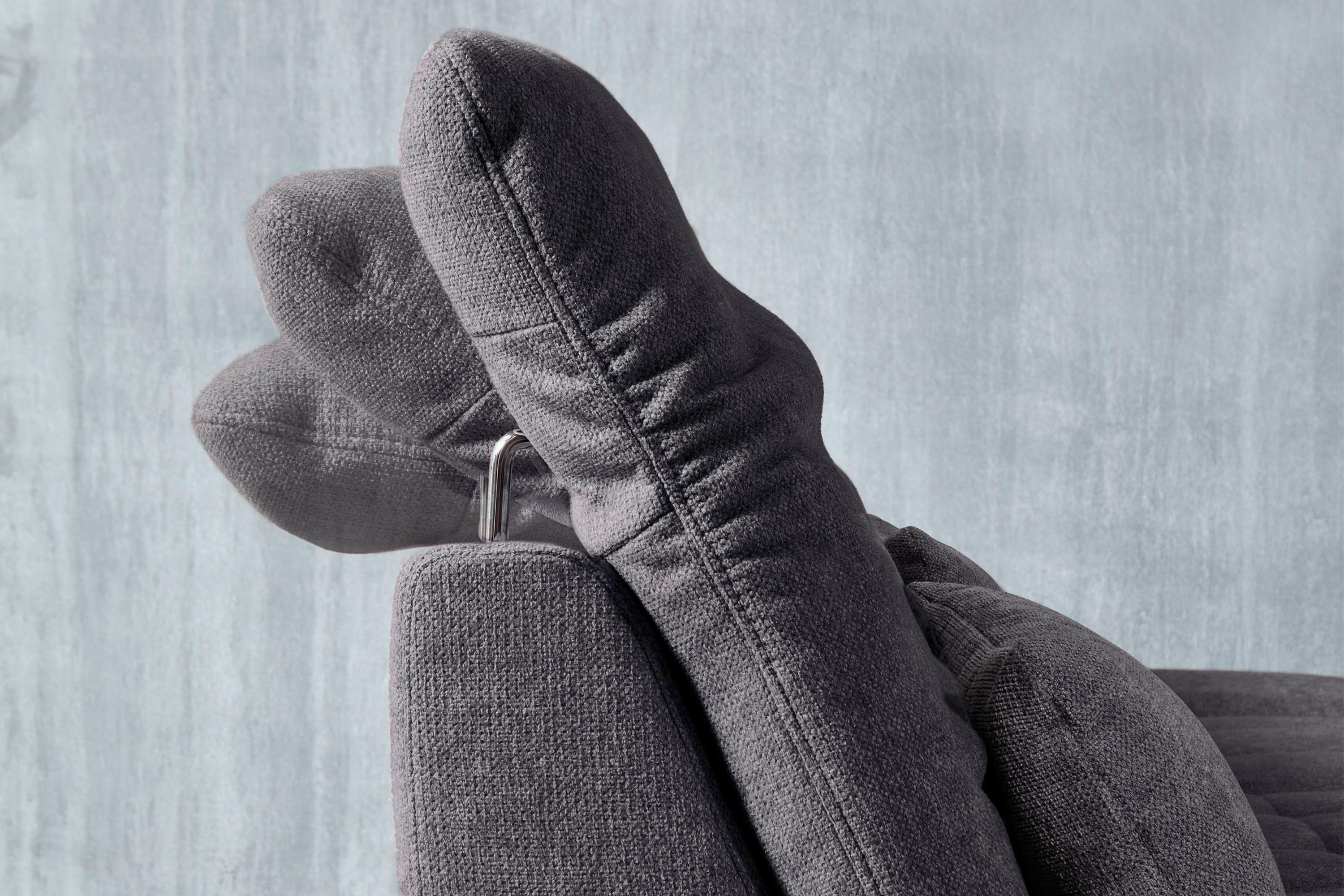 * Auf dem Foto ist ein Sofa im rechten Teil mit einer Longchair-Abschluss, Bezeichnung 8142_78_BK, Kopfstütze Typ B aus dem Stoff Paris grau.