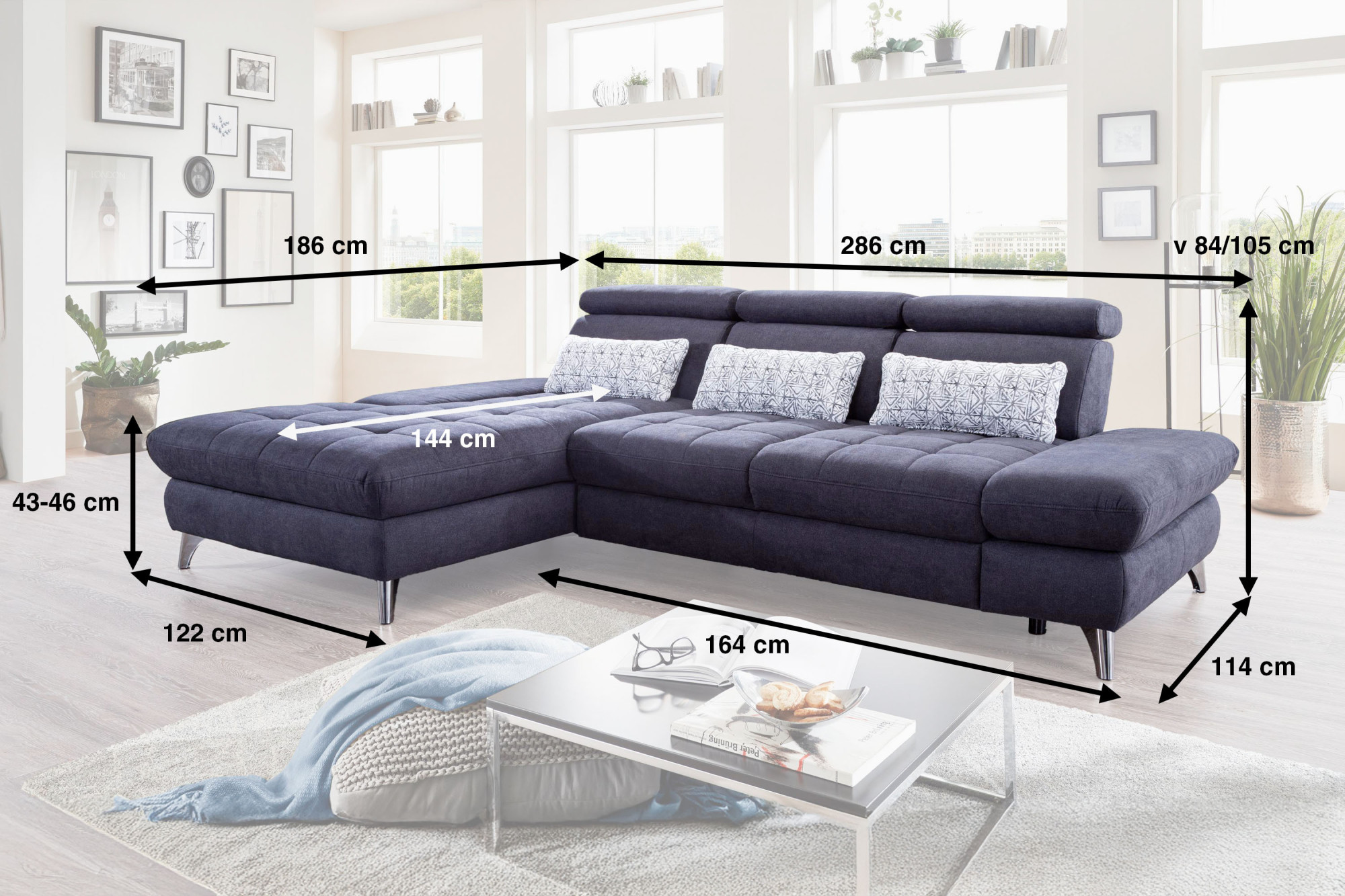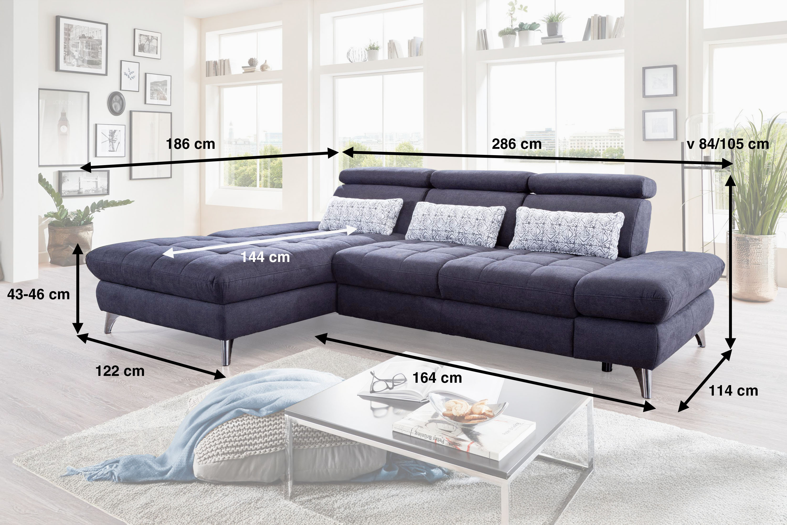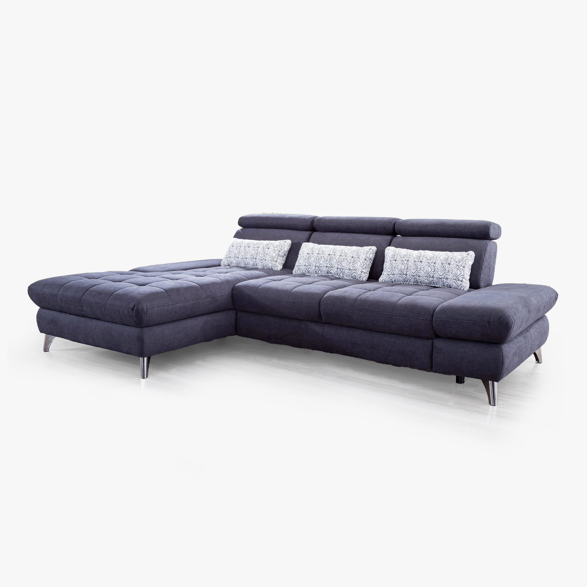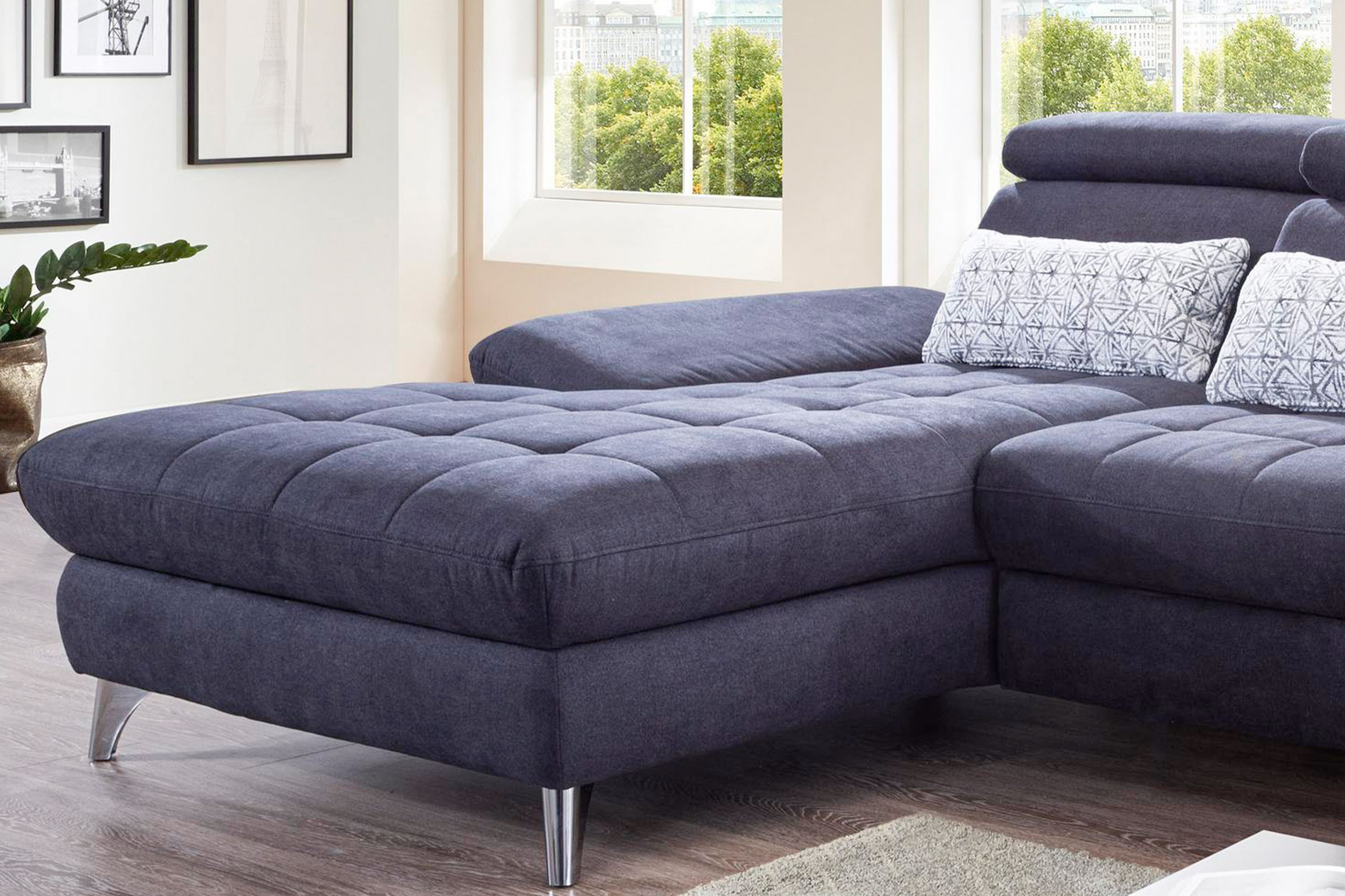 Sitzgarnitur Karolina in der Form L stellt die ideale Verbindung dar modernen Designs, hohen Sitzkomfort und erstklassiger Verarbeitung. Dieses Modell ist so konzipiert, dass es selbst die anspruchsvollsten Erwartungen erfüllt und gleichzeitig beibehalten wird. günstigen Preis. Auf dem Bild ist ein Sofa aus Stoff gefertigt. Miranda dunkelgrau mit Beinen in einem Farbton Metall chromafarben.