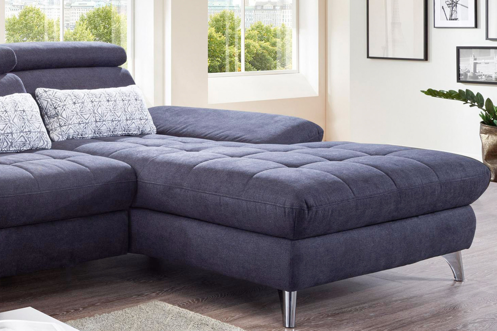 Sitzgarnitur Karolina in der Form L stellt die ideale Verbindung dar modernen Designs, hohen Sitzkomfort und erstklassiger Verarbeitung. Dieses Modell ist so konzipiert, dass es selbst die anspruchsvollsten Erwartungen erfüllt und gleichzeitig beibehalten wird. günstigen Preis. Auf dem Bild ist ein Sofa aus Stoff gefertigt. Miranda dunkelgrau mit Beinen in einem Farbton Metall chromafarben.