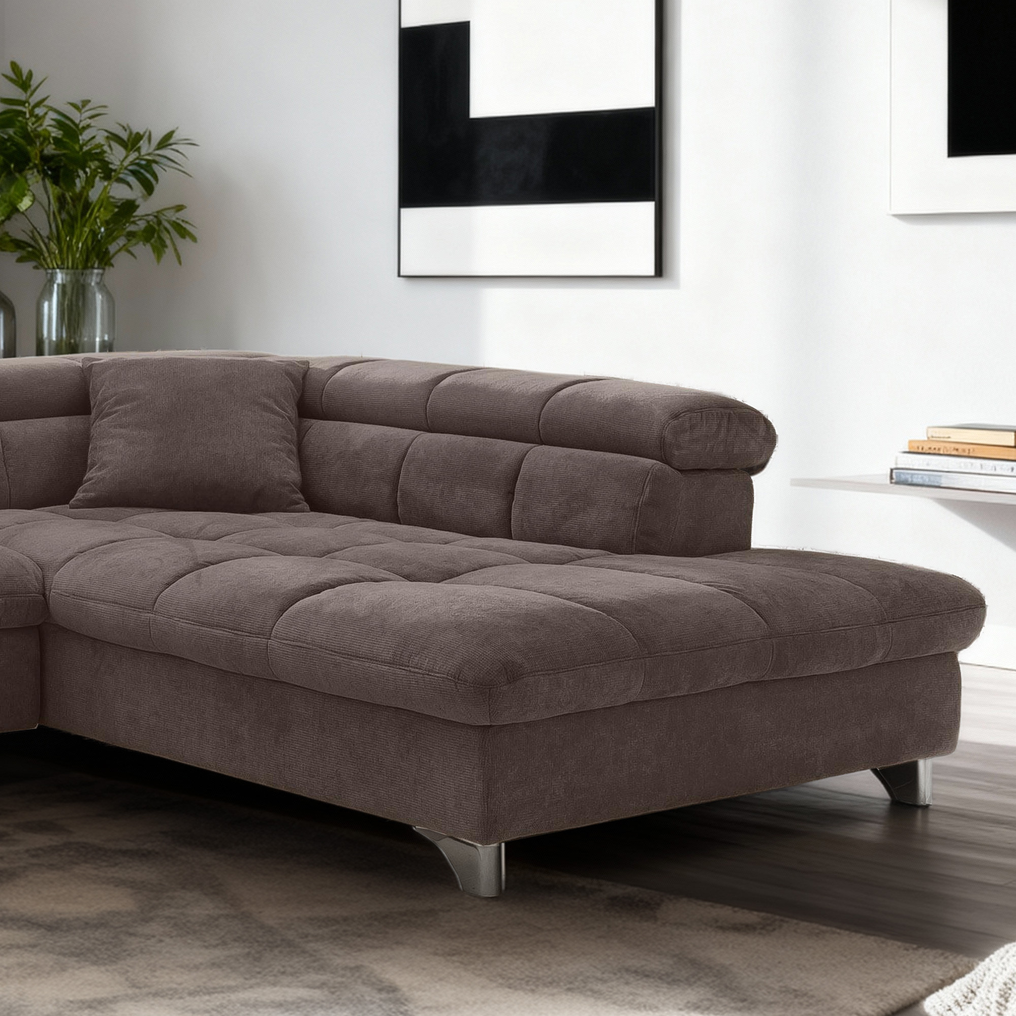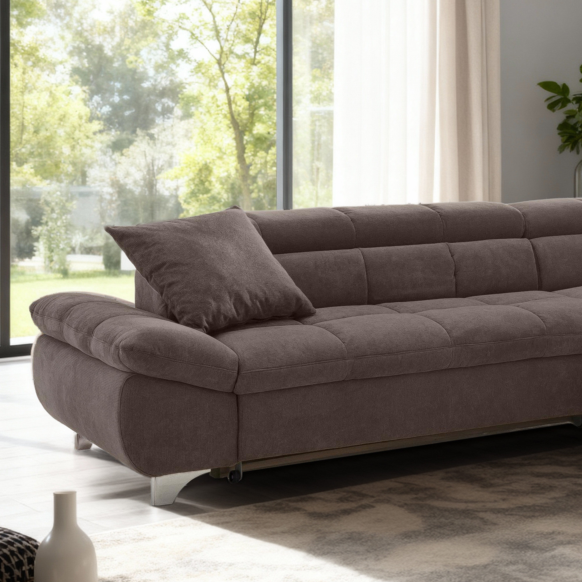 Das Sofa ist auf Ihre Bedürfnisse ausgelegt – es bietet eine praktische Schlaffunktion für gelegentliche Übernachtungsgäste und sorgt für maximalen Komfort beim Ausruhen. Die verstellbaren Kopfstützen ermöglichen noch mehr Entspannung beim Fernsehen oder Lesen. Die Maße des Sofas betragen Breite 312 cm und Tiefe 234 cm, verfügbar ist eine Variante mit Ecke links oder rechts je nach Anordnung Ihres Raumes. Die Metallfüße mit einer Höhe von 10 cm verleihen der Garnitur ein leichtes und luftiges Aussehen und erleichtern die Reinigung des Bodens unter dem Sofa. Diese Eck-Sitzgarnitur mit Schlafplatzfunktion ist die perfekte Wahl für Familien und Komfortliebhaber, die hochwertige Verarbeitung und zeitloses Design schätzen.