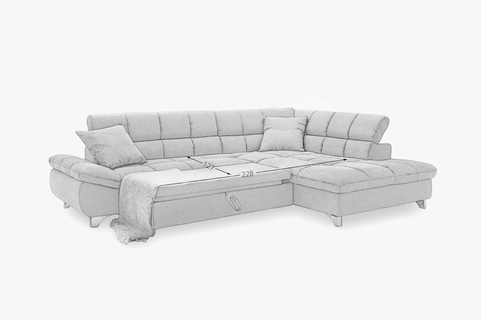 Das Sofa verfügt über einen einfachen und intuitiven Ausklappmechanismus. Ziehen Sie den Sitzbereich nach vorne und klappen Sie die Rückenlehne aus, wodurch eine bequeme Schlaffläche für zwei Erwachsene entsteht. - Wie groß ist die Schlaffläche nach dem Ausklappen?