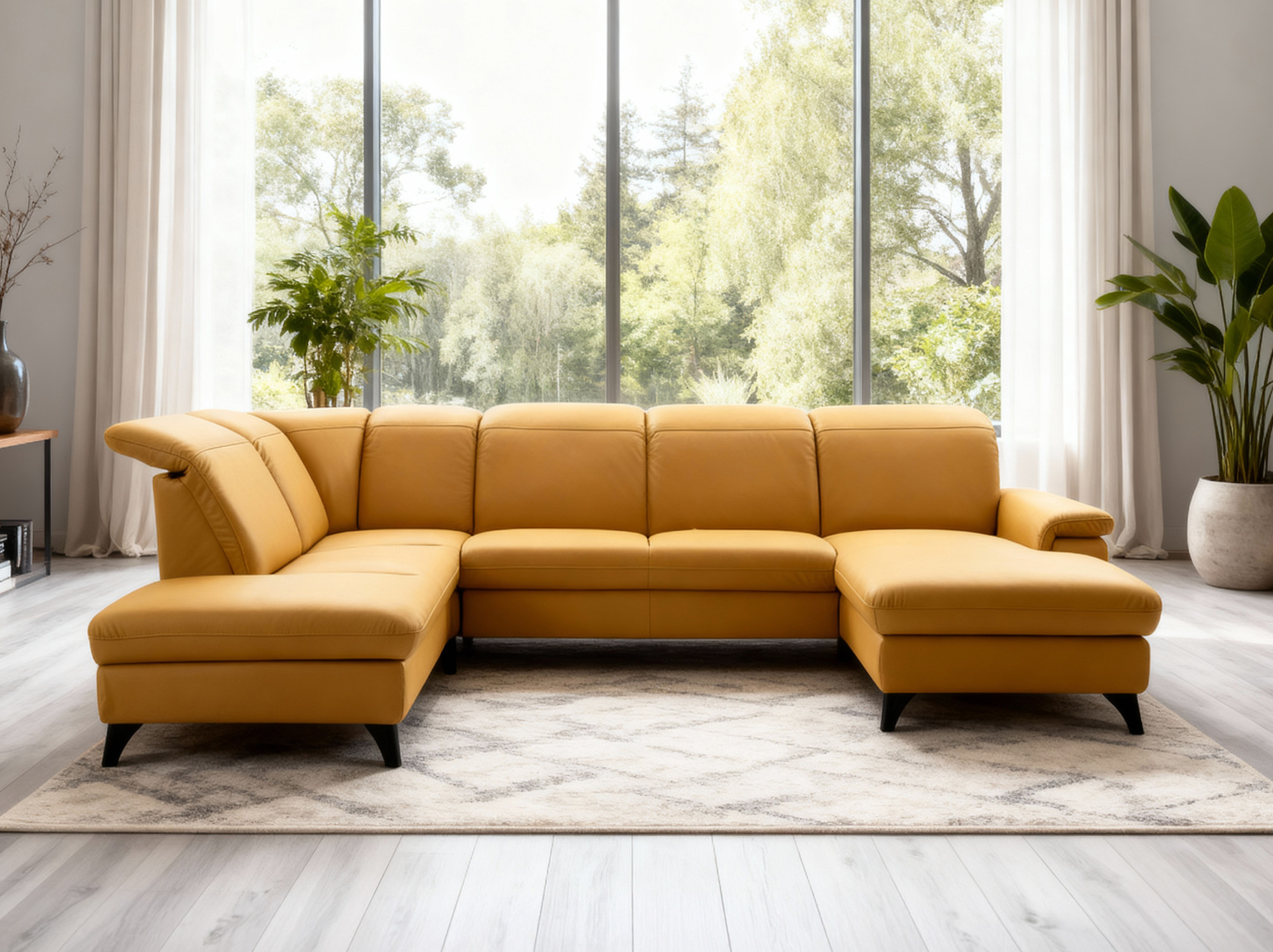 Luxuriös Leder-Sitzgarnitur Magma in U-Form stellt eine Verbindung dar modernen Designs, erstklassiger Handwerkskunst und außergewöhnlichem Komfort. Es ist die ideale Wahl für anspruchsvolle Kunden, die nicht nur Schönheit, sondern auch Funktionalität suchen. Die Konstruktion aus massives Holz und stabile Spanplatte garantiert hohe Stabilität und lange Lebensdauer. Im Grundpreis ist enthalten Sitzhöhe 46 cm, , feste Kopfstützen und Standard-Sitz mit PUR-Schaum. Die Rückseite des Sitzes ist immer mit echtem Leder bezogen je nach Auswahl des Kunden, was ihre Platzierung auch frei im Raum ermöglicht.