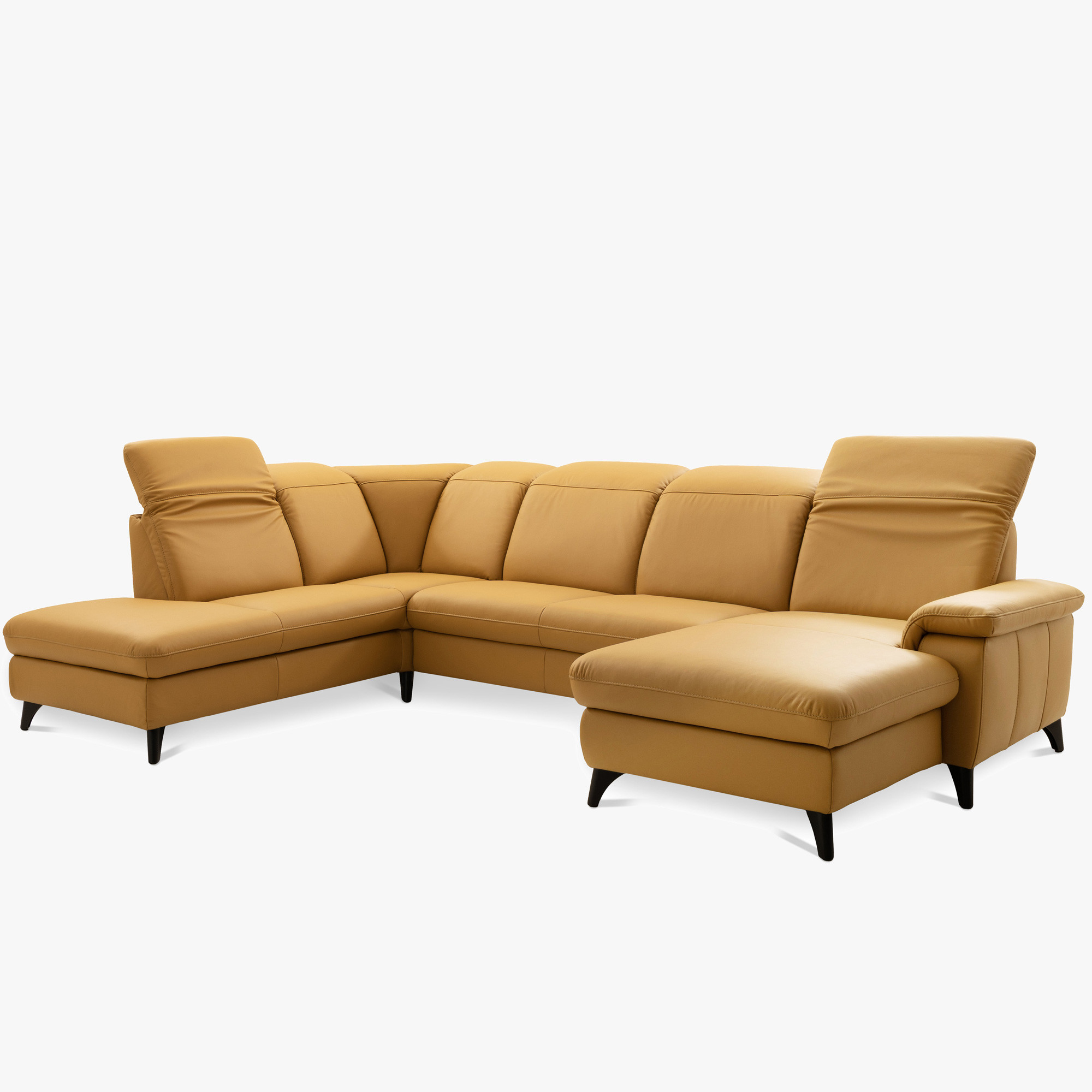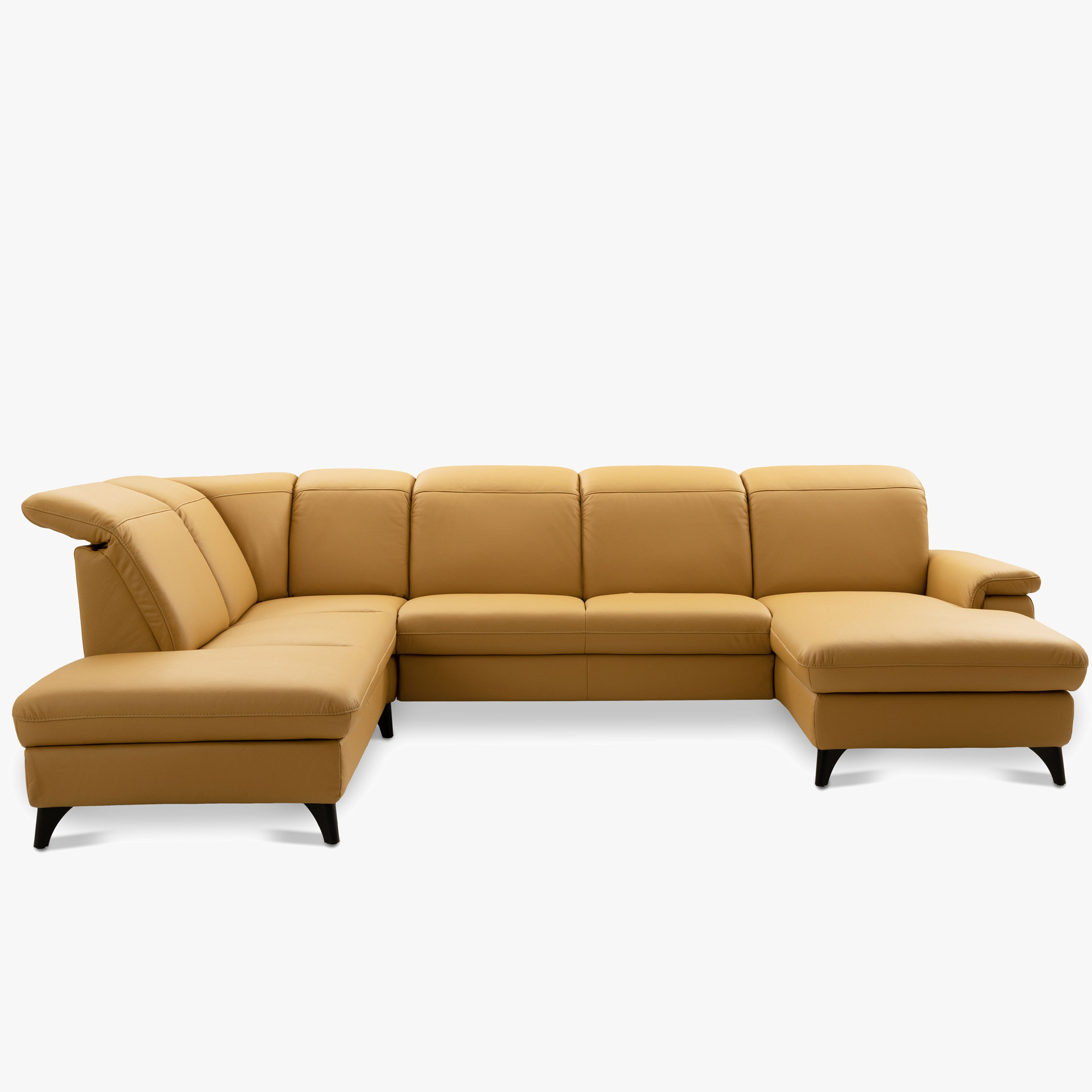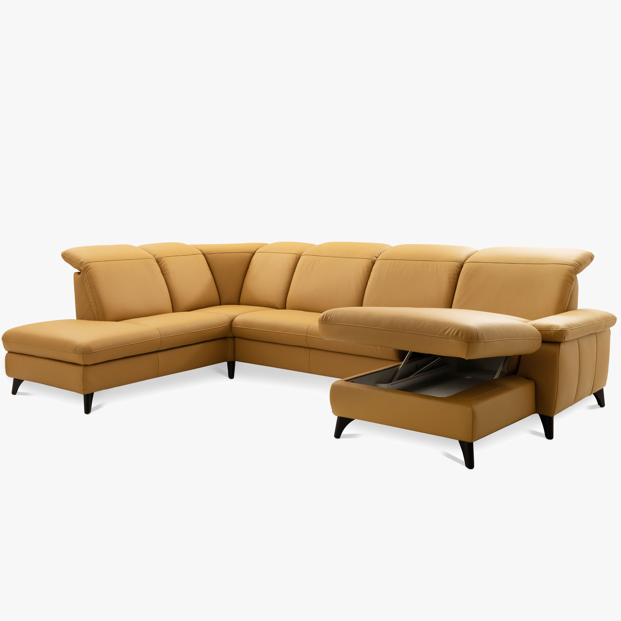 Elegant Schwarze Metallbeine Die Höhe von 12 cm unterstreicht das moderne Aussehen der gesamten Garnitur und erleichtert die Reinigung unter dem Sofa. Die Garnitur ist auch in einer Stoffausführung erhältlich. Das Modell auf dem Foto (in Punch Dijon Leder) hat die Maße 230 × 336 × 174 cm und eine Sitzhöhe von 46 cm. In den linken Teil des Endelements kann optional hinzugefügt werden Speicherplatz gegen Aufpreis. Das Sofa Magma bietet den Luxus, den Sie verdienen – und die Qualität, die jahrelang hält.