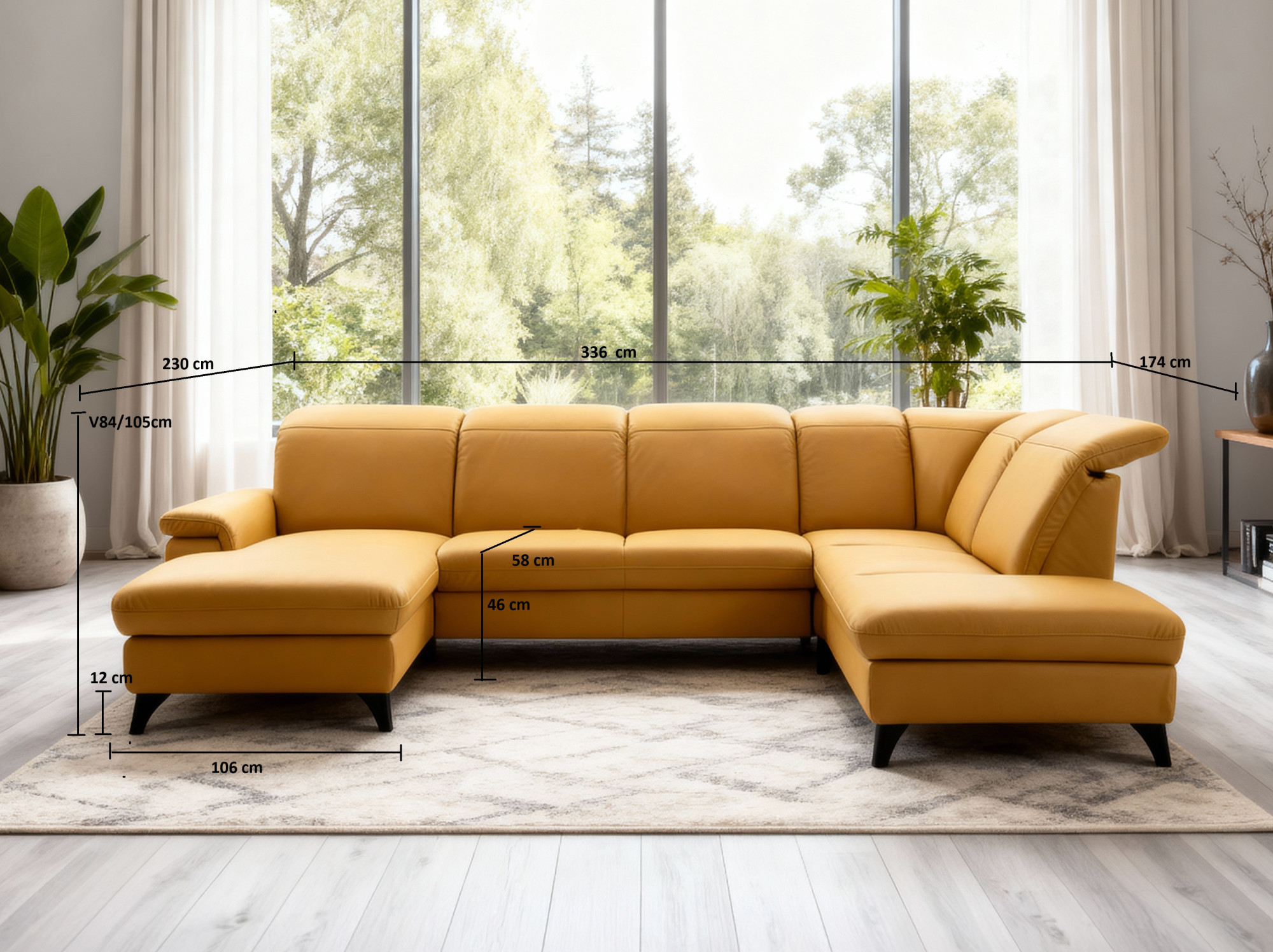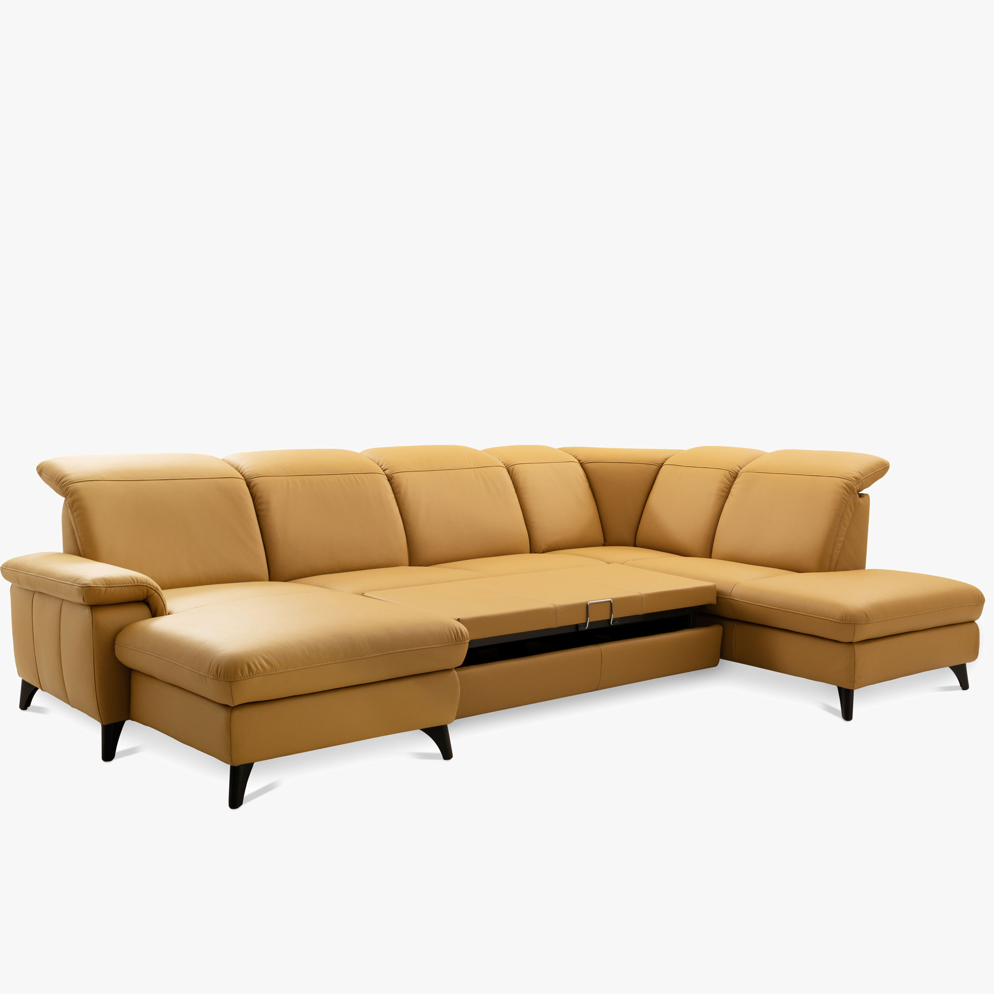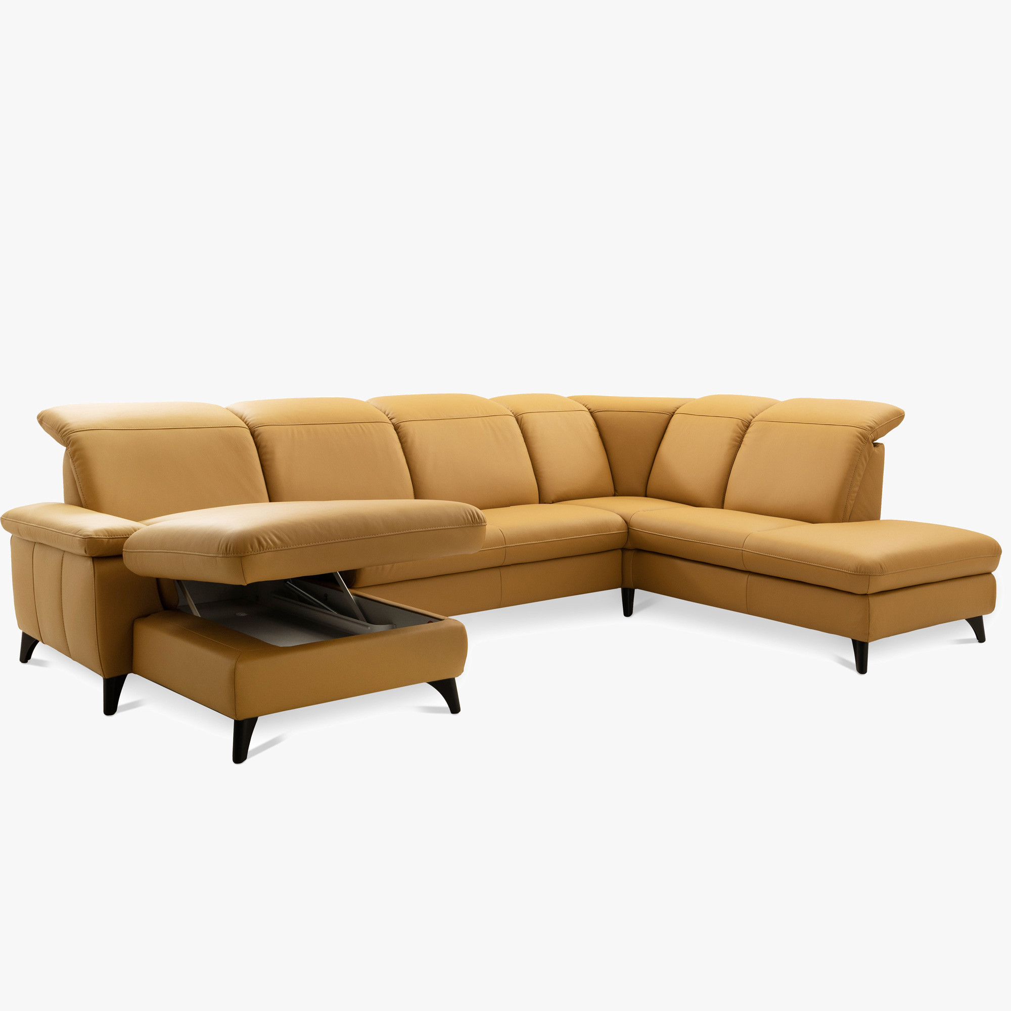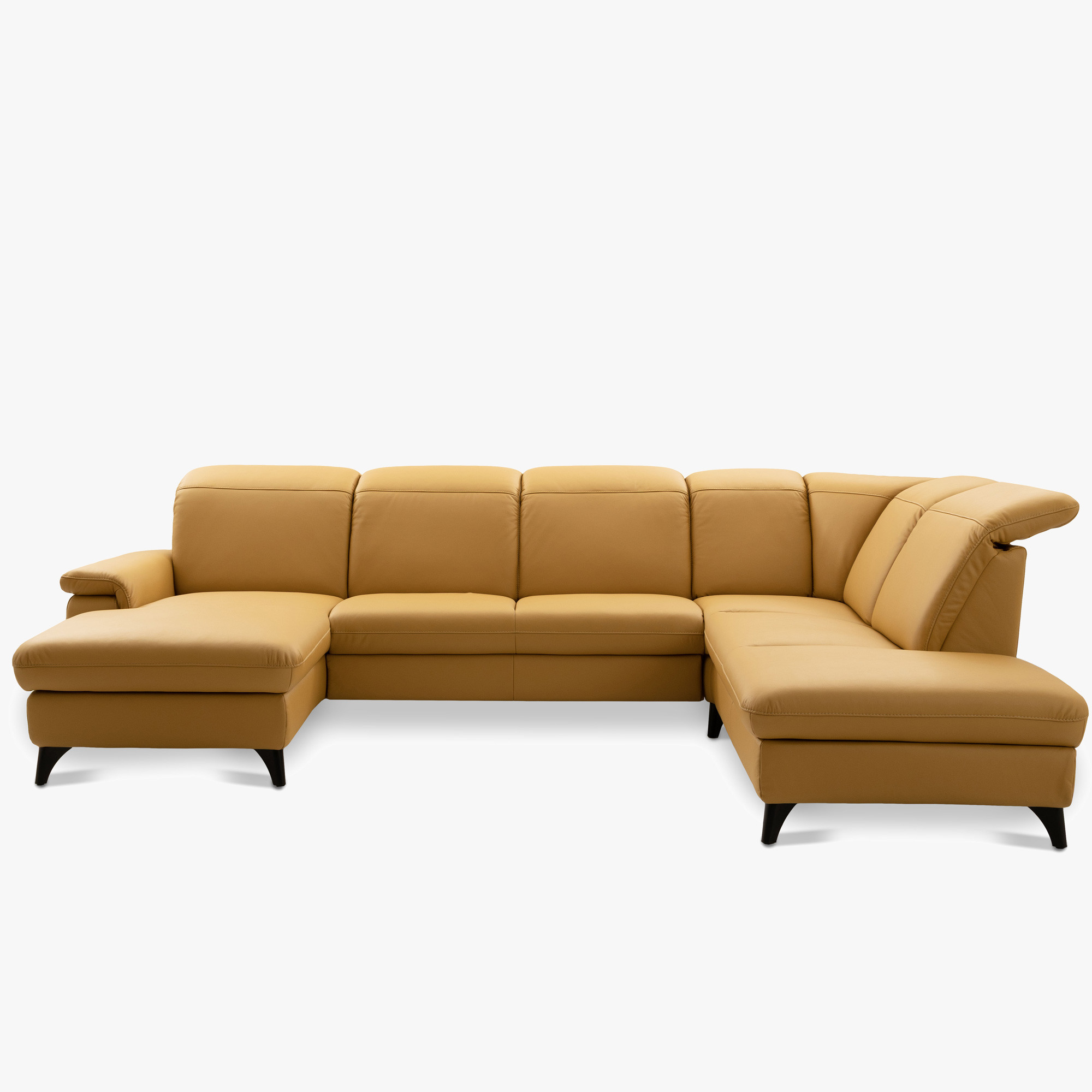 Elegant Schwarze Metallbeine Die Höhe von 12 cm unterstreicht das moderne Aussehen der gesamten Garnitur und erleichtert die Reinigung unter dem Sofa. Die Garnitur ist auch in einer Stoffausführung erhältlich. Das Modell auf dem Foto (in Punch Dijon Leder) hat die Maße 230 × 336 × 174 cm und eine Sitzhöhe von 46 cm. In den linken Teil des Endelements kann optional hinzugefügt werden Speicherplatz gegen Aufpreis. Das Sofa Magma bietet den Luxus, den Sie verdienen – und die Qualität, die jahrelang hält.