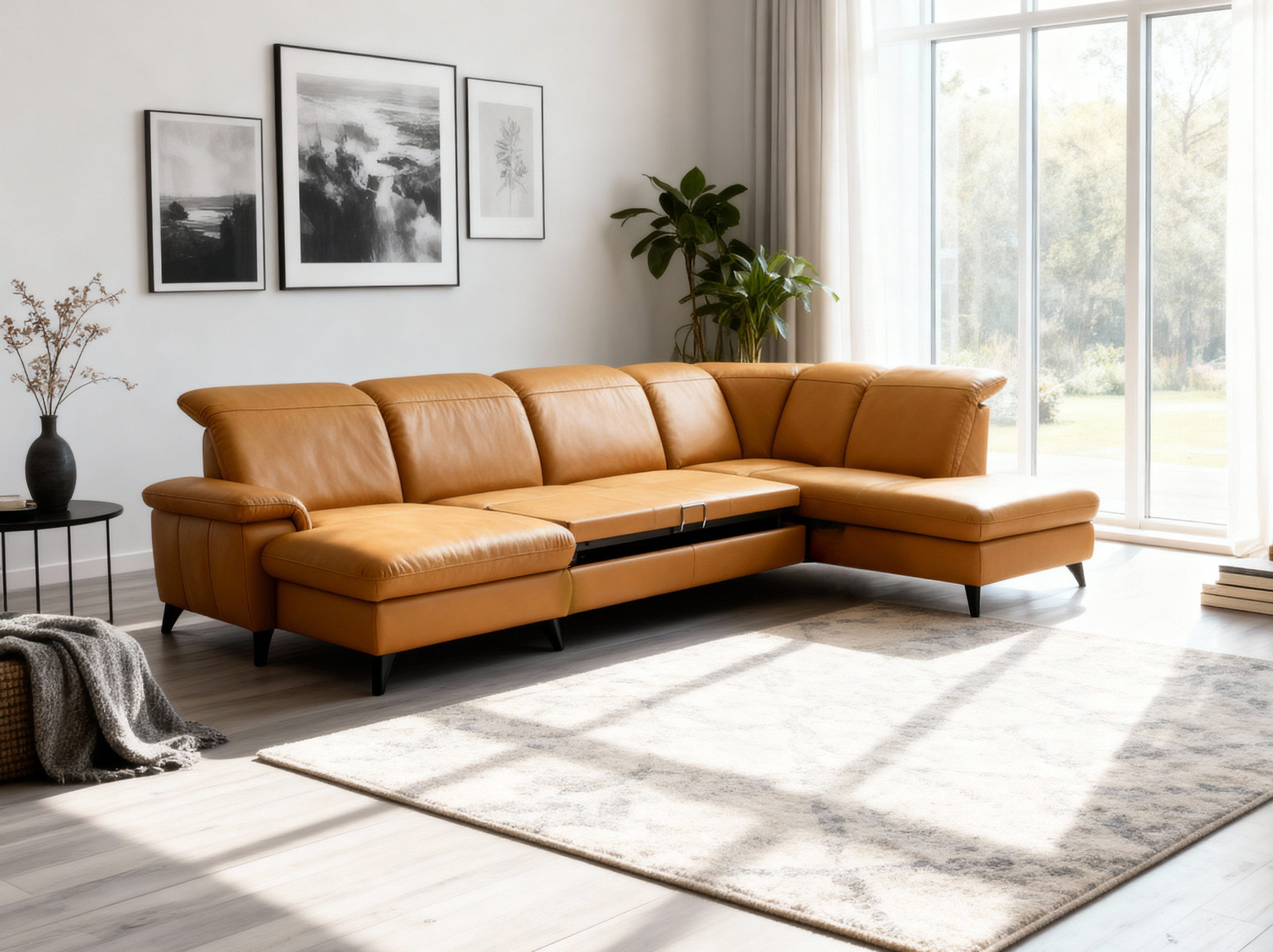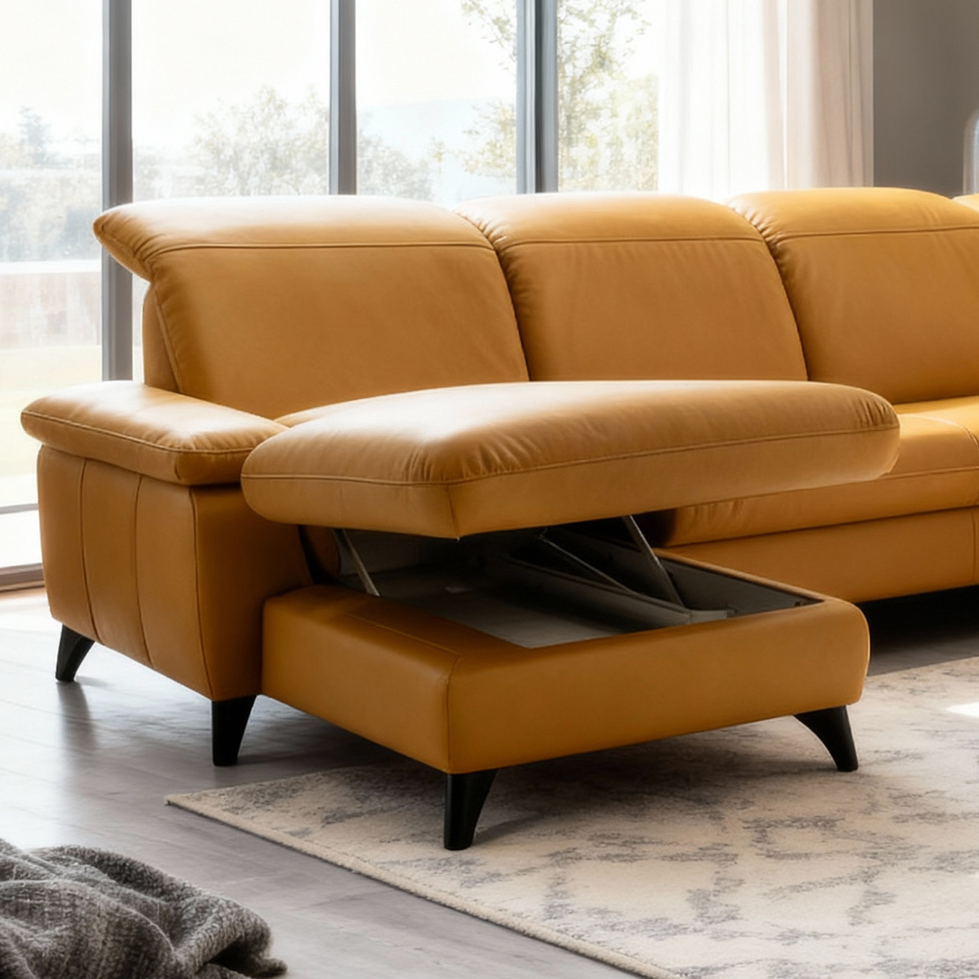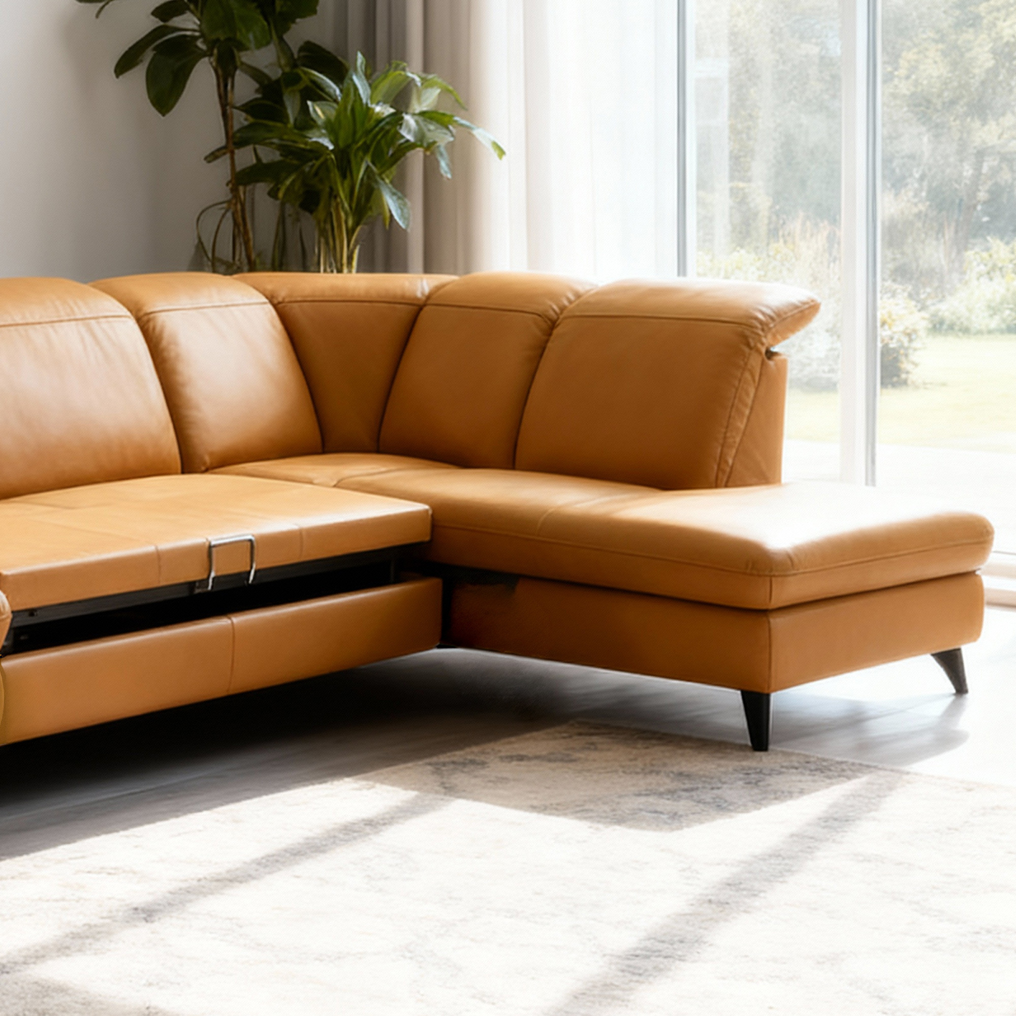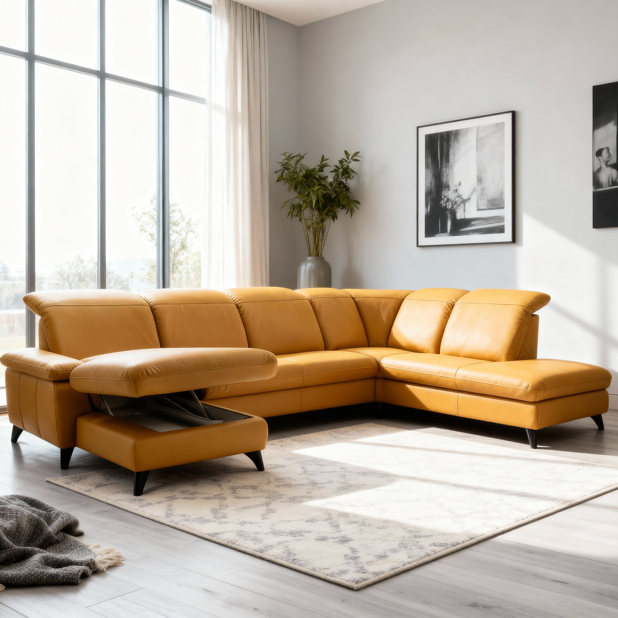 Elegant Schwarze Metallbeine Die Höhe von 12 cm unterstreicht das moderne Aussehen der gesamten Garnitur und erleichtert die Reinigung unter dem Sofa. Die Garnitur ist auch in einer Stoffausführung erhältlich. Das Modell auf dem Foto (in Punch Dijon Leder) hat die Maße 230 × 336 × 174 cm und eine Sitzhöhe von 46 cm. In den linken Teil des Endelements kann optional hinzugefügt werden Speicherplatz gegen Aufpreis. Das Sofa Magma bietet den Luxus, den Sie verdienen – und die Qualität, die jahrelang hält.