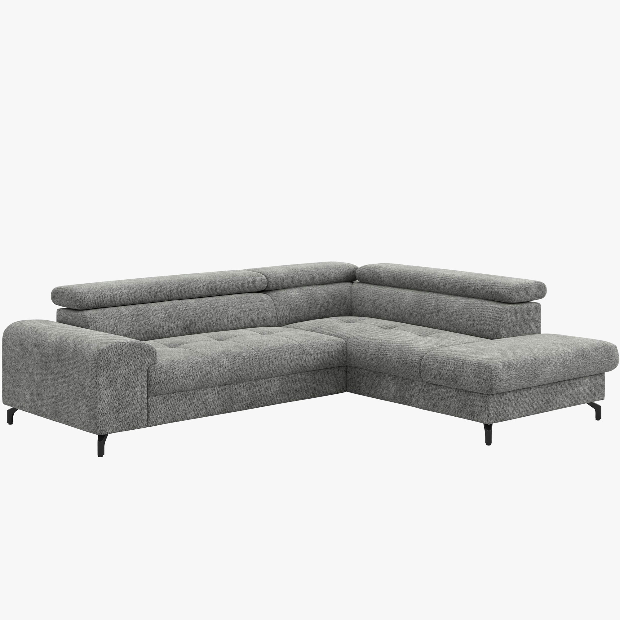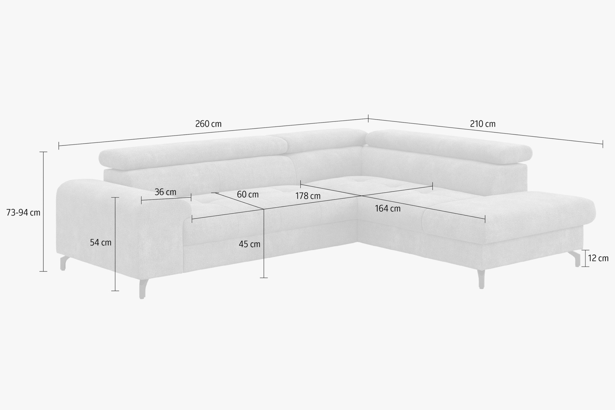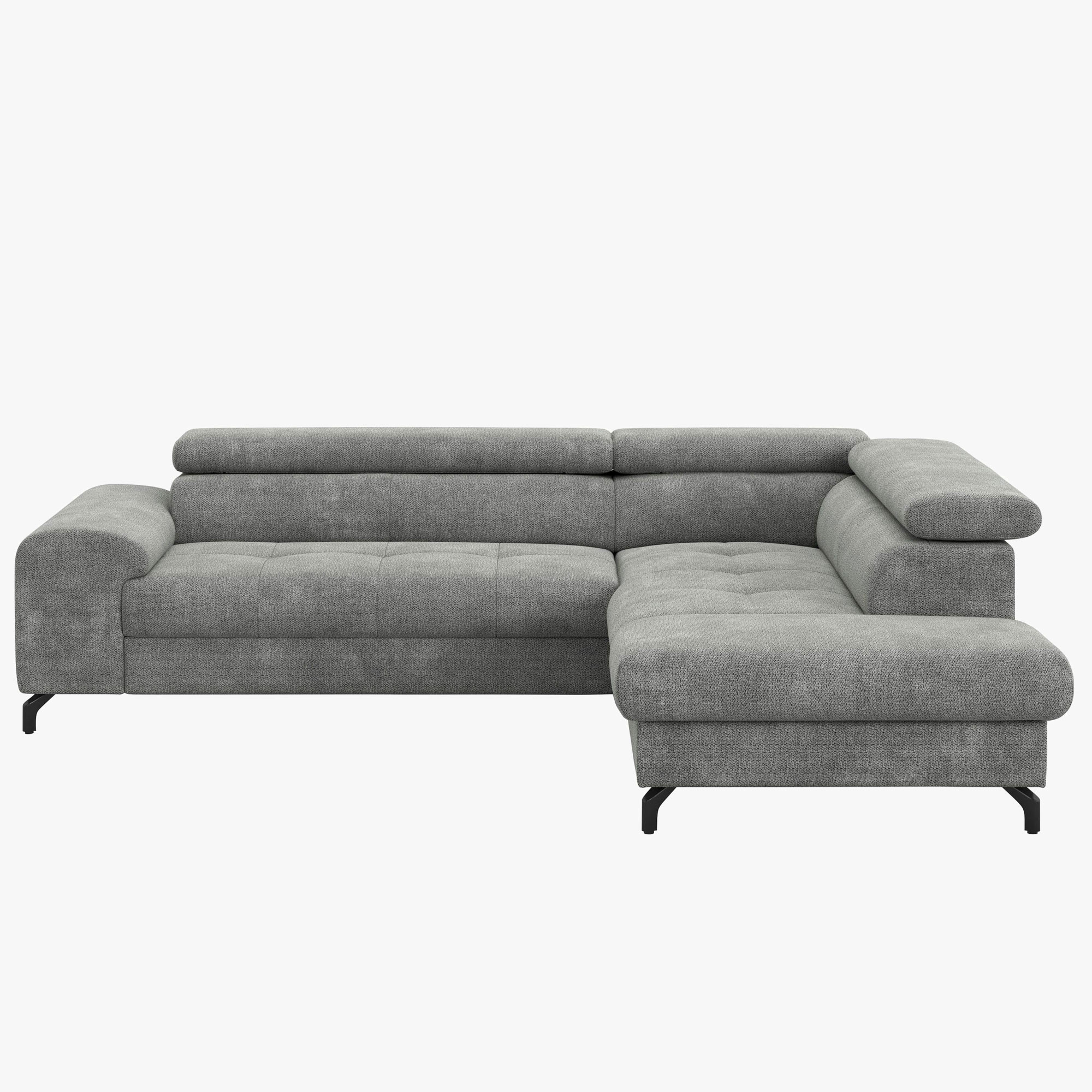 Dieses Ecksofa in L-Form hat eine Breite von 260 cm und ist mit individuell verstellbaren Kopfstützen ausgestattet, die optimalen Halt und maximale Entspannung bieten. Metallfüße im Industriestil aus schwarzem Stahlrahmen verleihen dem Sofa ein extravagantes Aussehen und sorgen für Stabilität. Das Sofa ist mit hochwertigem Material mit feiner und weicher Struktur bezogen, wobei die maximale Belastbarkeit pro Sitz 120 kg beträgt. Die PUR-Schaumfüllung garantiert lange Lebensdauer und angenehmen Sitzkomfort. Der Ottomane ist aus Sicht von vorne rechts orientiert. Jedes Stück wird sorgfältig handgefertigt, was eine hohe Verarbeitungsqualität sicherstellt. Mit diesem Ecksofa gehört Platzmangel beim Sitzen der Vergangenheit an!