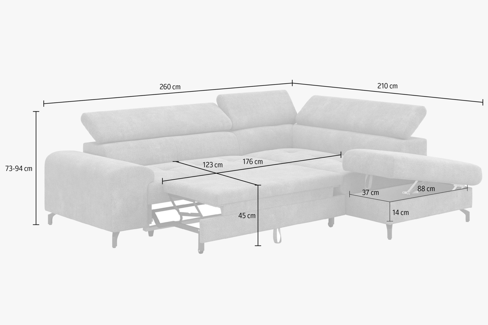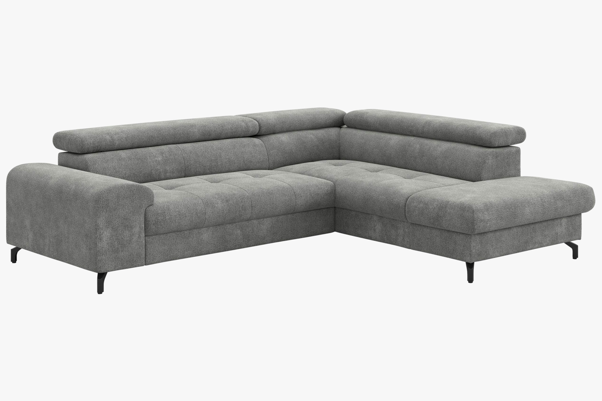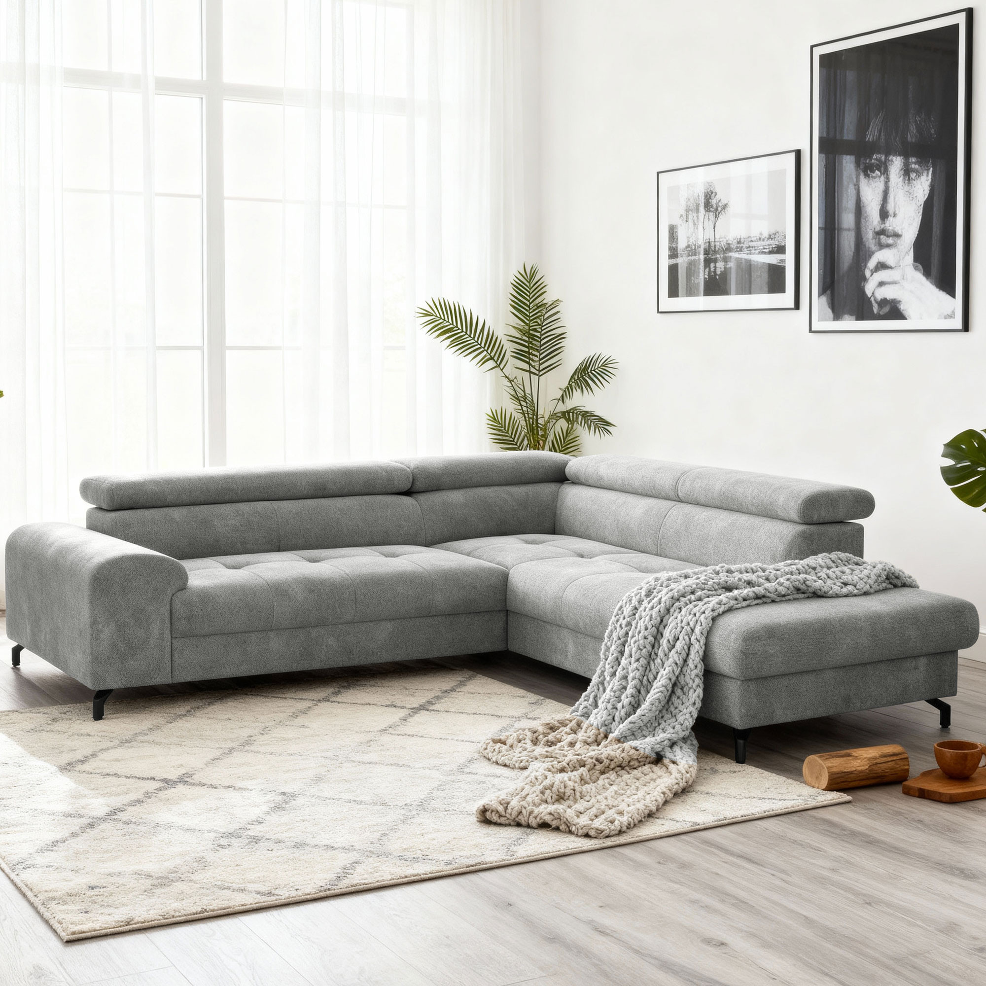 Dieses Ecksofa in L-Form hat eine Breite von 260 cm und ist mit individuell verstellbaren Kopfstützen ausgestattet, die optimalen Halt und maximale Entspannung bieten. Metallfüße im Industriestil aus schwarzem Stahlrahmen verleihen dem Sofa ein extravagantes Aussehen und sorgen für Stabilität. Das Sofa ist mit hochwertigem Material mit feiner und weicher Struktur bezogen, wobei die maximale Belastbarkeit pro Sitz 120 kg beträgt. Die PUR-Schaumfüllung garantiert lange Lebensdauer und angenehmen Sitzkomfort. Der Ottomane ist aus Sicht von vorne rechts orientiert. Jedes Stück wird sorgfältig handgefertigt, was eine hohe Verarbeitungsqualität sicherstellt. Mit diesem Ecksofa gehört Platzmangel beim Sitzen der Vergangenheit an!