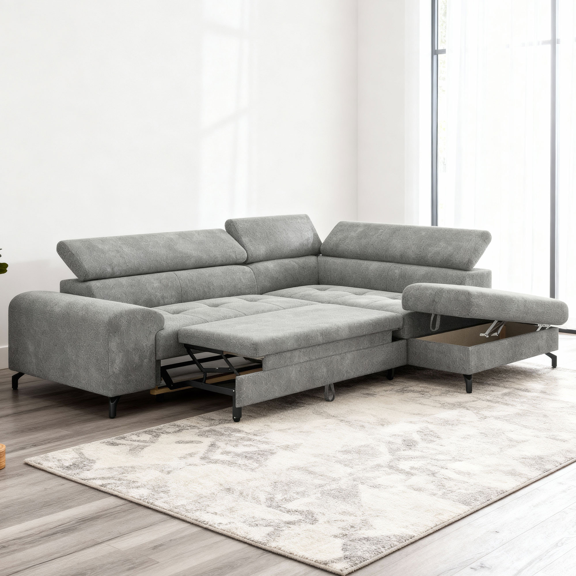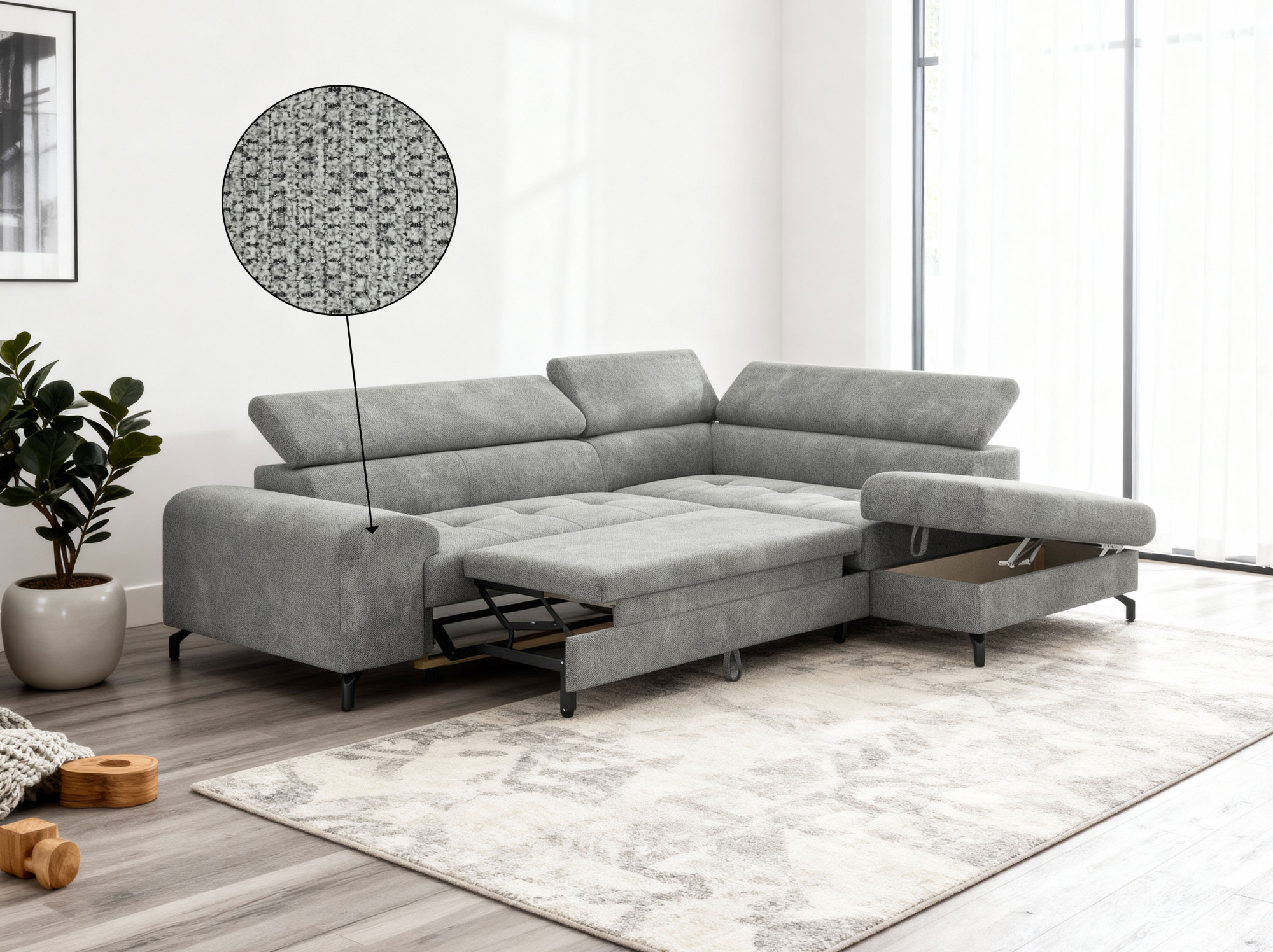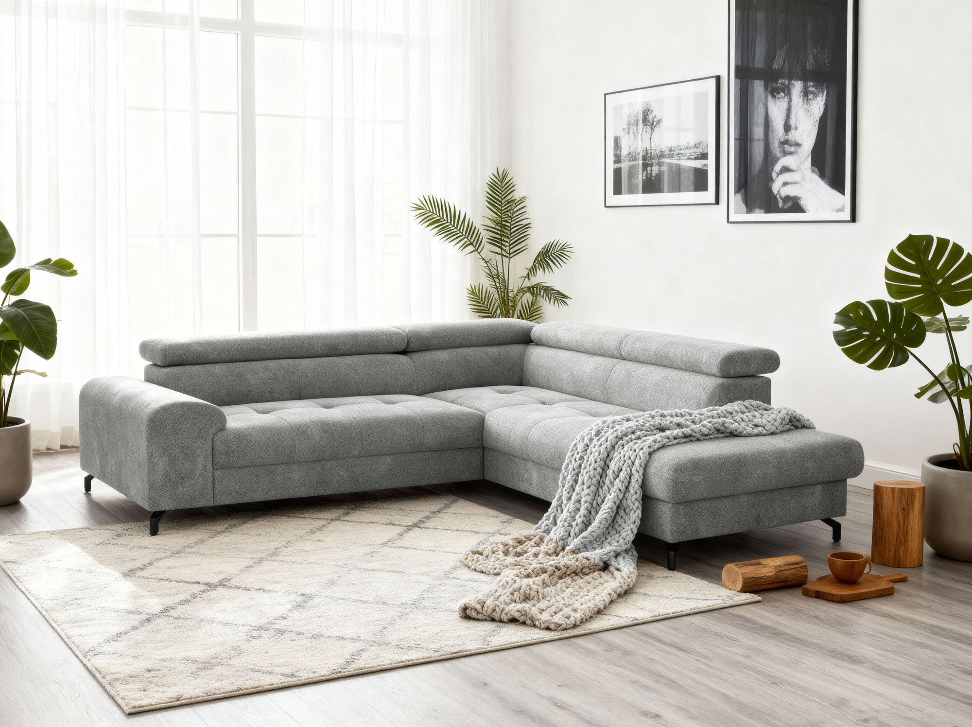 Suchen Sie praktische und stilvolle Lösungen für Ihr Wohnzimmer? Dieses Ecksofa mit Schlaffunktion ist die ideale Wahl für alle, die Komfort, Funktionalität und modernes Design kombinieren möchten. Dank des praktischen Klappmechanismus verwandeln Sie das Sofa im Handumdrehen in ein bequemes Gästebett oder gewinnen eine XXL-Sitzfläche zum Entspannen beim Filmeschauen. Der integrierte Stauraum unter dem Sitz bietet ausreichend Platz für Decken, Kissen oder andere wichtige Dinge, was besonders für kleinere Räume eine perfekte Lösung ist. Das Sofa ist mit hochwertigen Wellenfedern gefertigt, die langanhaltende Elastizität und Sitzkomfort garantieren.