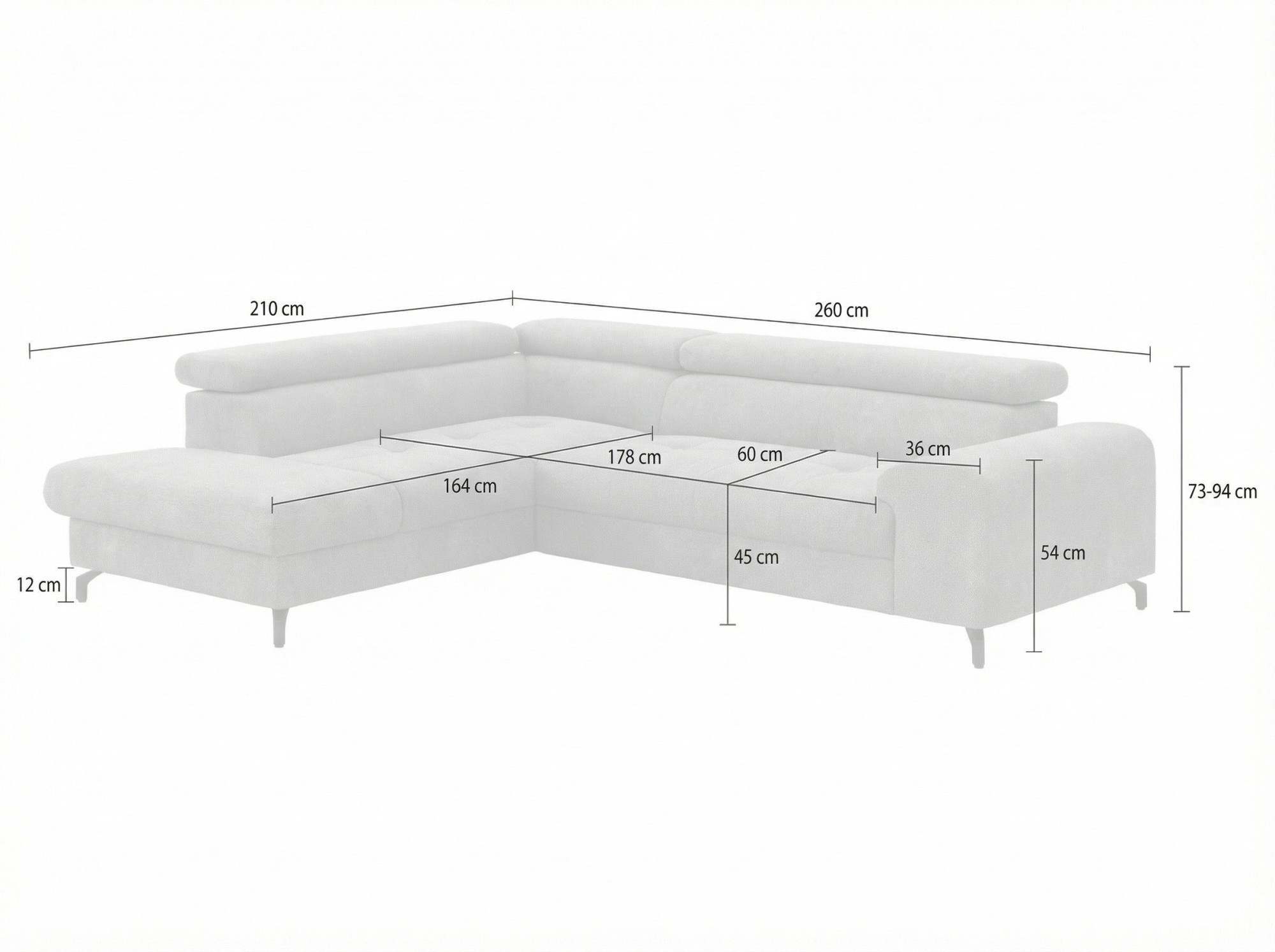 Dieses eckige Sofa in L-Form hat eine Breite von 260 cm und ist mit individuell verstellbaren Kopfstützen ausgestattet, die optimale Unterstützung und maximalen Komfort bieten. Metallfüße im Industriestil aus schwarzem Stahlrahmen verleihen dem Sofa ein extravagantes Aussehen und gewährleisten Stabilität. Das Sofa ist mit hochwertigem Material bezogen, das eine feine und weiche Struktur aufweist. Die maximale Belastbarkeit pro Sitzplatz beträgt 120 kg. Die PUR-Schaumfüllung garantiert lange Lebensdauer und angenehmes Sitzen. Der Ottoman ist aus Frontsicht nach rechts orientiert. Jedes Stück wird handgefertigt, was eine hohe Verarbeitungsqualität sicherstellt. Mit diesem Ecksofa werden Sie nie wieder Platzmangel beim Sitzen haben!