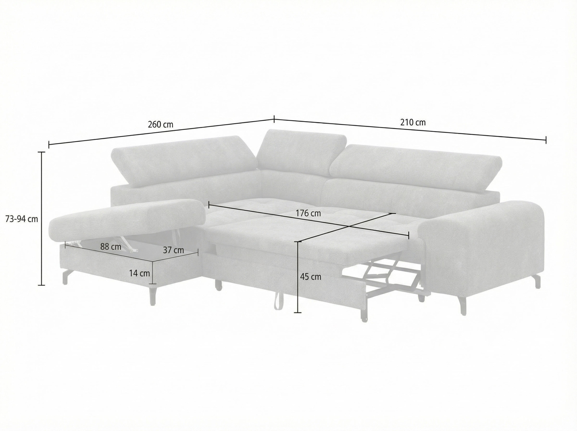 - Ist das Sofa für kleine Räume geeignet? Ja, die Kombination aus Ausklappmechanismus und Stauraum macht dieses Sofa zur idealen Lösung für kleinere Wohnzimmer oder Wohnräume, in denen Sie jeden Meter optimal nutzen möchten.