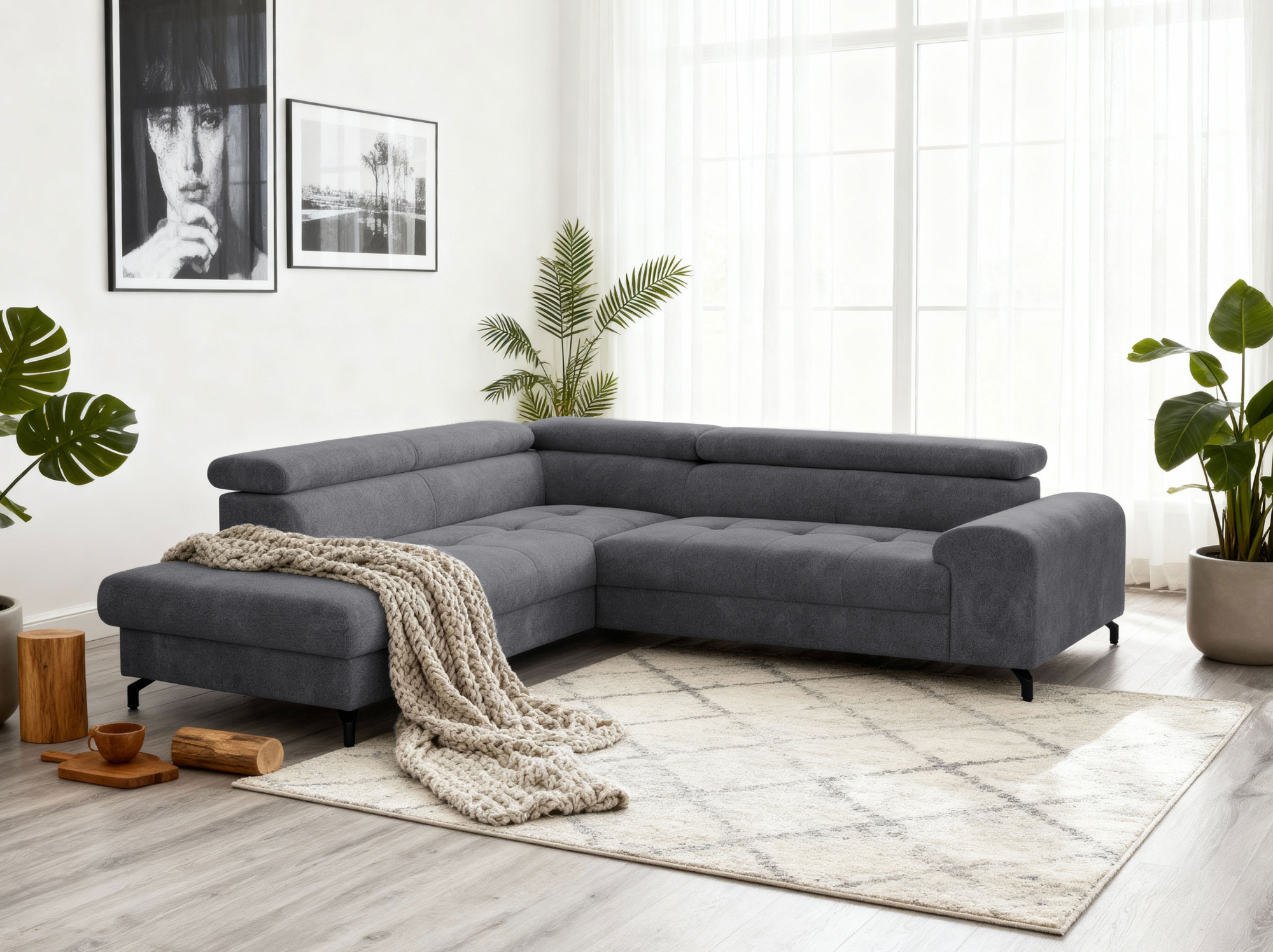 Suchen Sie praktische und stilvolle Lösungen für Ihr Wohnzimmer? Dieses Ecksofa mit Schlaffunktion ist die ideale Wahl für alle, die Komfort, Funktionalität und modernes Design kombinieren möchten. Dank des praktischen Ausklappmechanismus verwandeln Sie das Sofa im Handumdrehen in ein bequemes Gästebett oder erhalten eine XXL-Sitzfläche zum Entspannen beim Filme schauen. Der integrierte Stauraum unter der Sitzfläche bietet ausreichend Platz für Decken, Kissen oder weitere benötigte Dinge – eine perfekte Lösung vor allem für kleinere Räume. Das Sofa ist mit einer hochwertigen Wellenfederung gefertigt, die für langanhaltende Elastizität und Sitzkomfort sorgt.