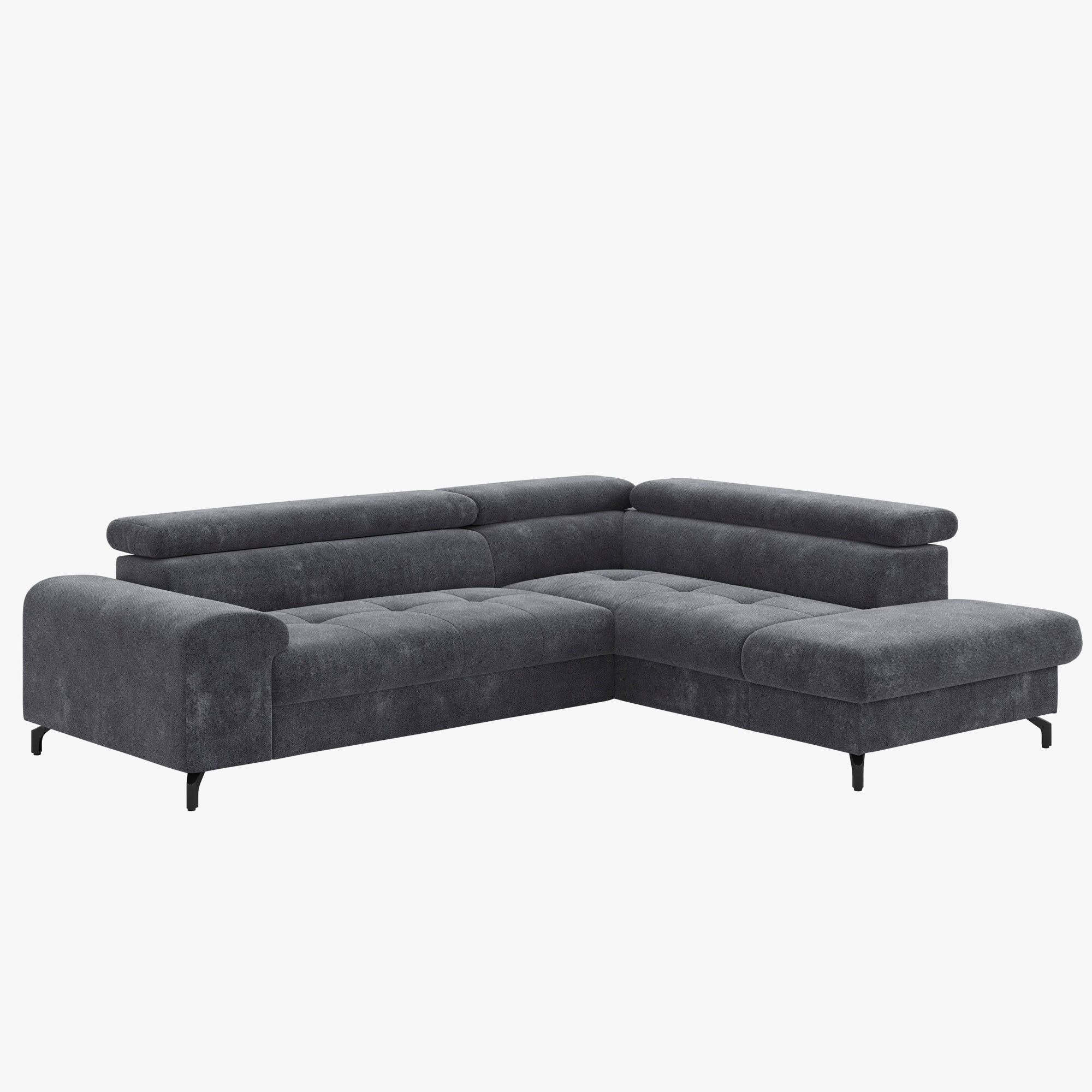 Dieses Ecksofa in L-Form hat eine Breite von 260 cm und ist mit individuell verstellbaren Kopfstützen ausgestattet, die optimale Unterstützung und maximale Entspannung bieten. Metallbeine im Industriestil aus schwarzem Stahlrahmen verleihen dem Sofa ein extravagantes Aussehen und sorgen für Stabilität. Das Sofa ist mit hochwertigem Material und weicher, feiner Struktur bezogen, wobei die maximale Belastbarkeit pro Sitz 120 kg beträgt. Die PUR-Schaumfüllung garantiert lange Lebensdauer und angenehmen Sitzkomfort. Die Ottomane ist aus vorderer Sicht nach rechts orientiert. Jedes Stück wird sorgfältig von Hand gefertigt, was eine hohe Verarbeitungsqualität garantiert. Mit diesem Ecksofa müssen Sie nie wieder über zu wenig Sitzplatz nachdenken!