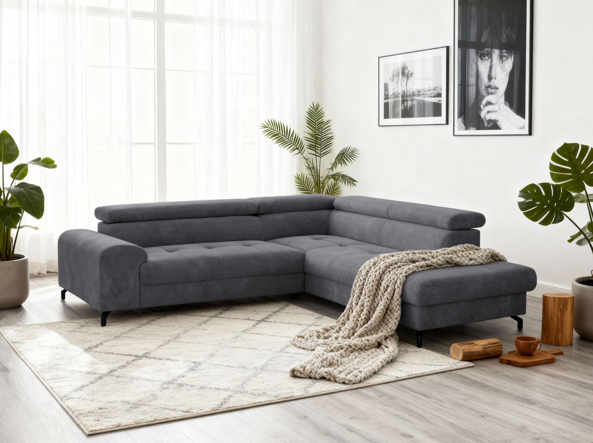 Suchen Sie praktische und stilvolle Lösungen für Ihr Wohnzimmer? Dieses Ecksofa mit Schlaffunktion ist die ideale Wahl für alle, die Komfort, Funktionalität und modernes Design kombinieren möchten. Dank des praktischen Ausziehmechanismus verwandeln Sie das Sofa im Handumdrehen in ein bequemes Gästebett oder erhalten eine XXL-Sitzfläche zum Entspannen beim Filmeschauen. Der integrierte Stauraum unter dem Sitz bietet ausreichend Platz für Decken, Kissen oder andere benötigte Dinge – eine perfekte Lösung besonders für kleinere Räume. Das Sofa ist mit einer hochwertigen Wellenfederung ausgestattet, die langanhaltende Elastizität und Sitzkomfort gewährleistet.