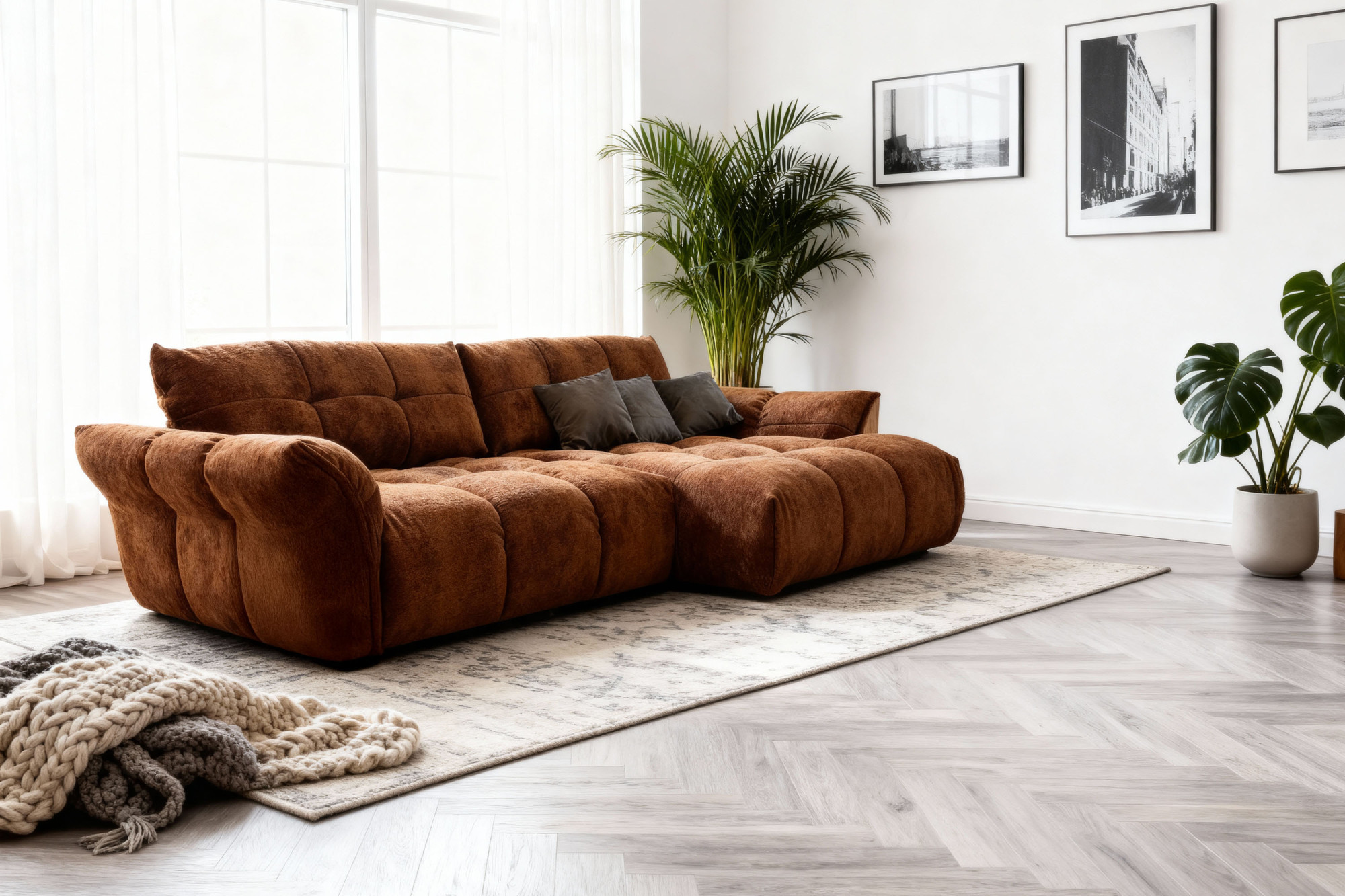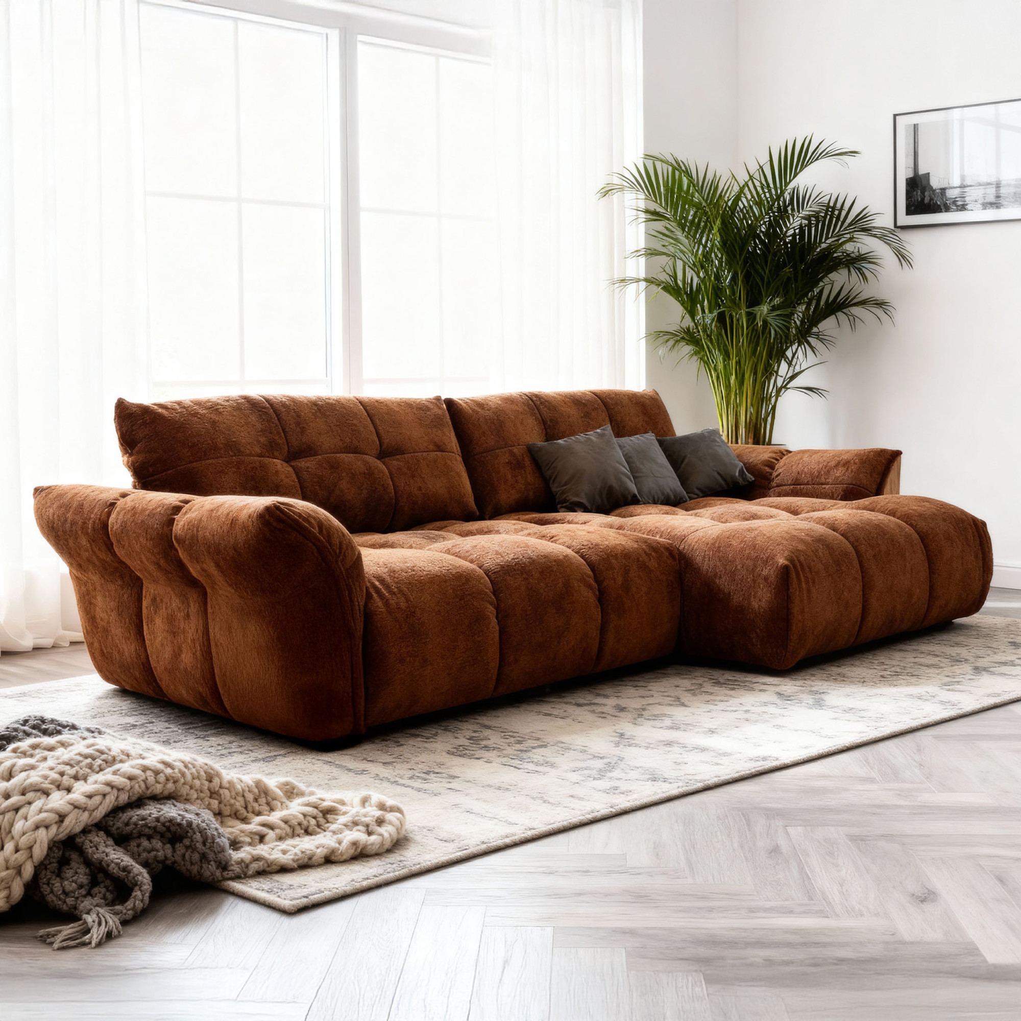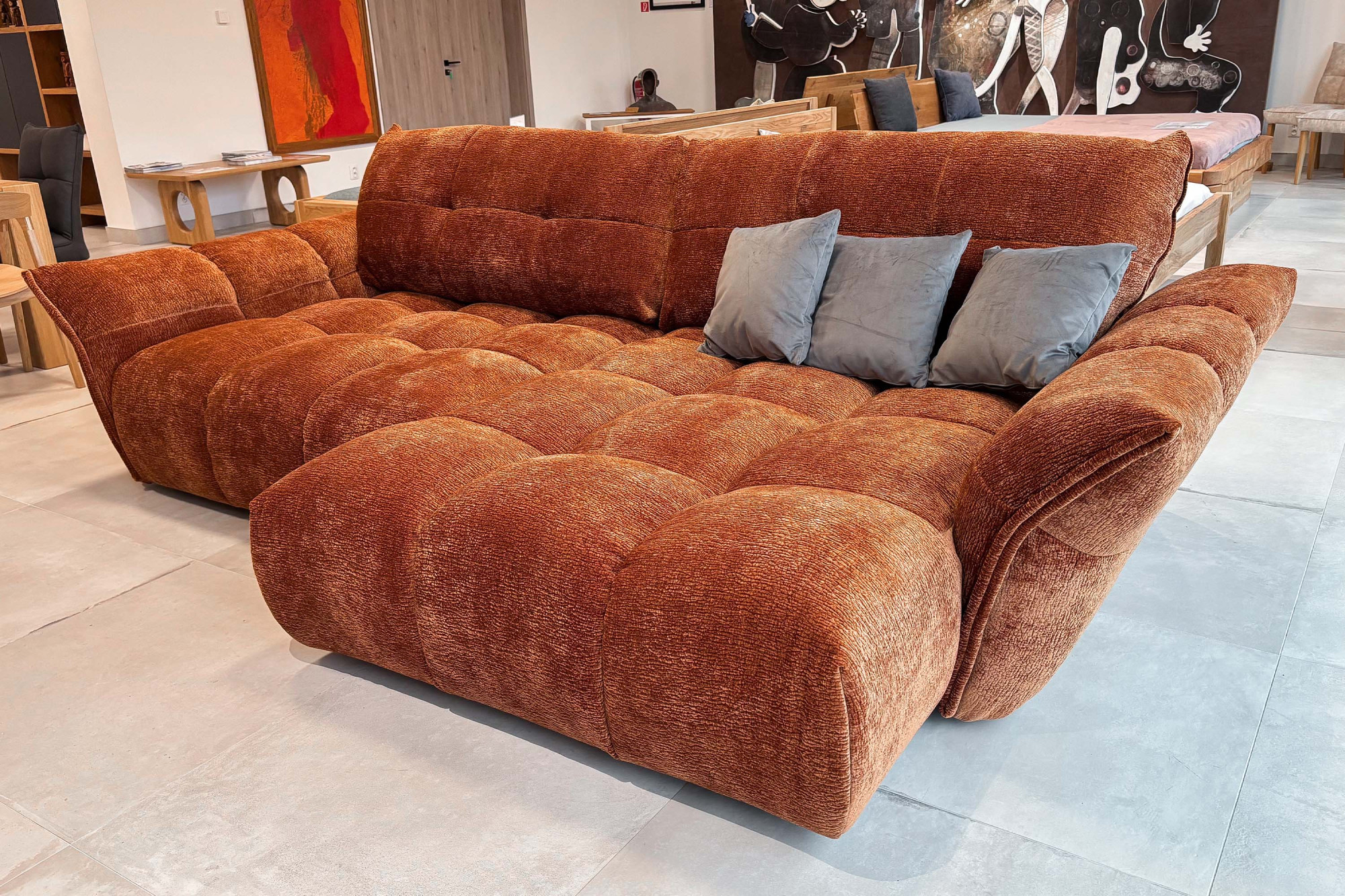 Auf dem Bild ist das Sofa in dem Stoff 2S Cloud Terra zu sehen, einem hochwertigen Stoff mit weicher Struktur und hoher Abriebfestigkeit – 100.000 Zyklen.