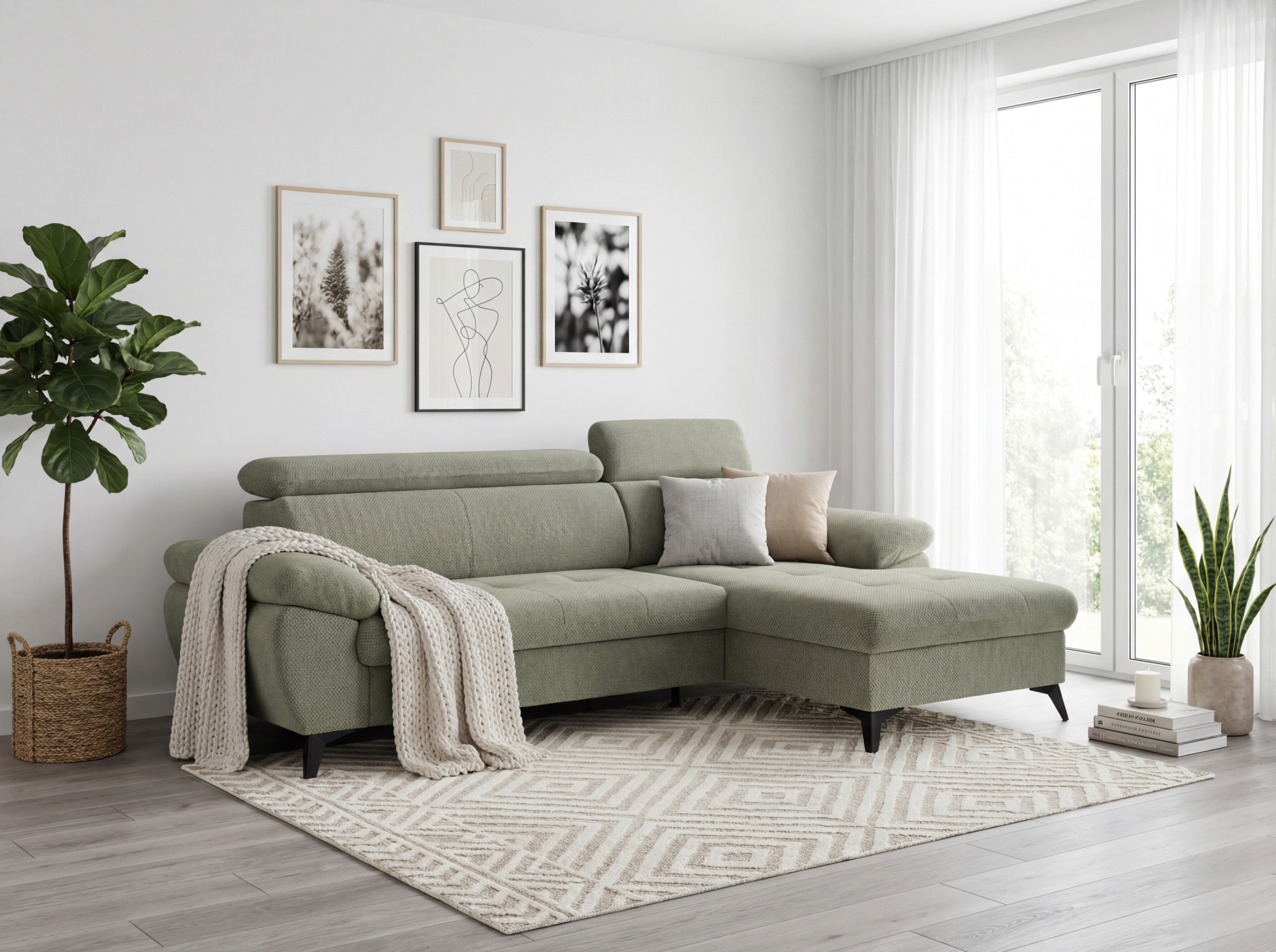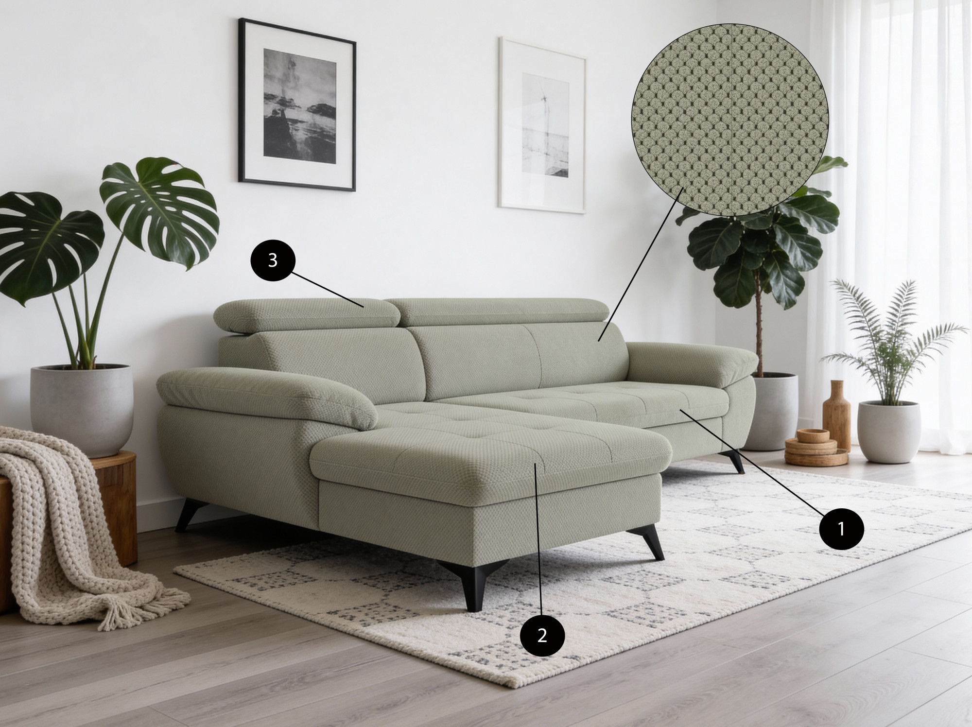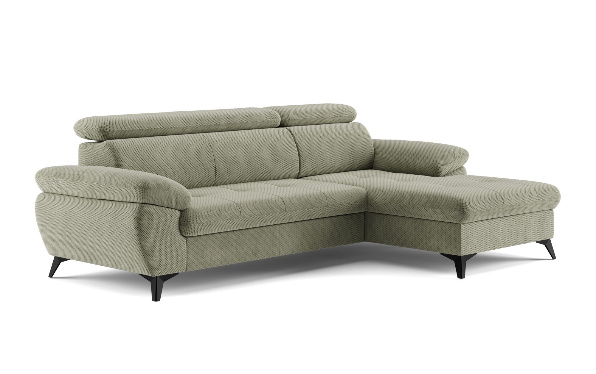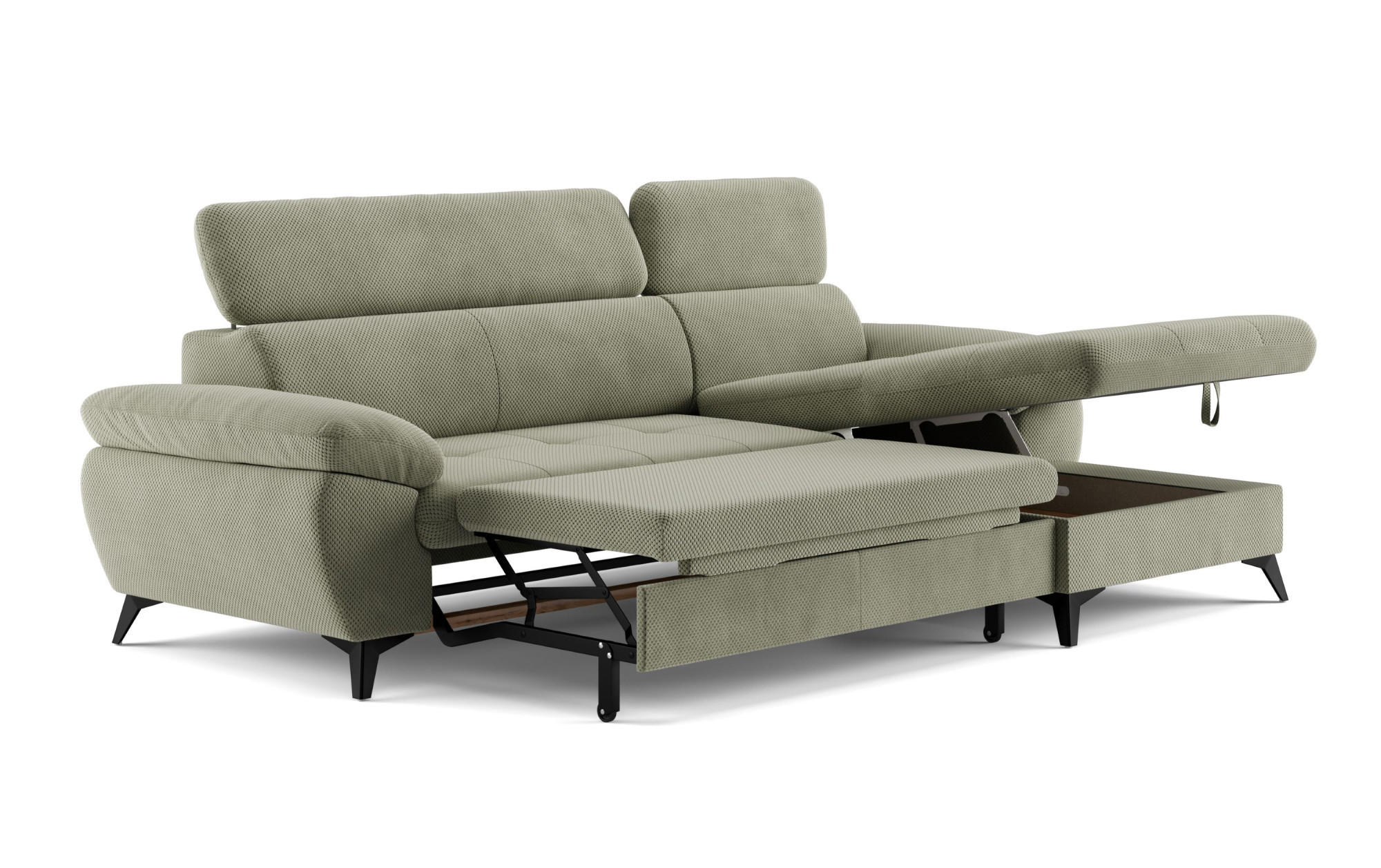 Zur Ausstattung dieses Ecksofas gehört auch die gelegentliche Schlaffunktion, die Sie bei Gästen oder wenn schnell ein bequemer Ruheplatz geschaffen werden soll, schätzen werden. Für noch mehr Komfort besteht der Sitz aus Schaumstoff mit unterschiedlichen Dichten und stählernen gewellten Federn, was ein ausgewogenes Verhältnis zwischen Weichheit und stabiler Unterstützung gewährleistet. Dank der höheren Metallfüße ist das Reinigen unter dem Sofa kein Problem, außerdem wirkt das Gesamtbild leicht und luftig.