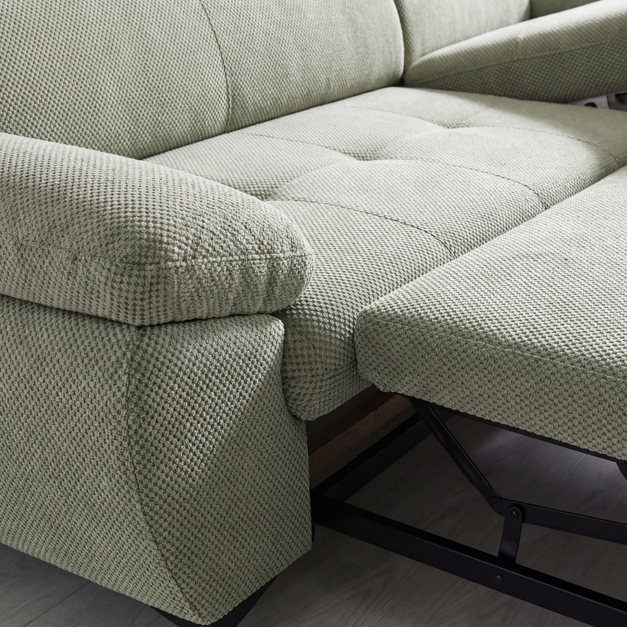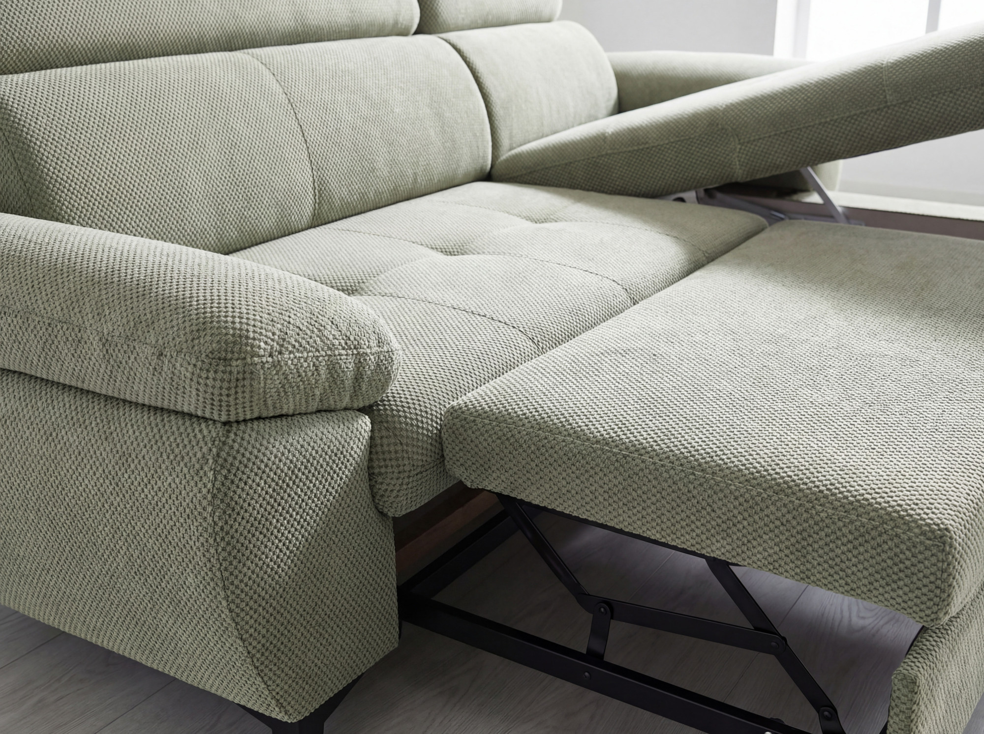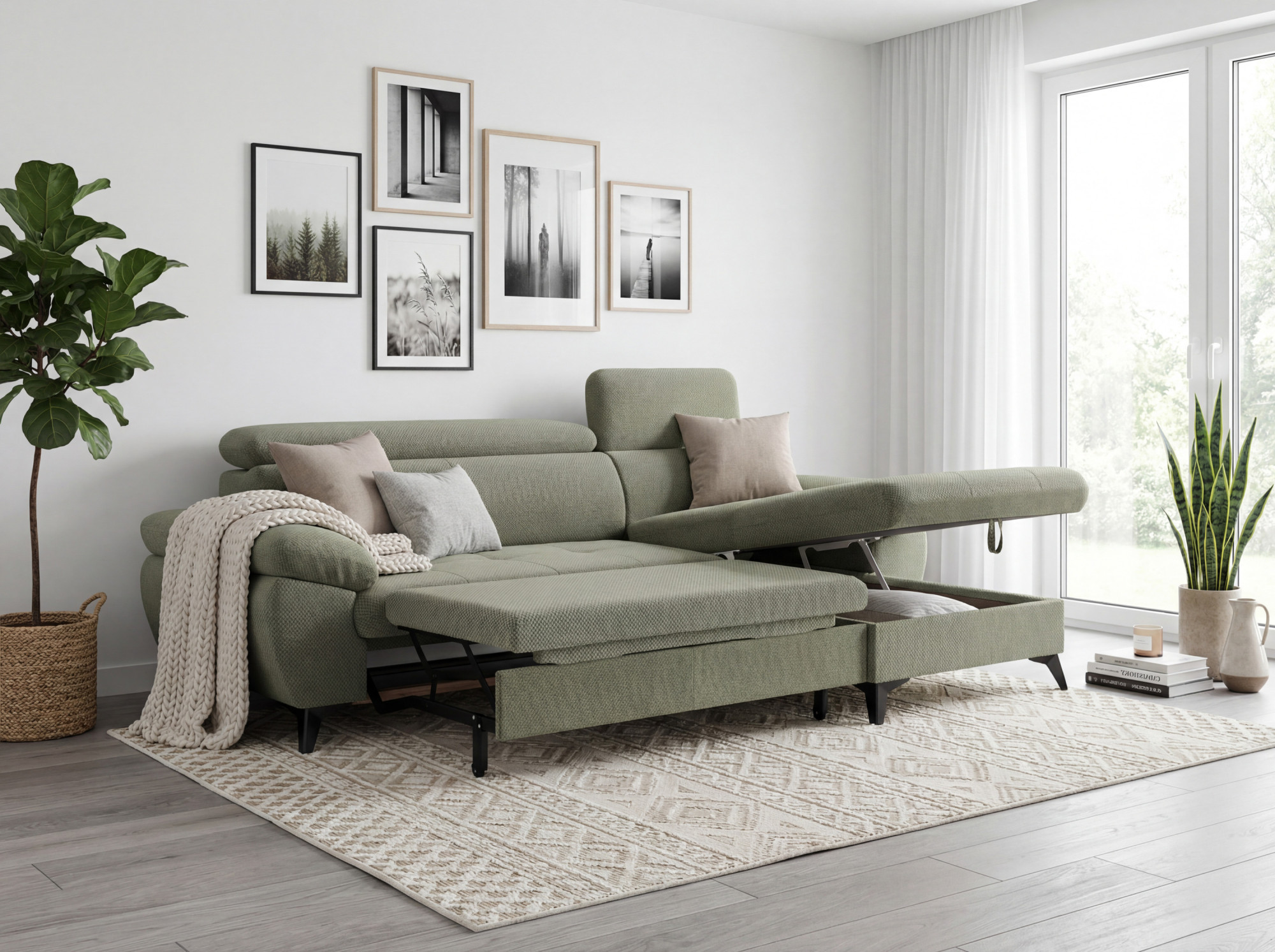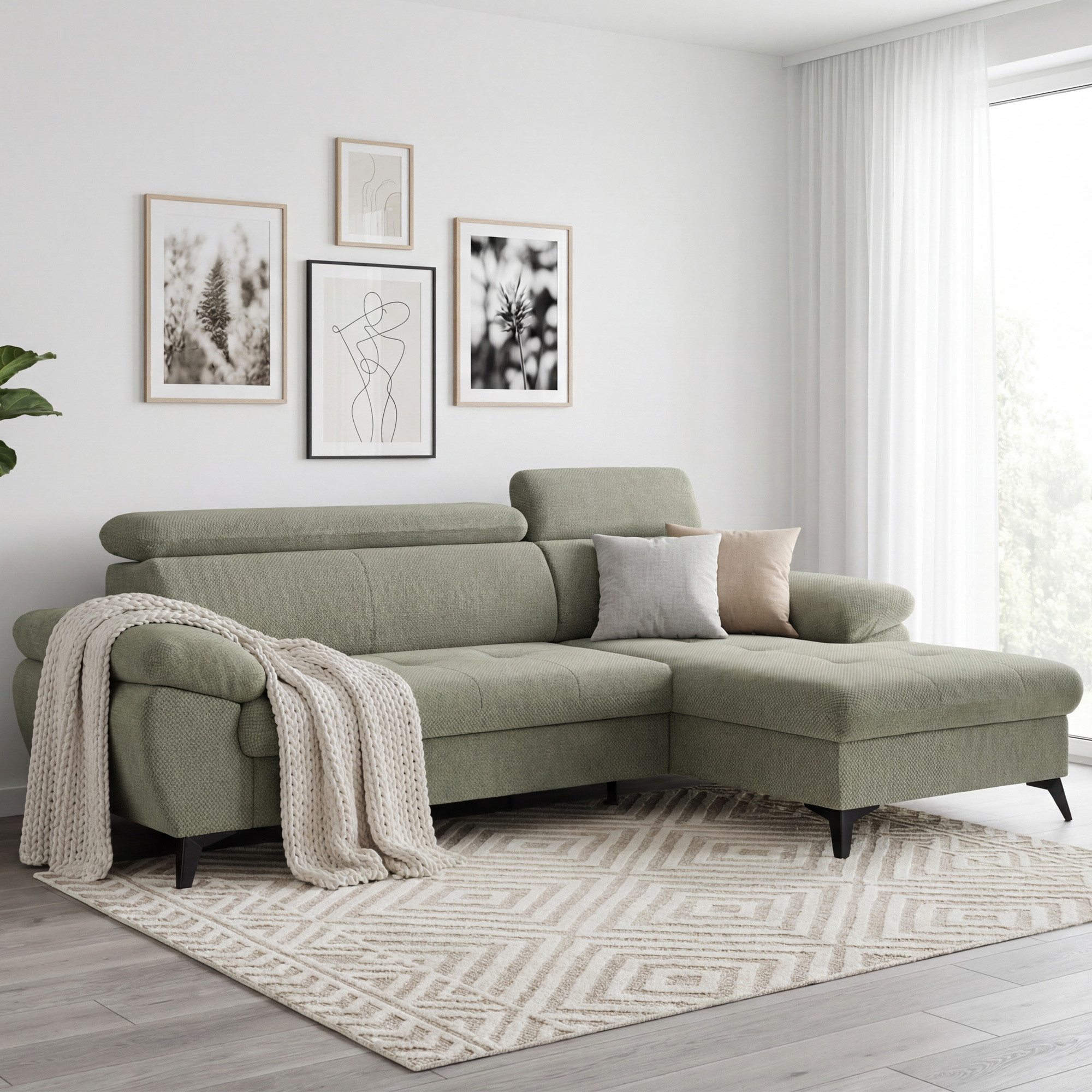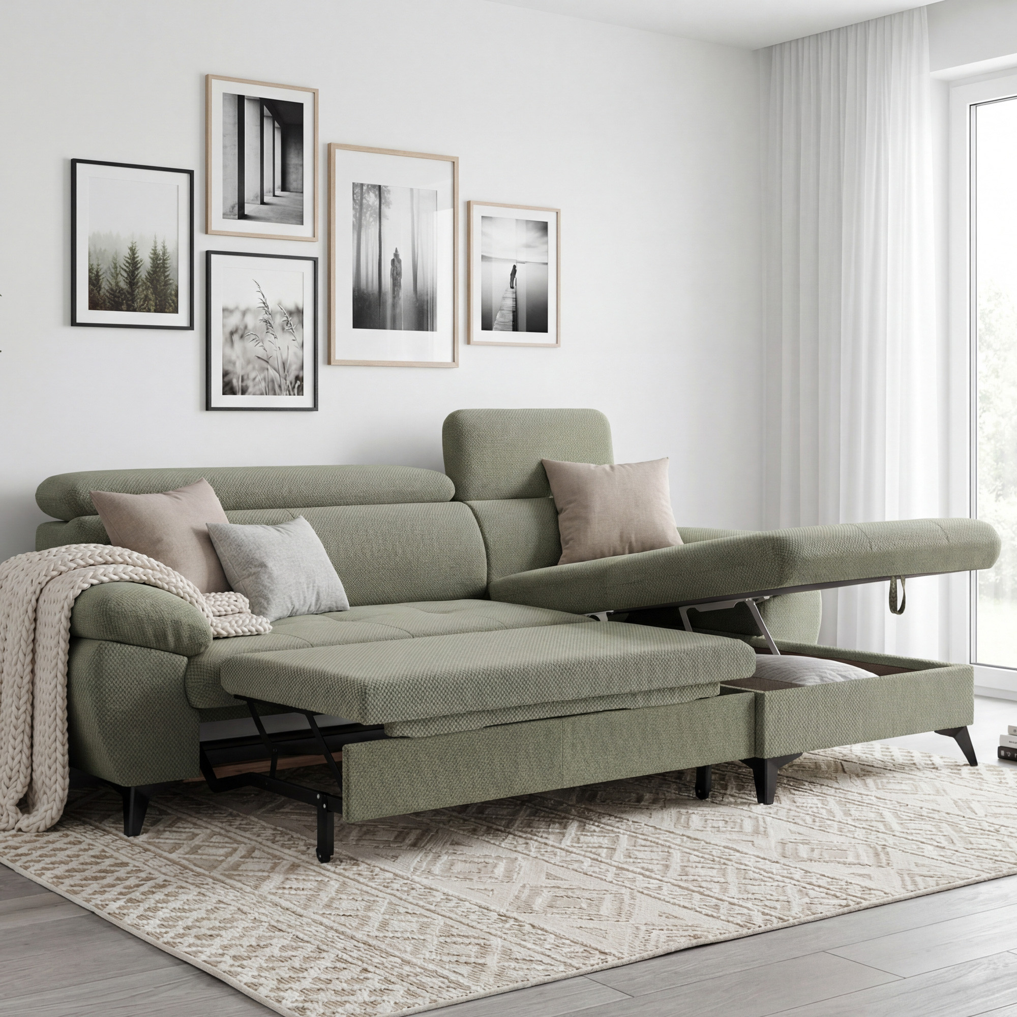 Zur Ausstattung dieses Ecksofas gehört auch die gelegentliche Schlaffunktion, die Sie bei Gästen oder wenn schnell ein bequemer Ruheplatz geschaffen werden soll, schätzen werden. Für noch mehr Komfort besteht der Sitz aus Schaumstoff mit unterschiedlichen Dichten und stählernen gewellten Federn, was ein ausgewogenes Verhältnis zwischen Weichheit und stabiler Unterstützung gewährleistet. Dank der höheren Metallfüße ist das Reinigen unter dem Sofa kein Problem, außerdem wirkt das Gesamtbild leicht und luftig.