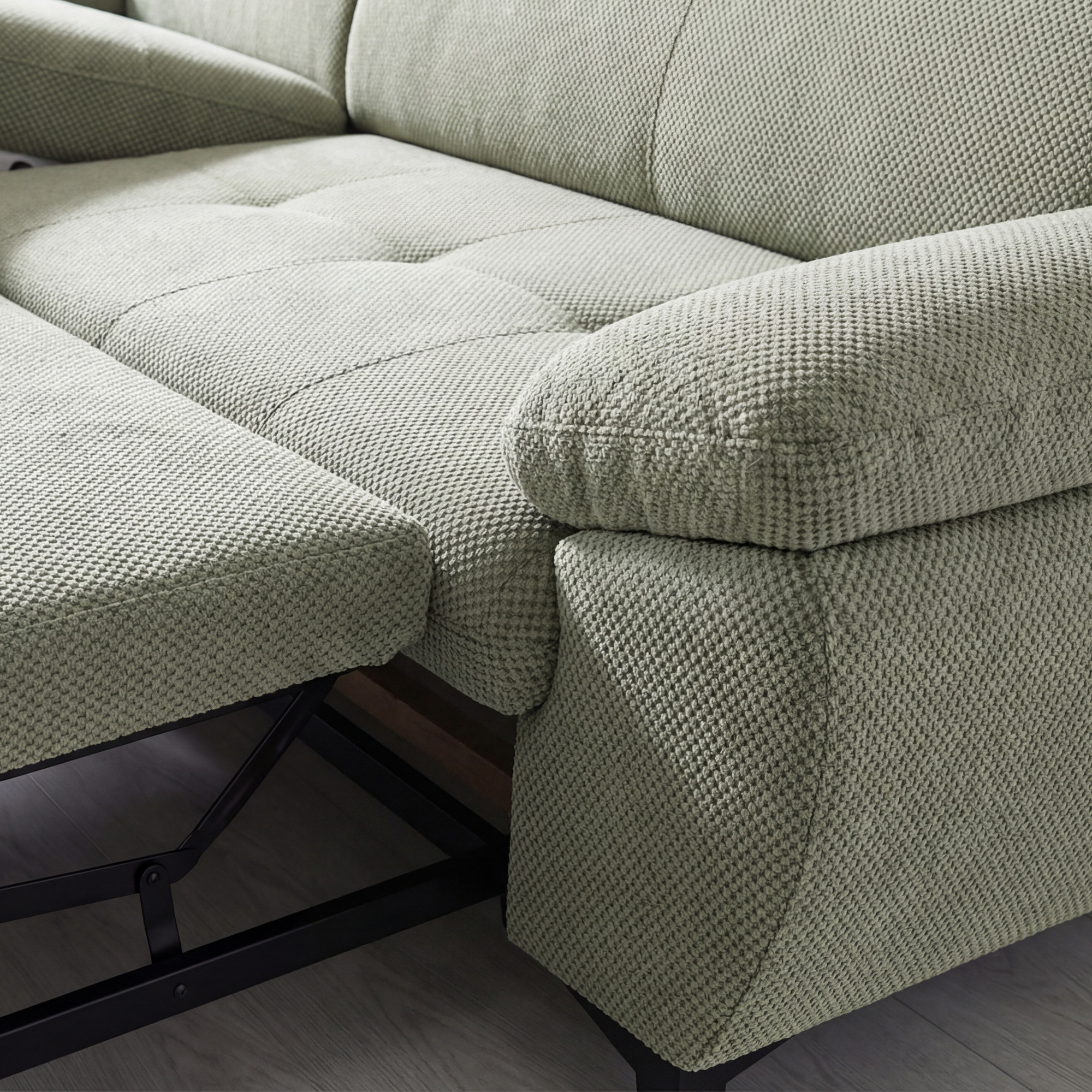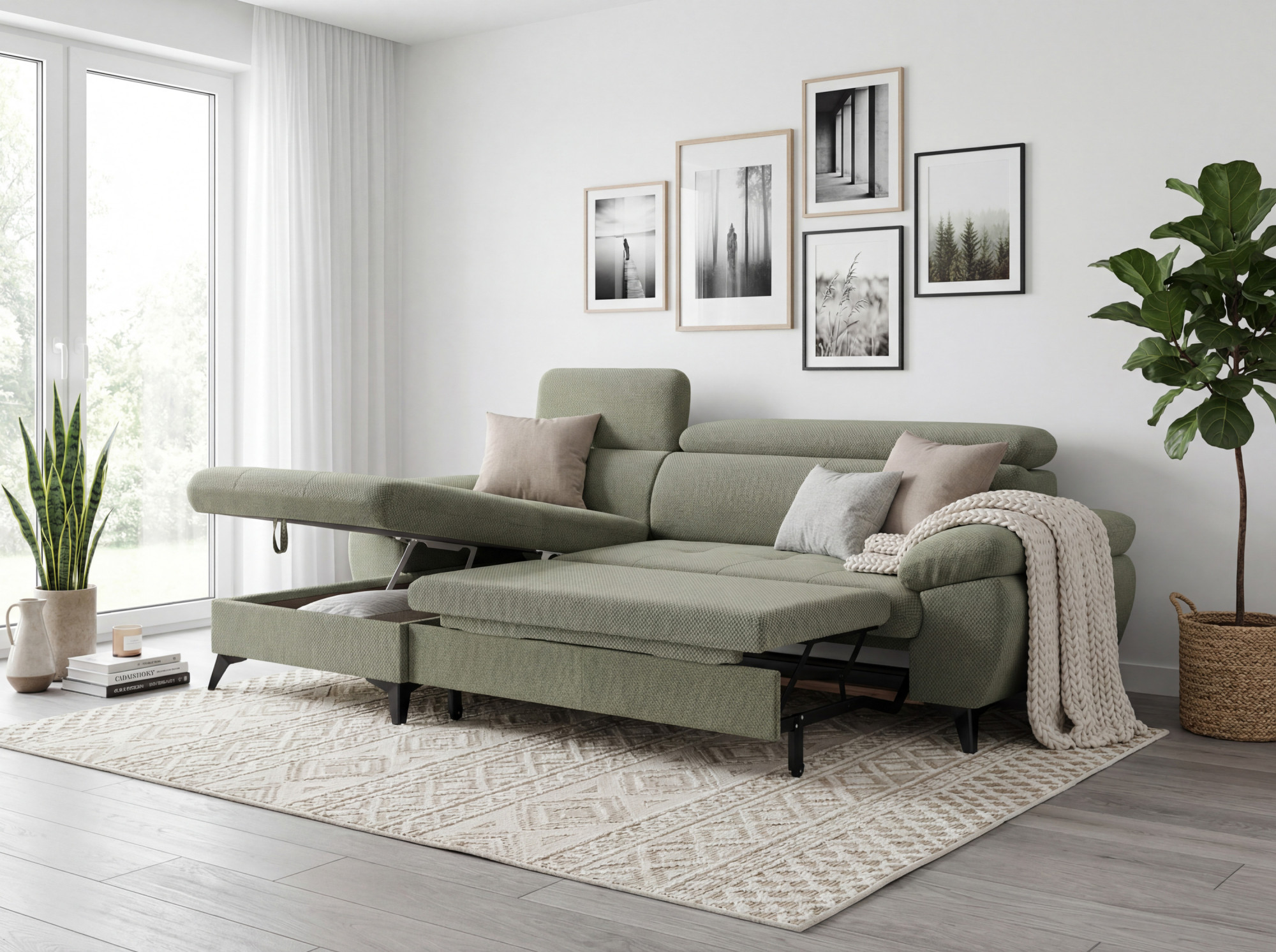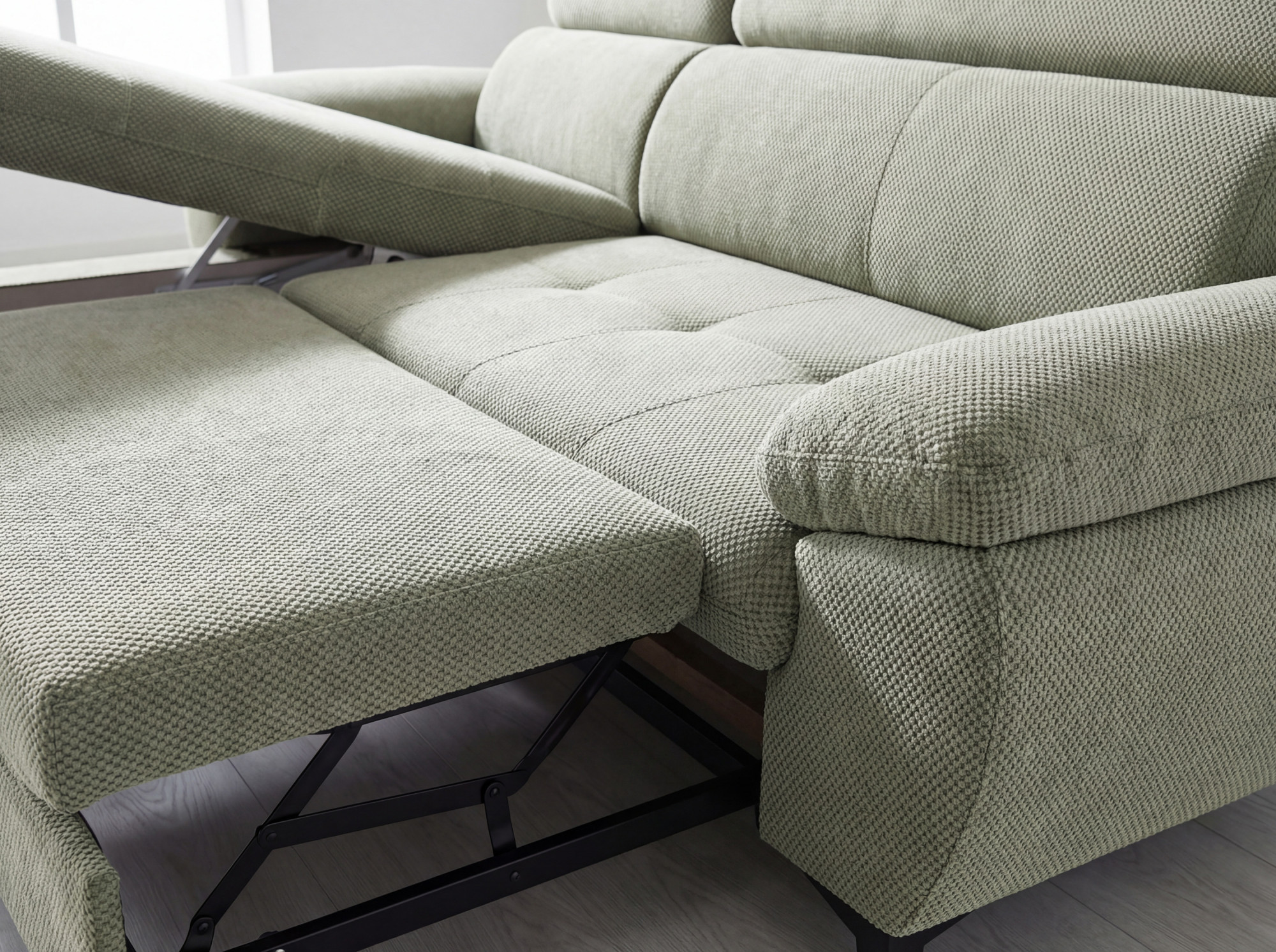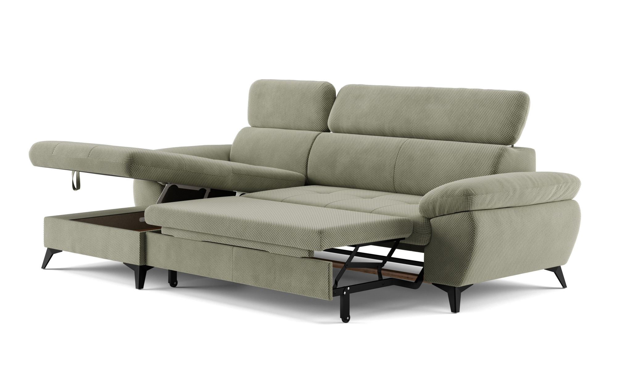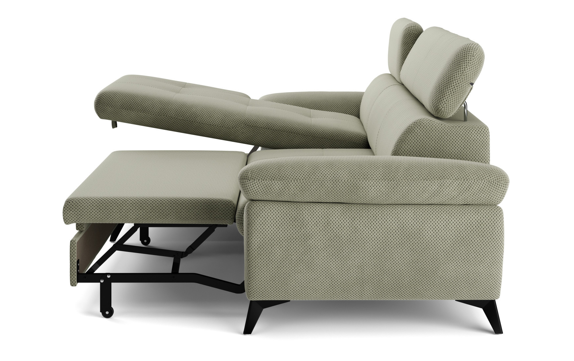 Zum Sofa gehört auch eine gelegentliche Schlaffunktion, die Sie bei Besuch von Gästen oder bei Bedarf, schnell einen komfortablen Platz zum Ausruhen zu schaffen, zu schätzen wissen. Für noch mehr Komfort besteht der Sitz aus Schaumstoff unterschiedlicher Dichte und stahlgewellten Federn, was eine Balance zwischen Weichheit und stabiler Unterstützung gewährleistet. Dank der höheren Metallfüße ist die Reinigung unter dem Sofa nicht aufwendig, außerdem wirkt das Gesamtbild leicht und luftig.