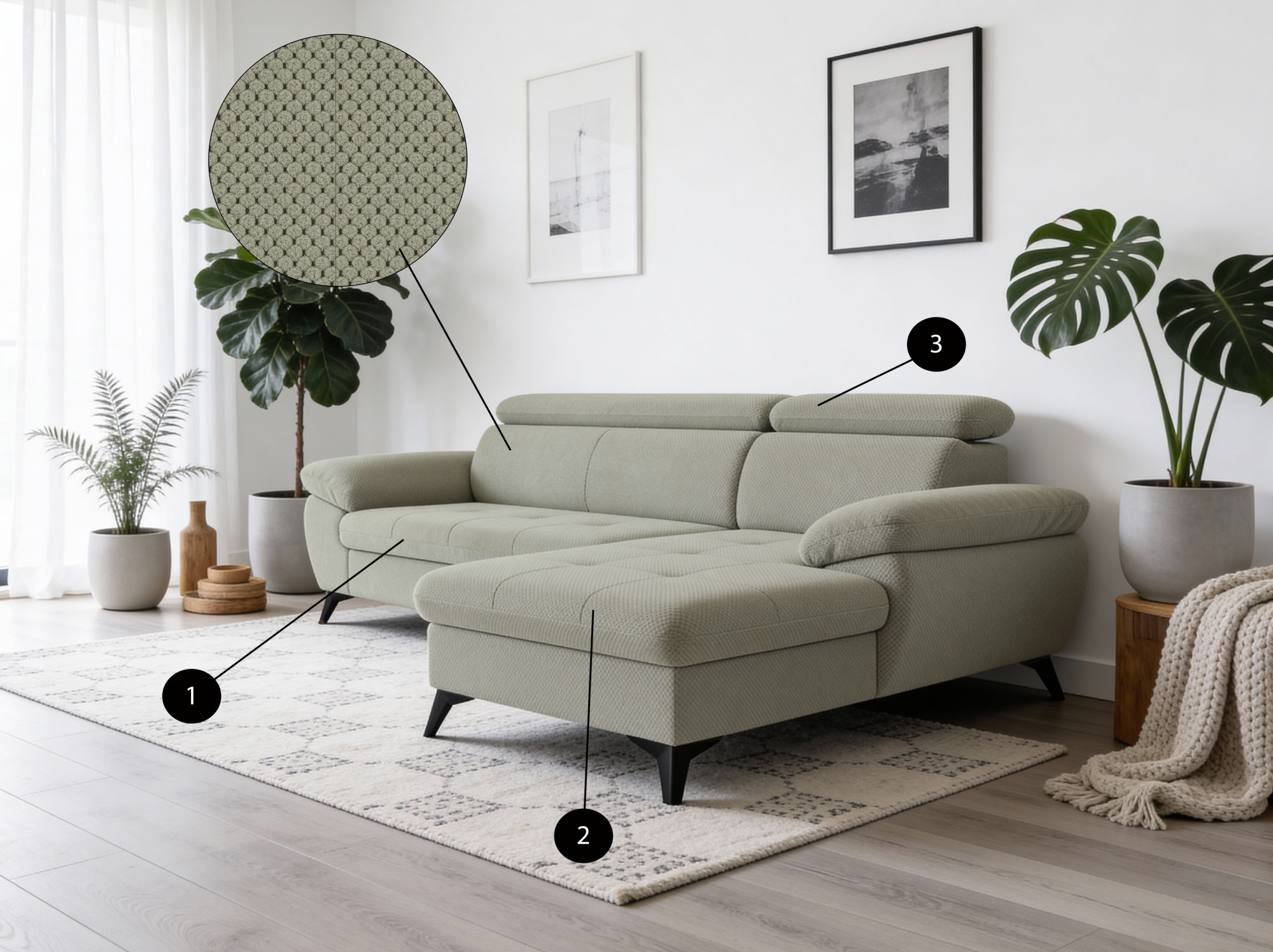 Das Sofa HUGO ist so konzipiert, dass es Anforderungen an Komfort, modernes Design und vielseitige Nutzung erfüllt. Die elegante Form, hochwertige Materialien und durchdachte Konstruktion aus Massivholz machen dieses Sofa zur idealen Wahl für verschiedene Raumtypen. Das Modell HUGO ist in den Varianten rechte oder linke Ecke erhältlich und passt sich somit nahezu jedem Wohnzimmer an.