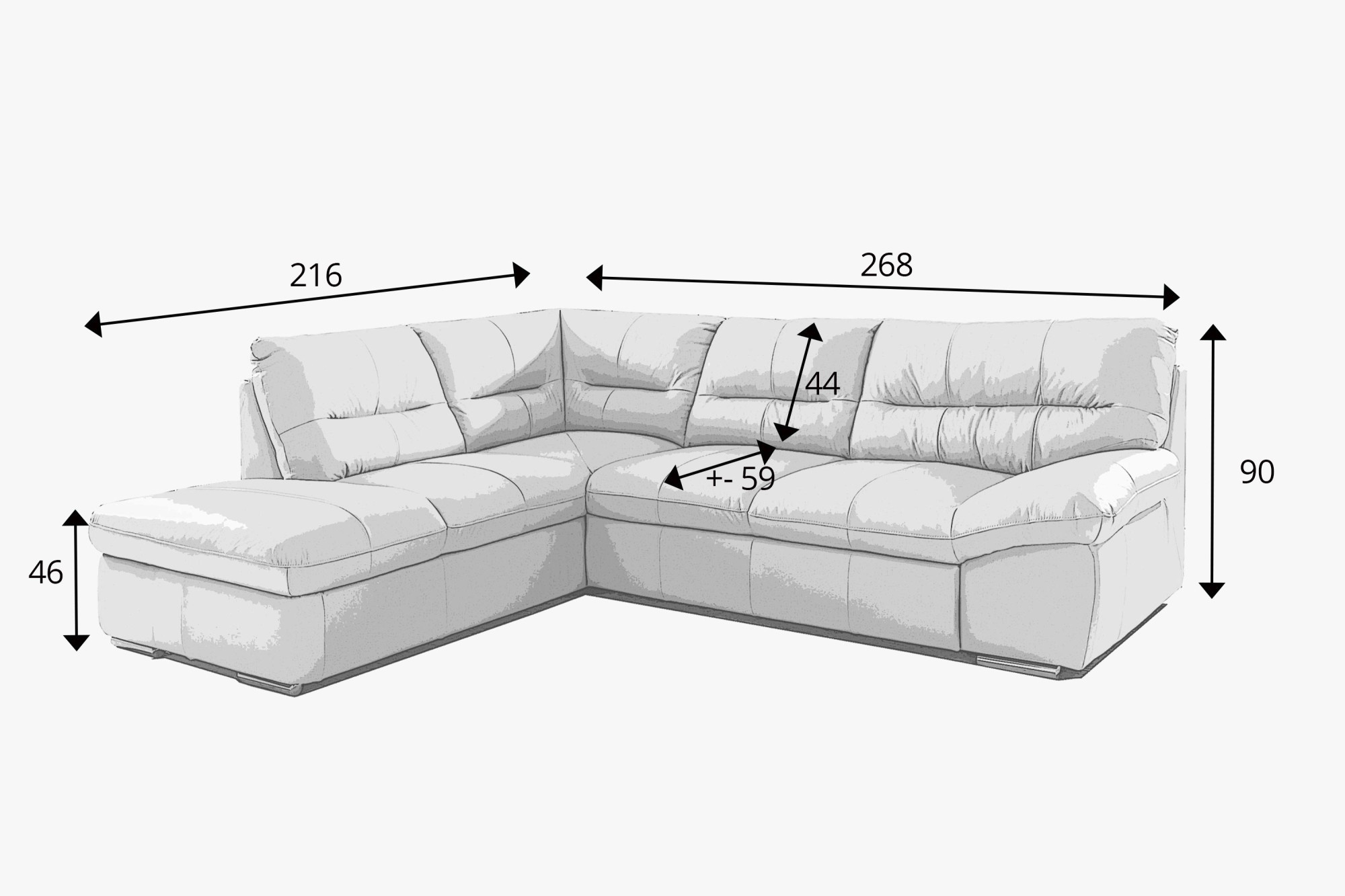 - Maße: Breite 268 cm, Tiefe der Ecke 216 cm, Höhe 90 cm