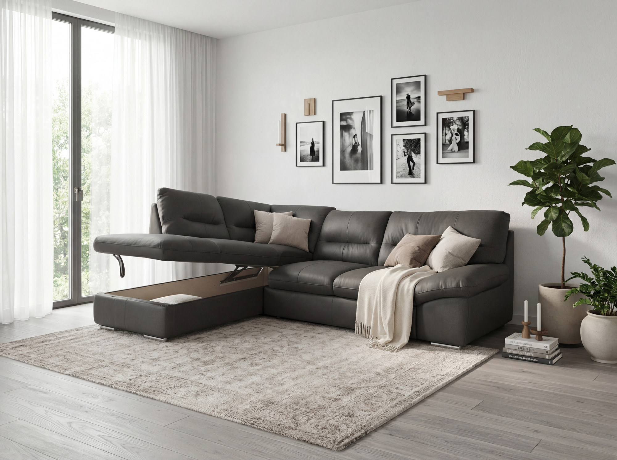 Diese Eckcouch – echtes Leder stellt die perfekte Kombination aus Stil, Praktikabilität und Komfort dar. Sie ist aus erstklassigen Materialien gefertigt, die eine lange Lebensdauer garantieren, und bietet zugleich großzügigen Sitzplatz für Familie und Gäste. Wenn Sie in Ihrem Wohnzimmer ein elegantes Highlight wünschen, das zudem praktische Aufbewahrungslösungen und eine Ausziehmöglichkeit bietet, zögern Sie nicht. Unser Familienunternehmen ist seit 1993 auf dem Markt und bedient jährlich über 50.000 Kunden in der gesamten EU. Wir verfügen auch über einen eigenen Lieferservice, sodass wir für eine sichere und schnelle Zustellung bis zu Ihnen nach Hause sorgen. Bestellen Sie diese Couch noch heute und genießen Sie Luxus und Komfort in einem!