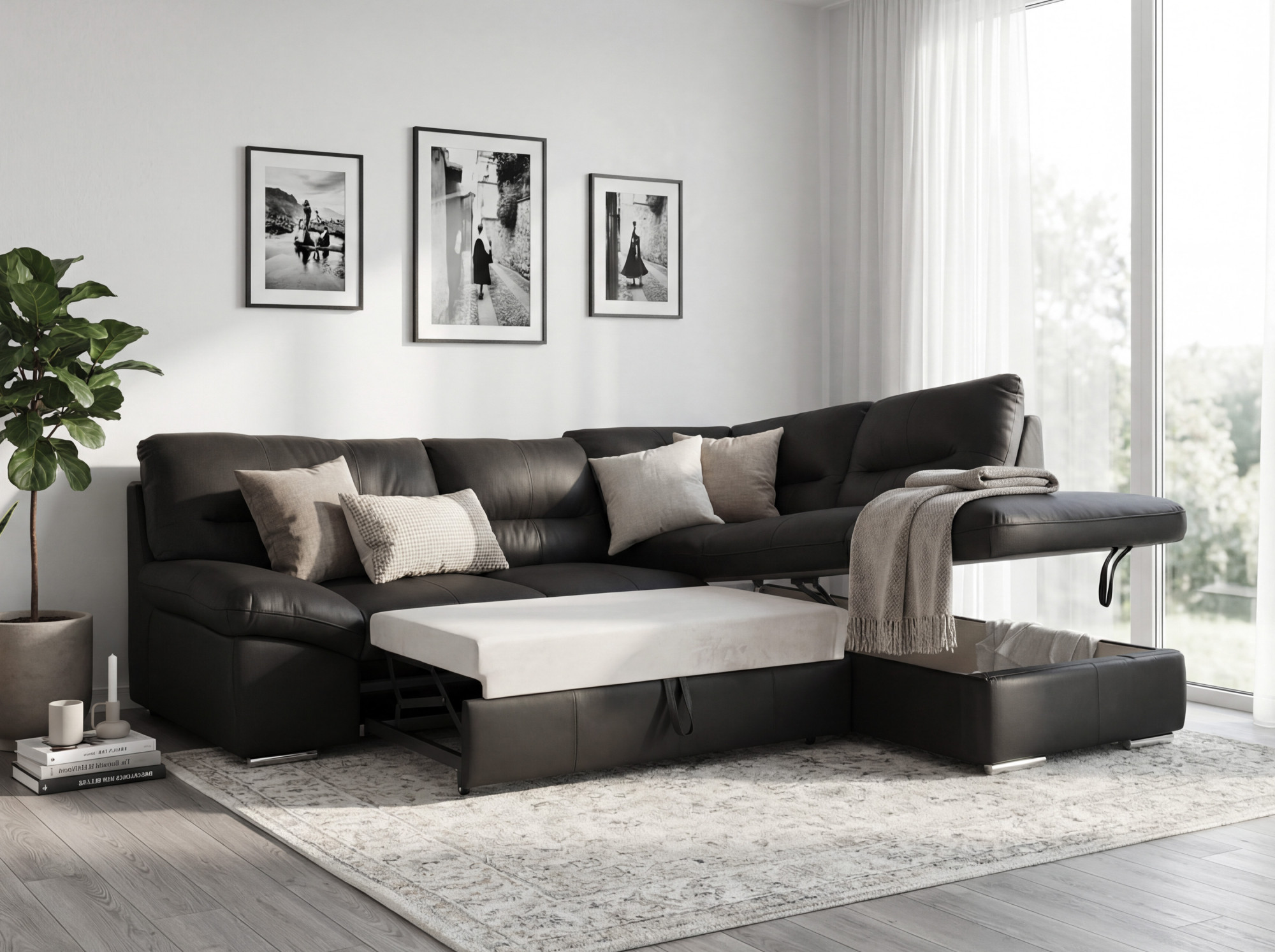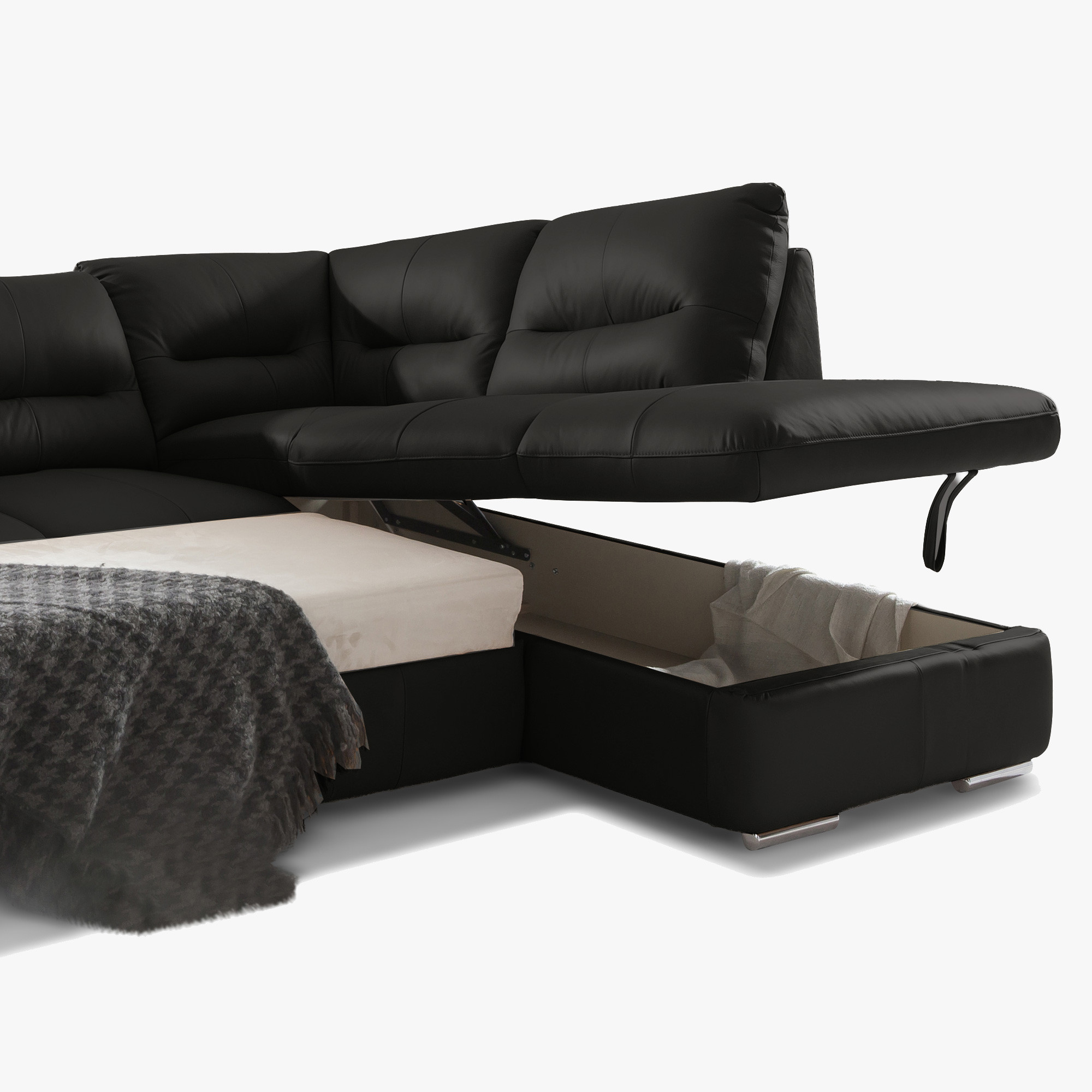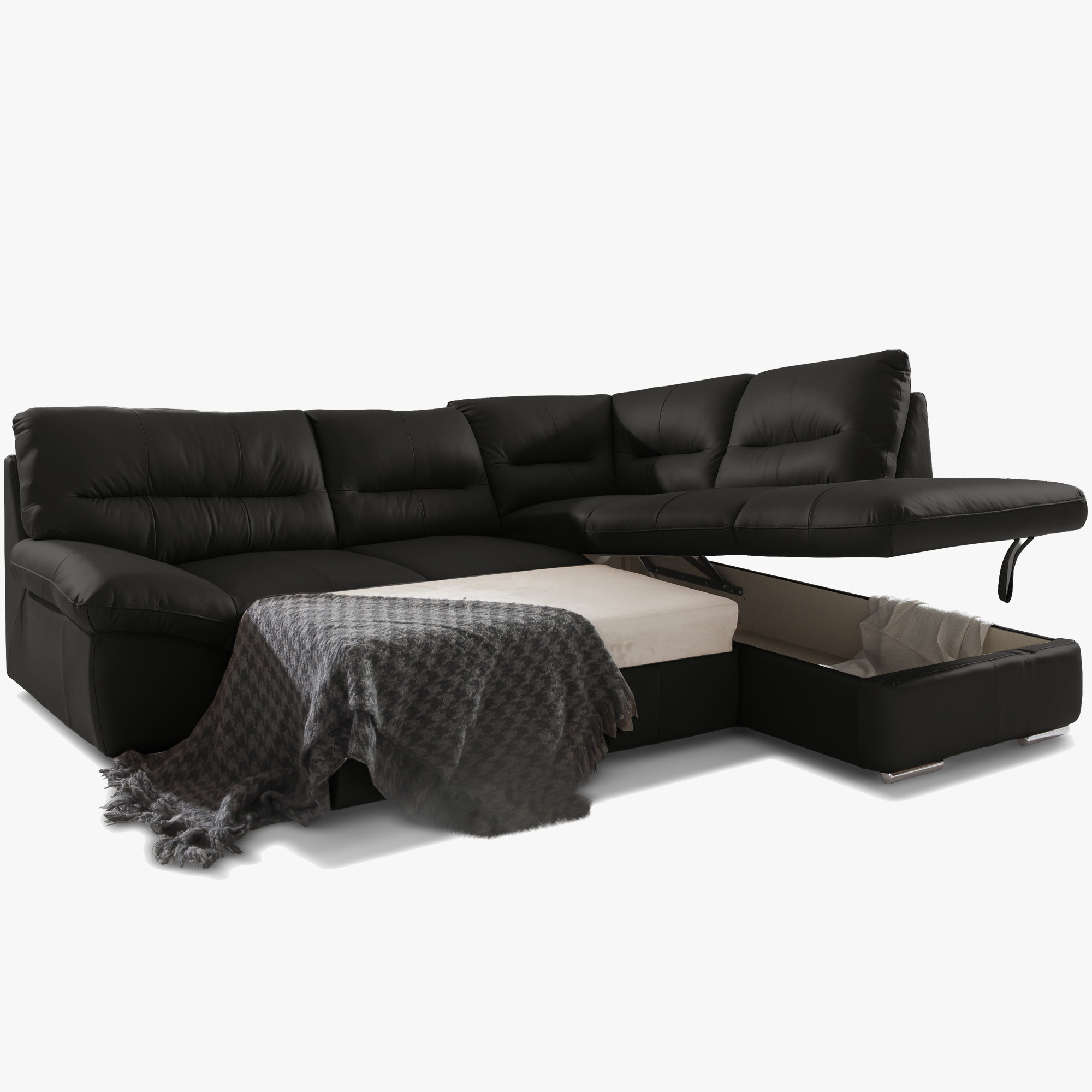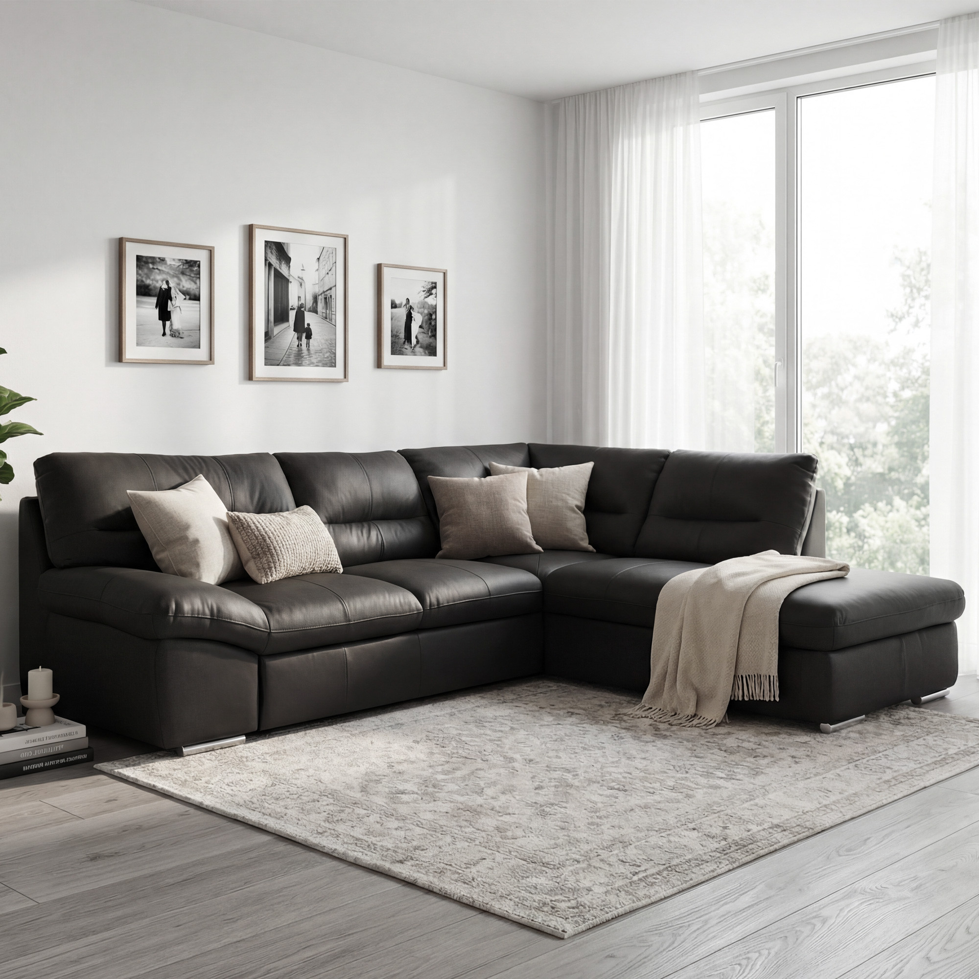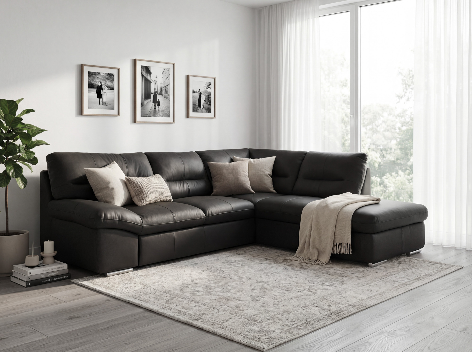 Eck-Sitzgruppe – echtes Leder Farbe Schwarz Modell William ist eine großartige Wahl für jeden, der Luxus, Komfort und praktische Funktionen schätzt. Ihr elegantes Design in Schwarz ergänzt jedes Interieur wunderschön und schafft gleichzeitig eine gemütliche Atmosphäre für Familien- und Gesellschaftstreffen. Der Sitzbereich ist mit hochwertigem Leder mit einer Stärke von 0,9–1,1 mm bezogen, das angenehm kräftig und widerstandsfähig gegen tägliche Beanspruchung ist. Dank der durchdachten Eckausführung (Ecke rechts) erhalten Sie nicht nur ausreichend Sitzfläche, sondern auch einfachen Zugang zu großem Stauraum unter dem Eckteil. Zum Ausklappen des Sofas dient ein praktischer Mechanismus, der Ihnen ein Gelegenheitsbett in der Größe 183 x 123 cm bietet.