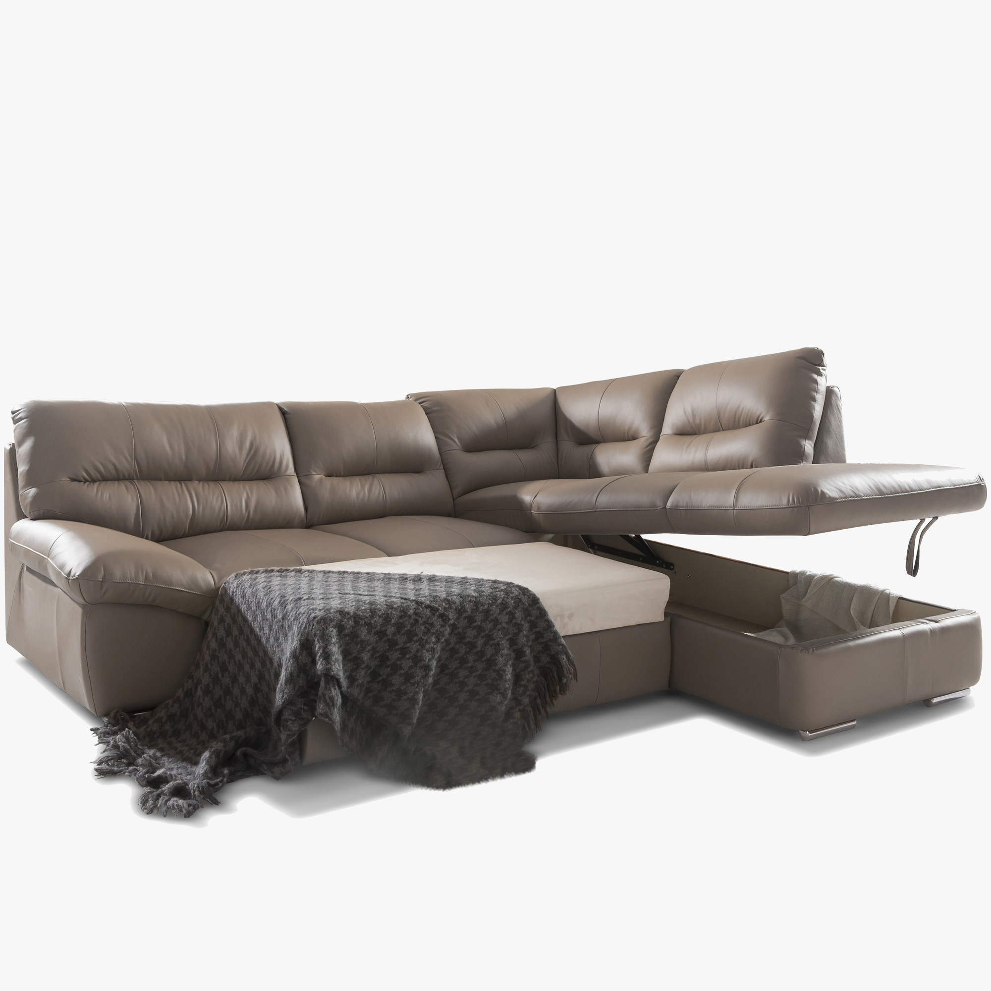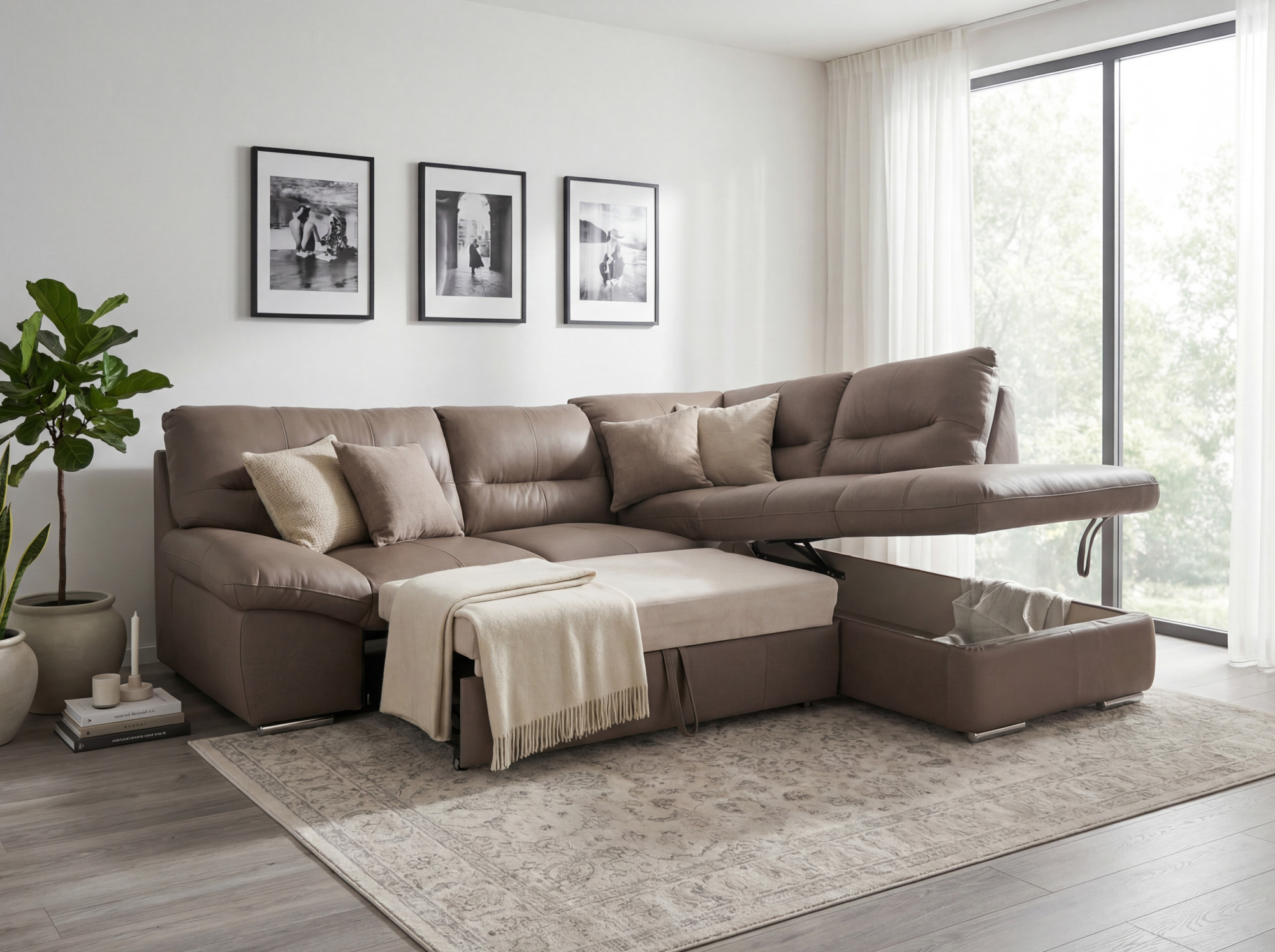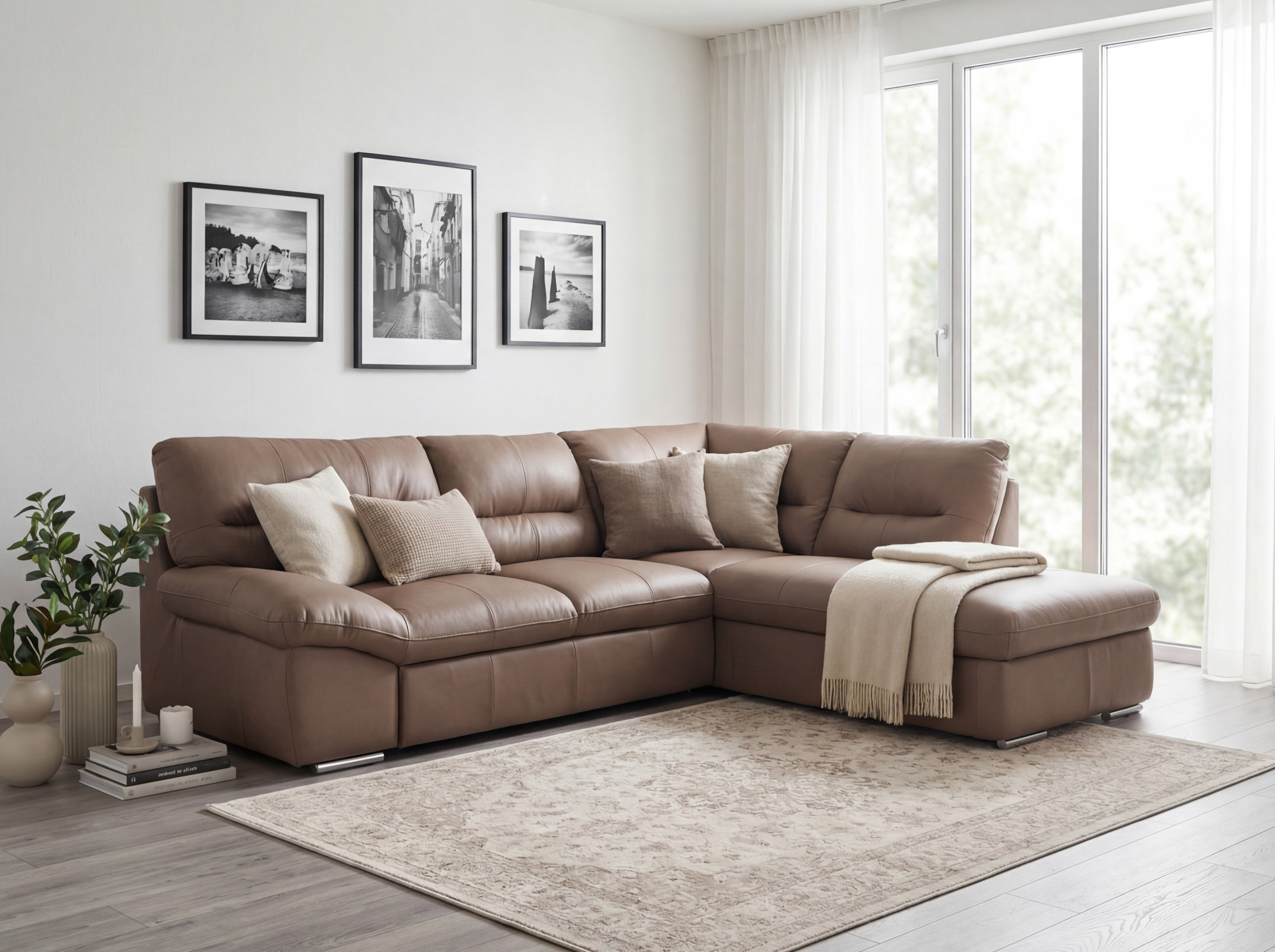 Eckcouch – echtes Leder Farbe Sand Modell William ist die perfekte Wahl für alle, die Luxus, Komfort und praktische Funktionen zu schätzen wissen. Das elegante Design in Sandfarbe ergänzt wunderschön jedes Interieur und schafft gleichzeitig eine gemütliche Atmosphäre für Familien- und Gesellschaftstreffen. Der Sitzbereich ist mit hochwertigem Leder mit einer Stärke von 0,9–1,1 mm bezogen, das angenehm fest und widerstandsfähig gegen tägliche Beanspruchung ist. Dank der durchdachten Eckausführung (Ecke rechts) erhalten Sie nicht nur genügend Sitzfläche, sondern auch einfachen Zugang zu einem großen Stauraum unter dem Eckteil. Zum Ausziehen des Sofas dient ein praktischer Mechanismus, der Ihnen ein Gelegenheitsschlafplatz mit den Maßen 183 x 123 cm bietet.