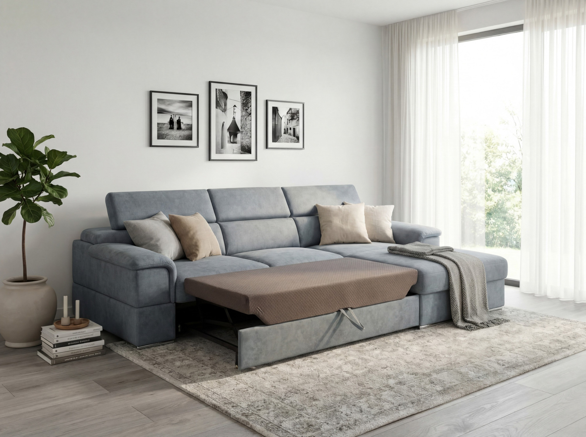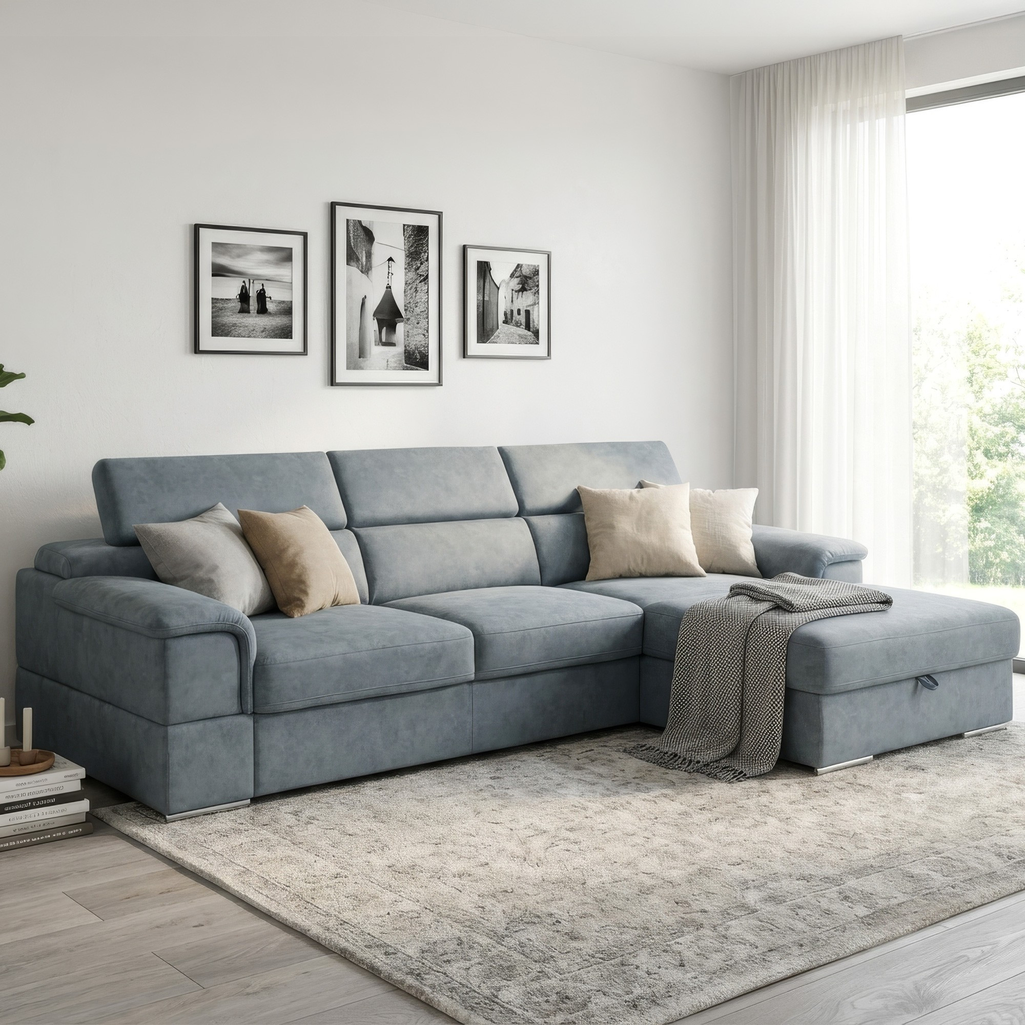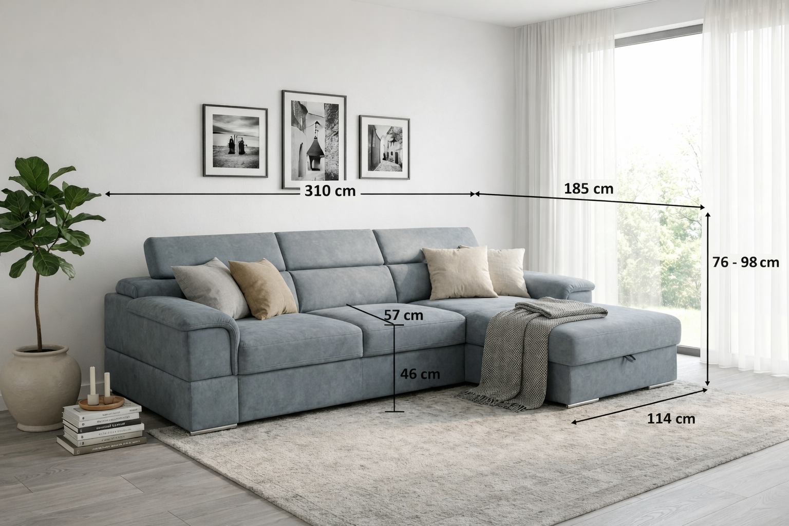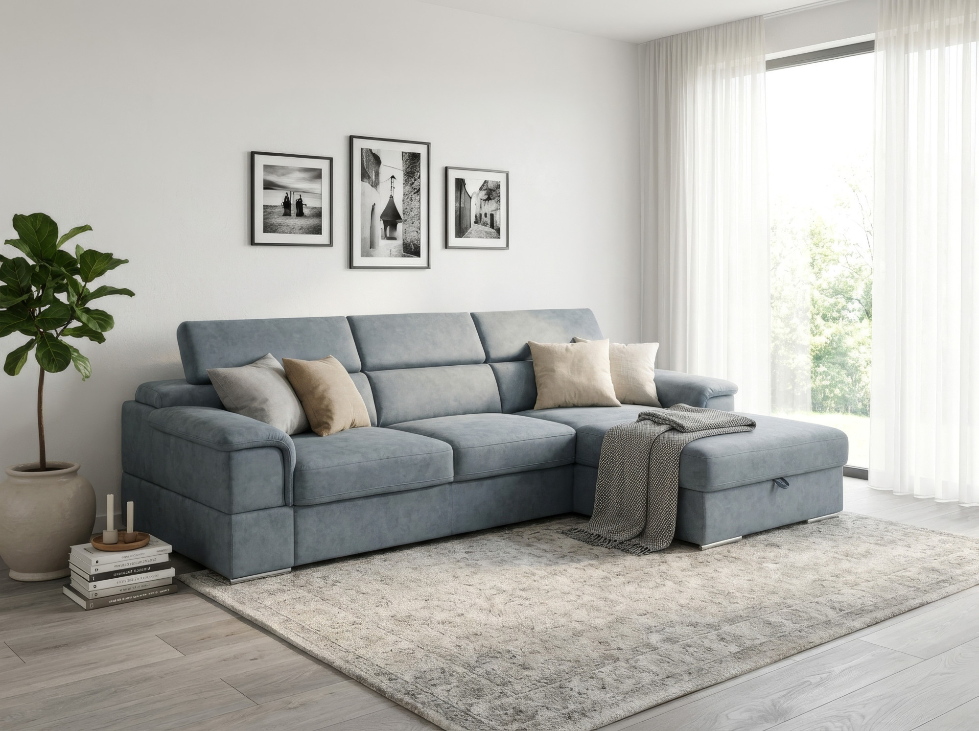 Die Sitzgarnitur LUCIANO verbindet modernes Design, praktische Funktionen und langjährig bewährte Qualität. Dank der modularen Lösung erhalten Sie eine maßgeschneiderte Sitzgarnitur, die sich perfekt an Ihren Raum und Lebensstil anpasst. Die Schlaffunktion, Stauraum und verstellbare Kopfstützen machen sie zur idealen Wahl für den täglichen Gebrauch sowie gelegentliche Übernachtungsgäste. Unser Unternehmen bedient jährlich mehr als 50.000 Kunden in der gesamten EU. Wir sind seit 1993 auf dem Markt, verfügen über einen eigenen Transport und liefern regelmäßig in die Länder CZ, SK, HU, AT und PL. Gegen Aufpreis ist auch der Möbeltransport bis in die Wohnung möglich.