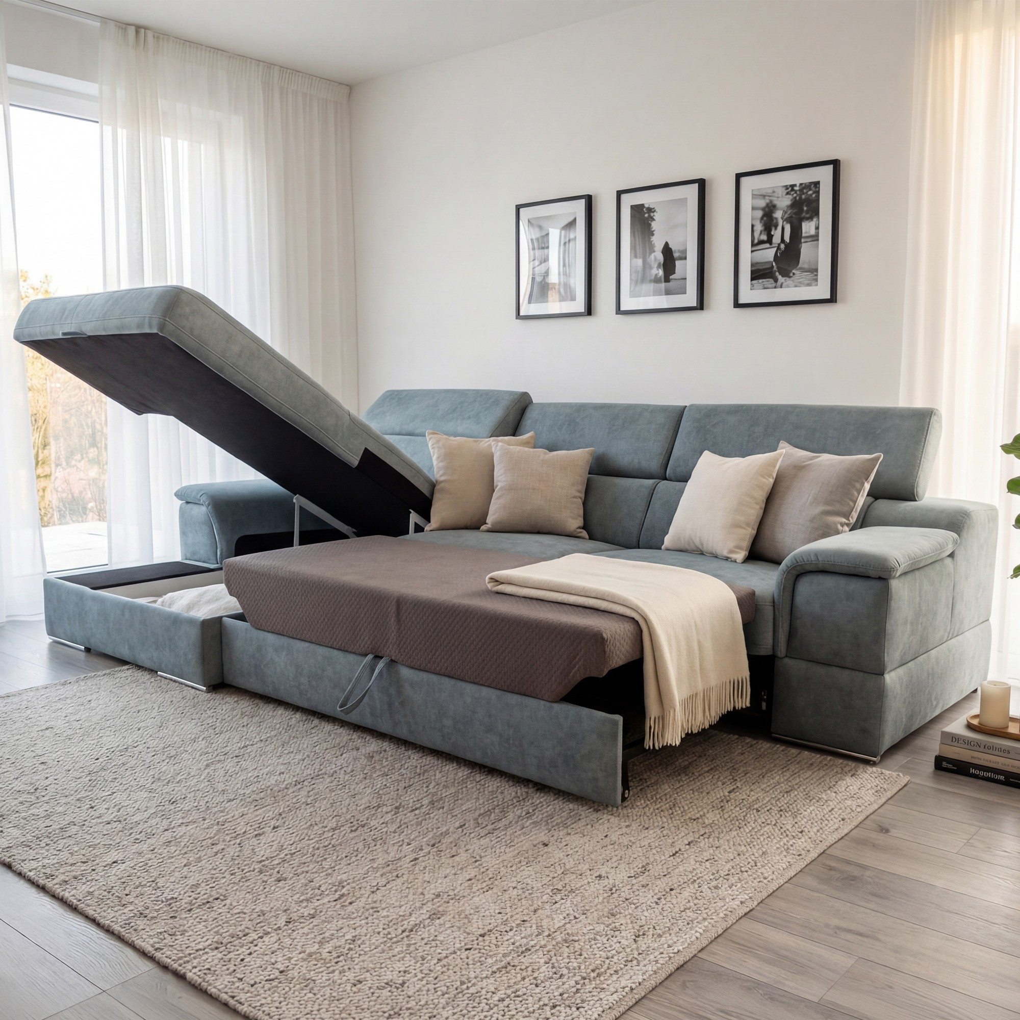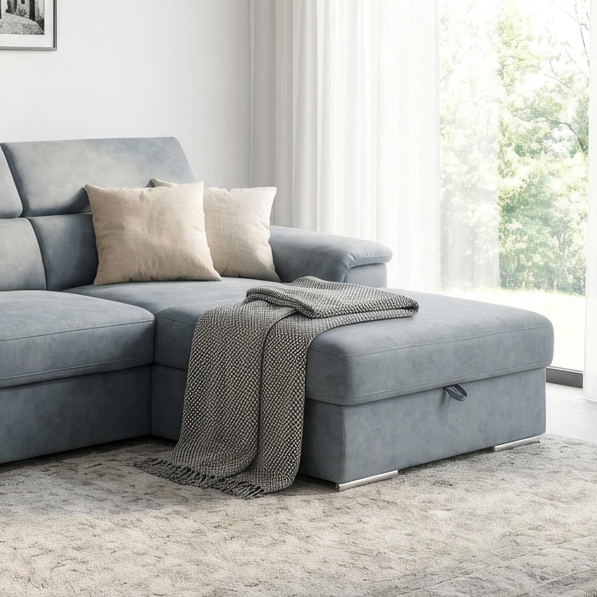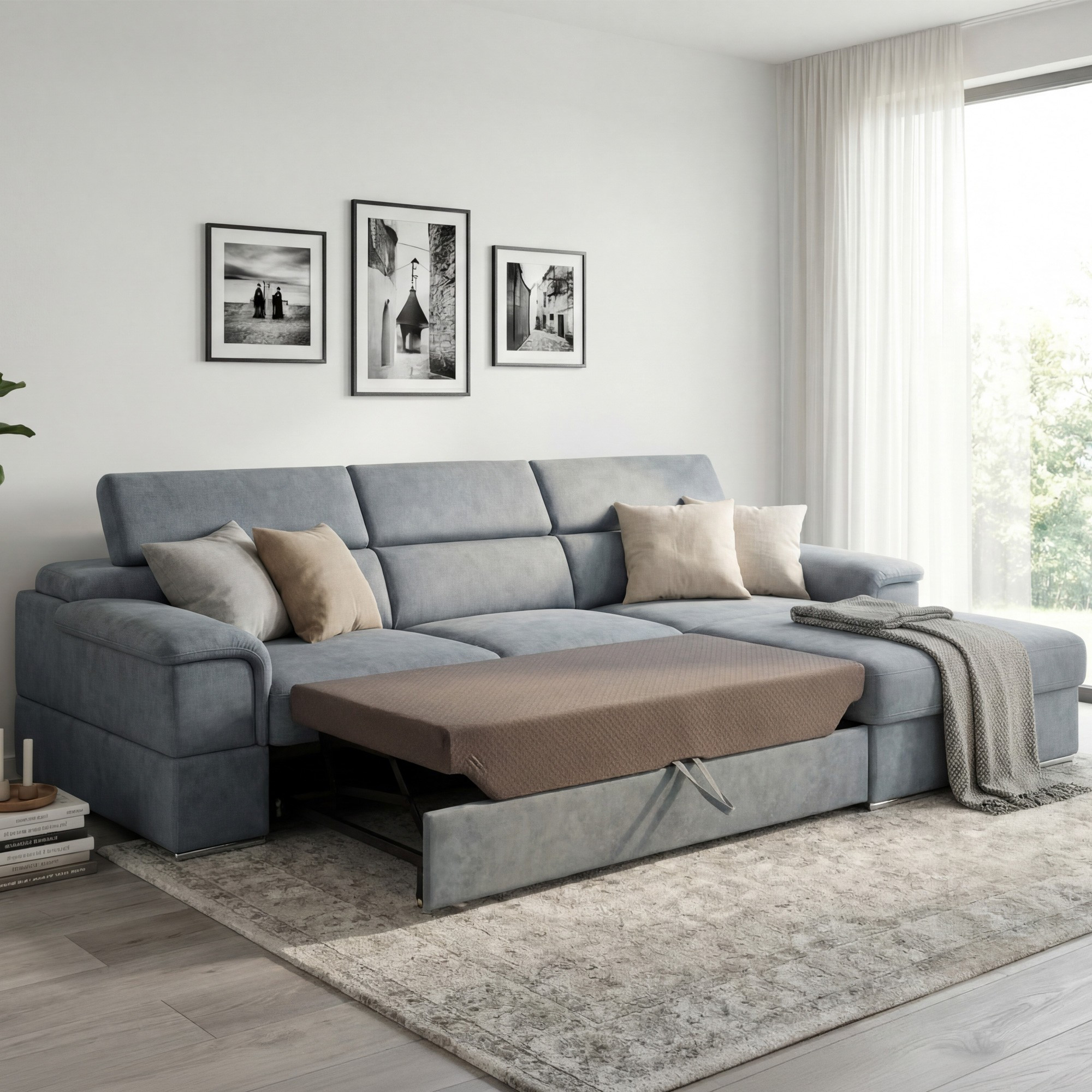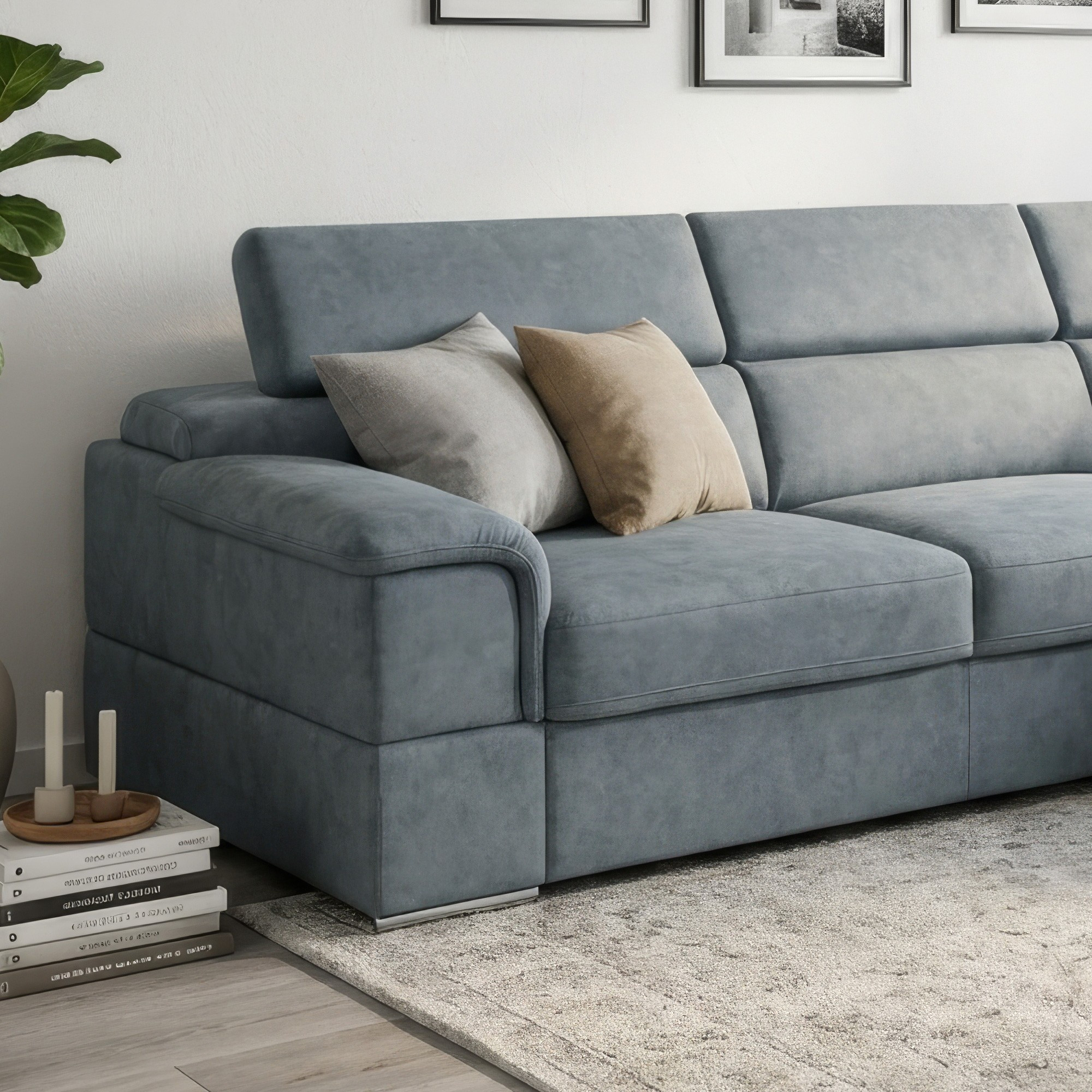 Die Sitzgarnitur LUCIANO verbindet modernes Design, praktische Funktionen und langjährig bewährte Qualität. Dank der modularen Lösung erhalten Sie eine maßgeschneiderte Sitzgarnitur, die sich perfekt an Ihren Raum und Lebensstil anpasst. Die Schlaffunktion, Stauraum und verstellbare Kopfstützen machen sie zur idealen Wahl für den täglichen Gebrauch sowie gelegentliche Übernachtungsgäste. Unser Unternehmen bedient jährlich mehr als 50.000 Kunden in der gesamten EU. Wir sind seit 1993 auf dem Markt, verfügen über einen eigenen Transport und liefern regelmäßig in die Länder CZ, SK, HU, AT und PL. Gegen Aufpreis ist auch der Möbeltransport bis in die Wohnung möglich.