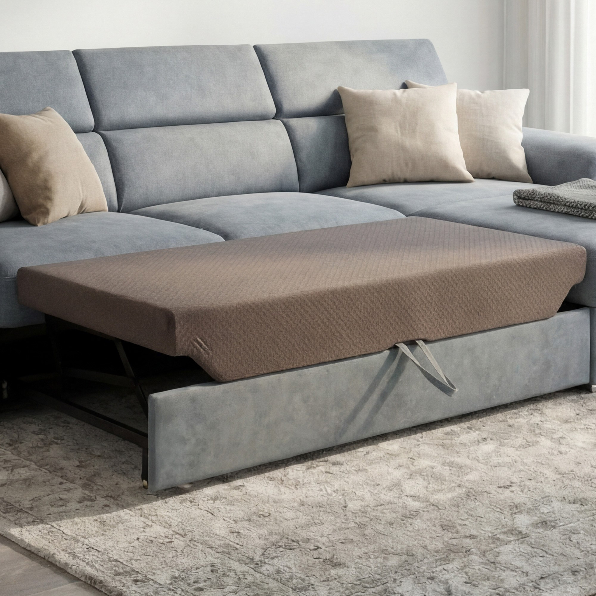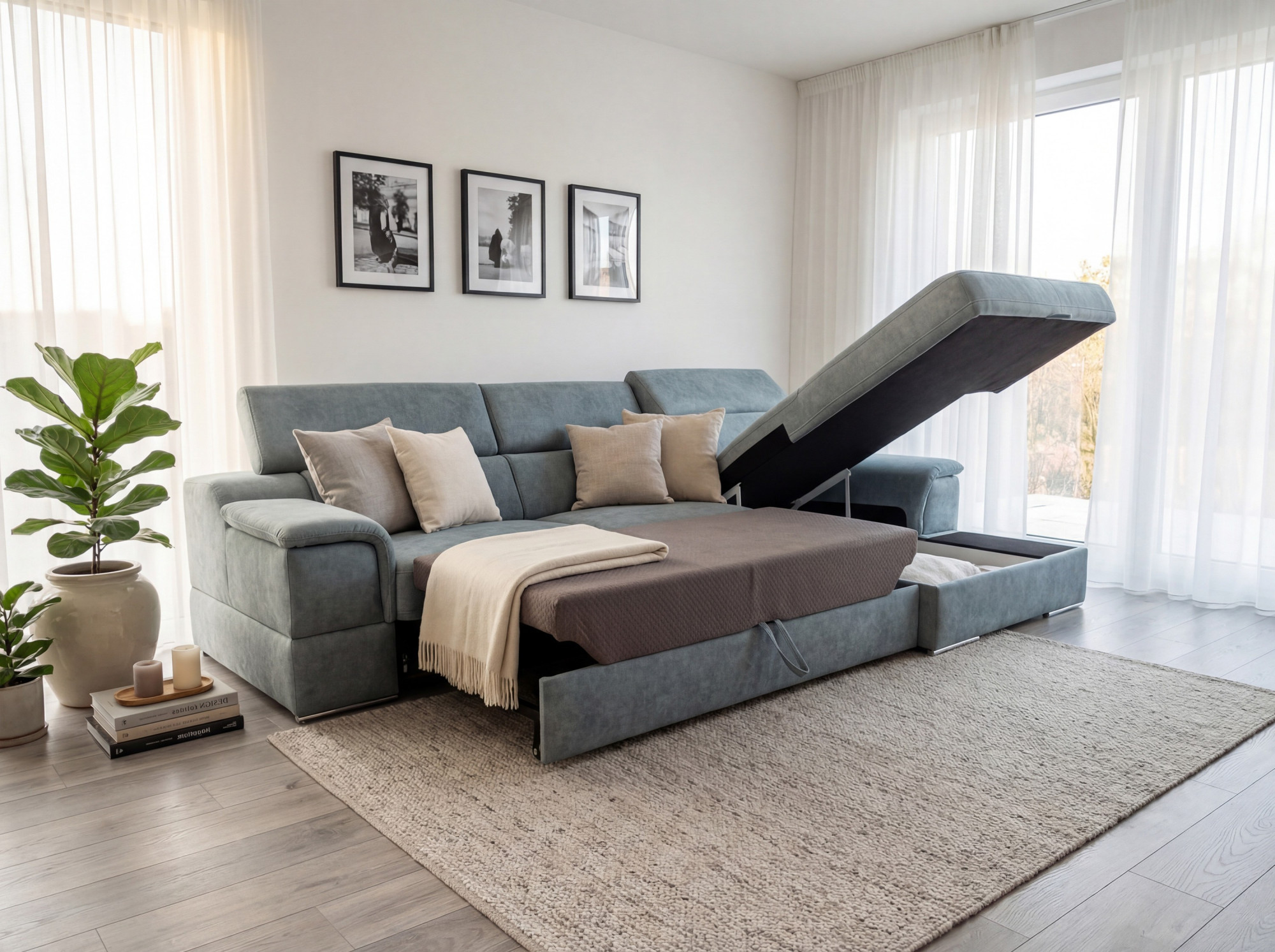 Die Basis des hohen Komforts ist der Sitz aus hochelastischem Schaumstoff auf Wellenfedern, der optimale Körperunterstützung bietet, sowie die Rückenlehne aus elastischem Schaum auf flexiblen Gurten. Die Sitzgarnitur ist mit der Schlaffunktion Typ Dolphin (QF) ausgestattet, die ein schnelles und einfaches Ausziehen ermöglicht und sich auch für häufigeren Übernachtungsgast eignet. Ein praktisches Zubehör ist der Stauraum, ideal für Bettwäsche oder Decken.