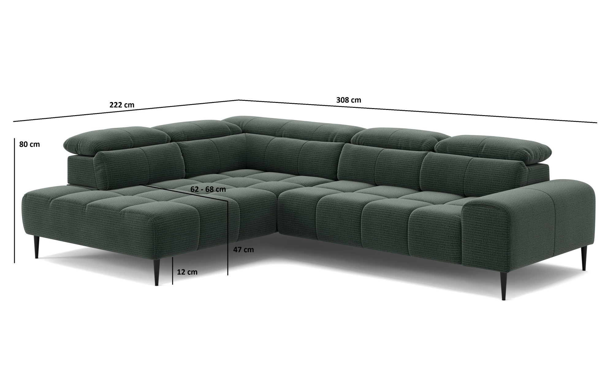 Das Modell THEO bietet überdurchschnittliche Funktionen wie verstellbare Kopfstützen, verstellbare Rückenlehnen und motorischen Sitzvorschub, mit denen Sie Ihre Entspannungs- und Sitzposition im Alltag leicht anpassen können. Die Sitztiefe ist im Bereich von 62–87 cm variabel und die Sitzhöhe beträgt 47 cm. Das elegante Aussehen wird durch schwarze Metallfüße mit einer Höhe von 17 cm betont. Die Sitzgarnitur enthält kein PVC oder Kunstleder-Imitate und ist mit Fokus auf Komfort, Funktionalität und klares Design für moderne Innenräume gestaltet.