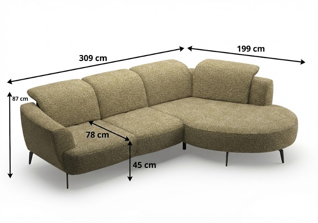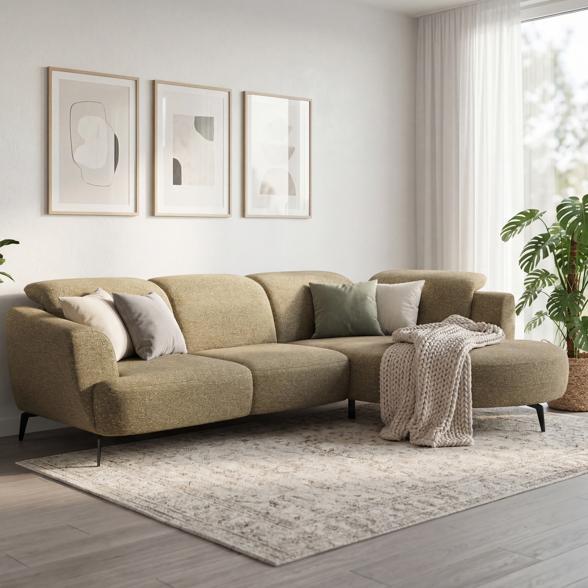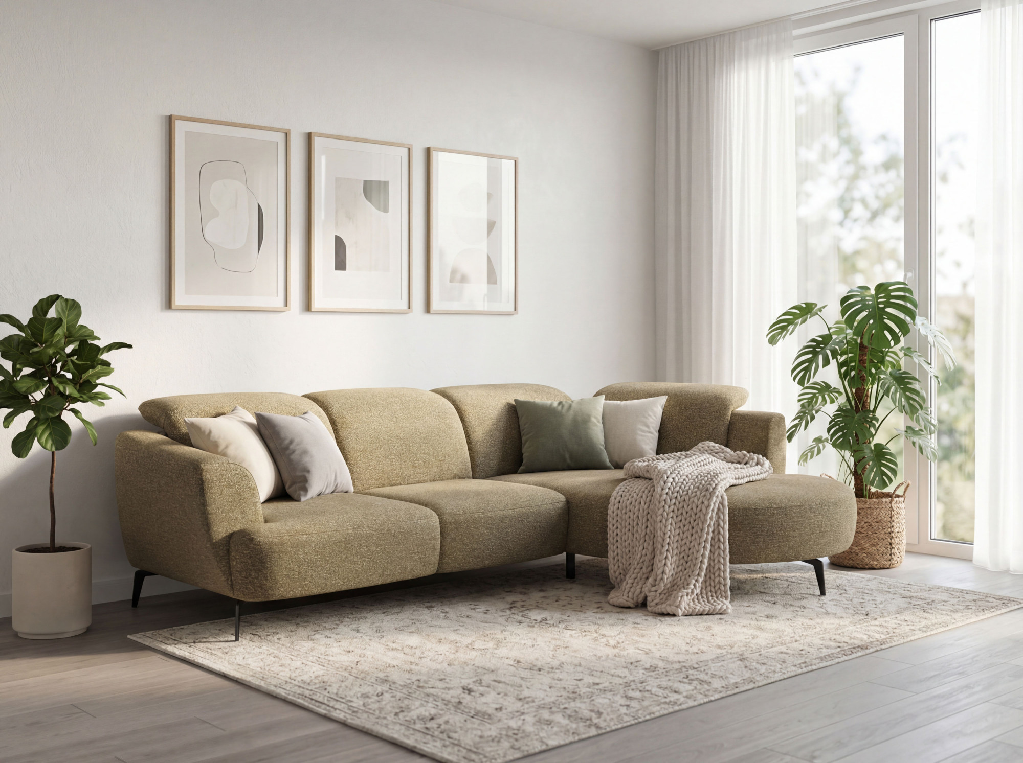 Sitzgarnitur ZOE stellt eine harmonische Verbindung von modernem Design, hohem Komfort und praktischer Variabilität dar. Dank der sanft abgerundeten Formen, eleganten Linien und filigranen Metallfüßen wirkt das Sofa leicht und luftig, bietet dabei aber vollwertiges und bequemes Sitzen für den täglichen Gebrauch. Es ist die ideale Wahl für moderne und zeitlose Innenräume, bei denen nicht nur das Aussehen, sondern auch Funktionalität und lange Lebensdauer eine Rolle spielen. ZOE wird leicht zum Mittelpunkt des Wohnzimmers und zugleich zum Ort der Entspannung für die ganze Familie.