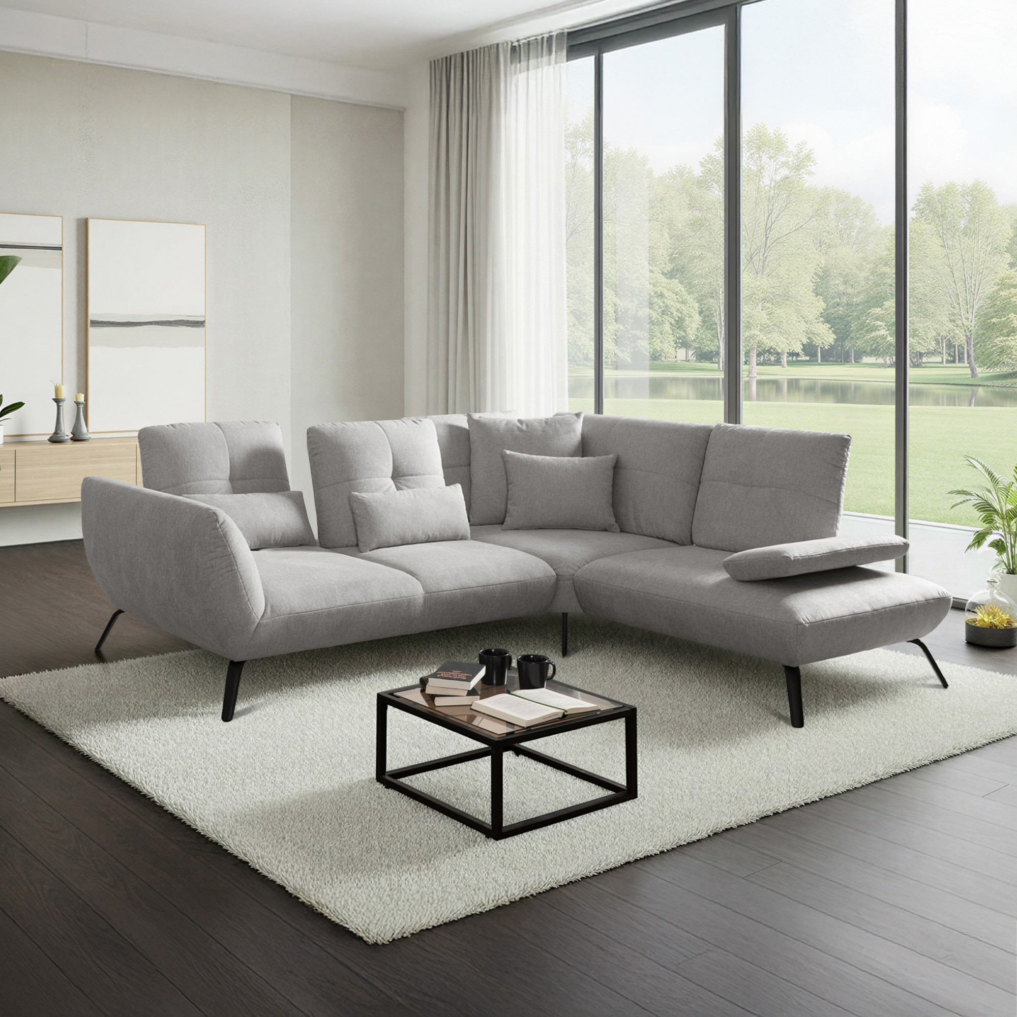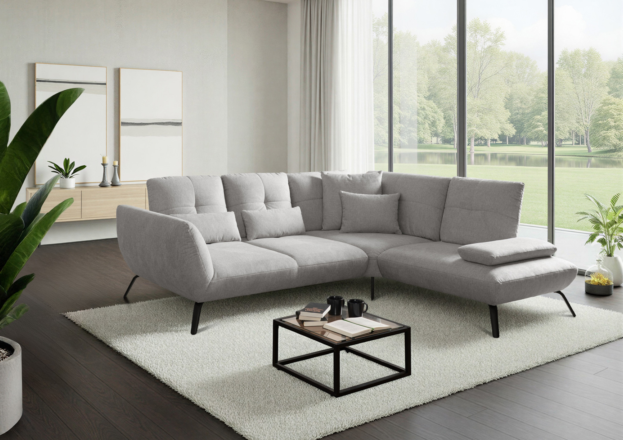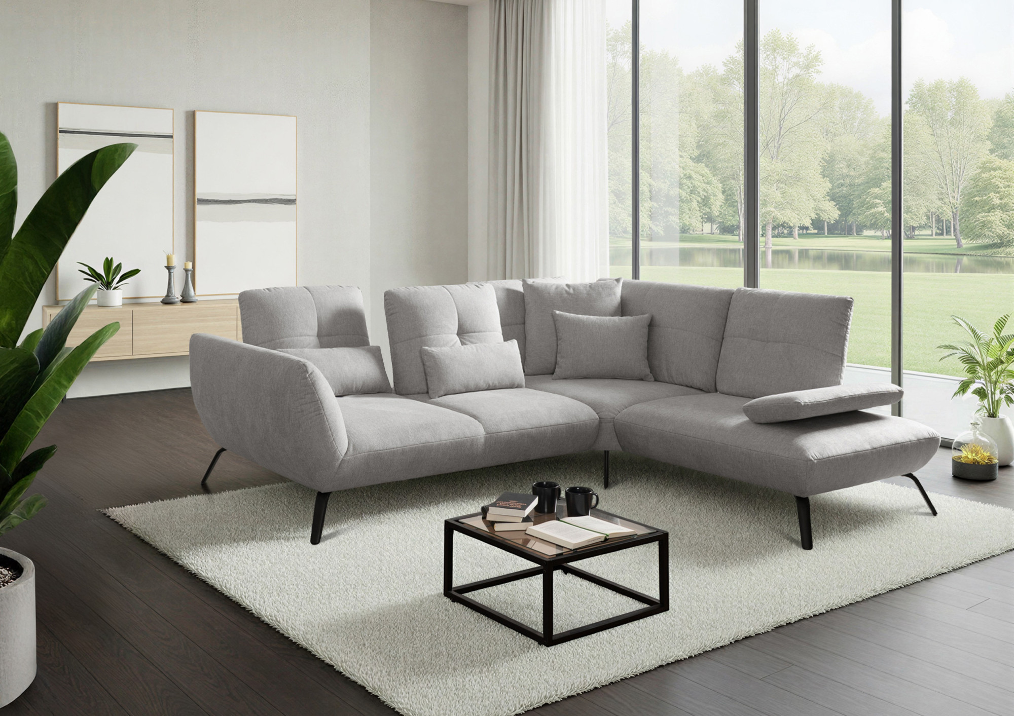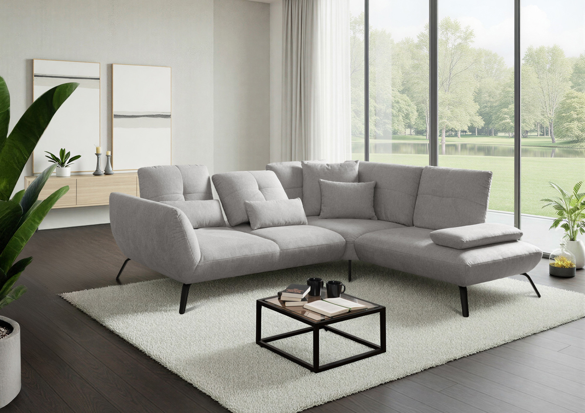 Die Eck-Sitzgarnitur besteht aus einer dreisitzigen Couch, die mit zwei drehbaren Rückenlehnen, zwei großen Lendenkissen und einer Armlehne (Typ B) ausgestattet ist. Zum Set gehört außerdem eine trapezförmige Ecke mit fester Rückenlehne, die Stabilität und einen fließenden Übergang der einzelnen Elemente gewährleistet.