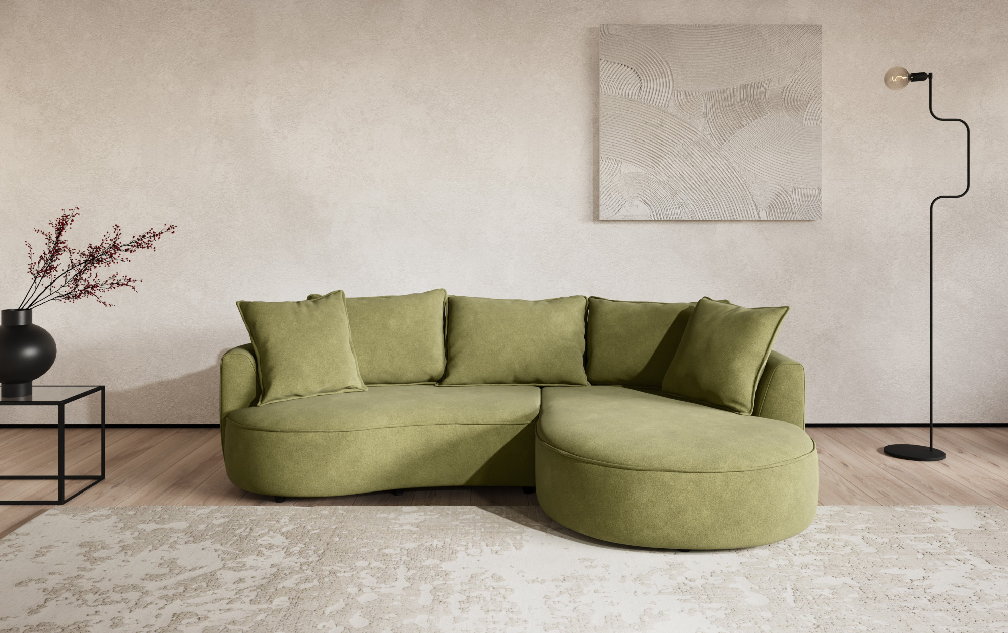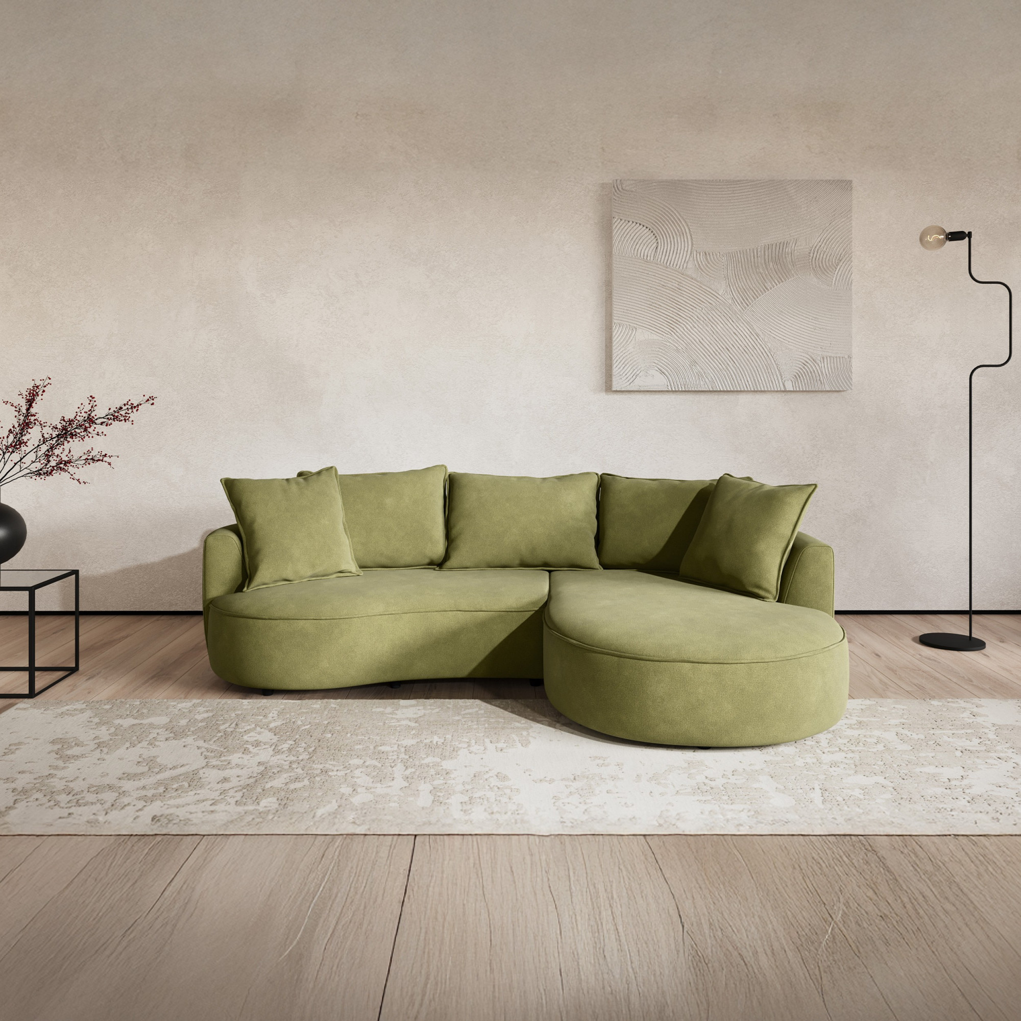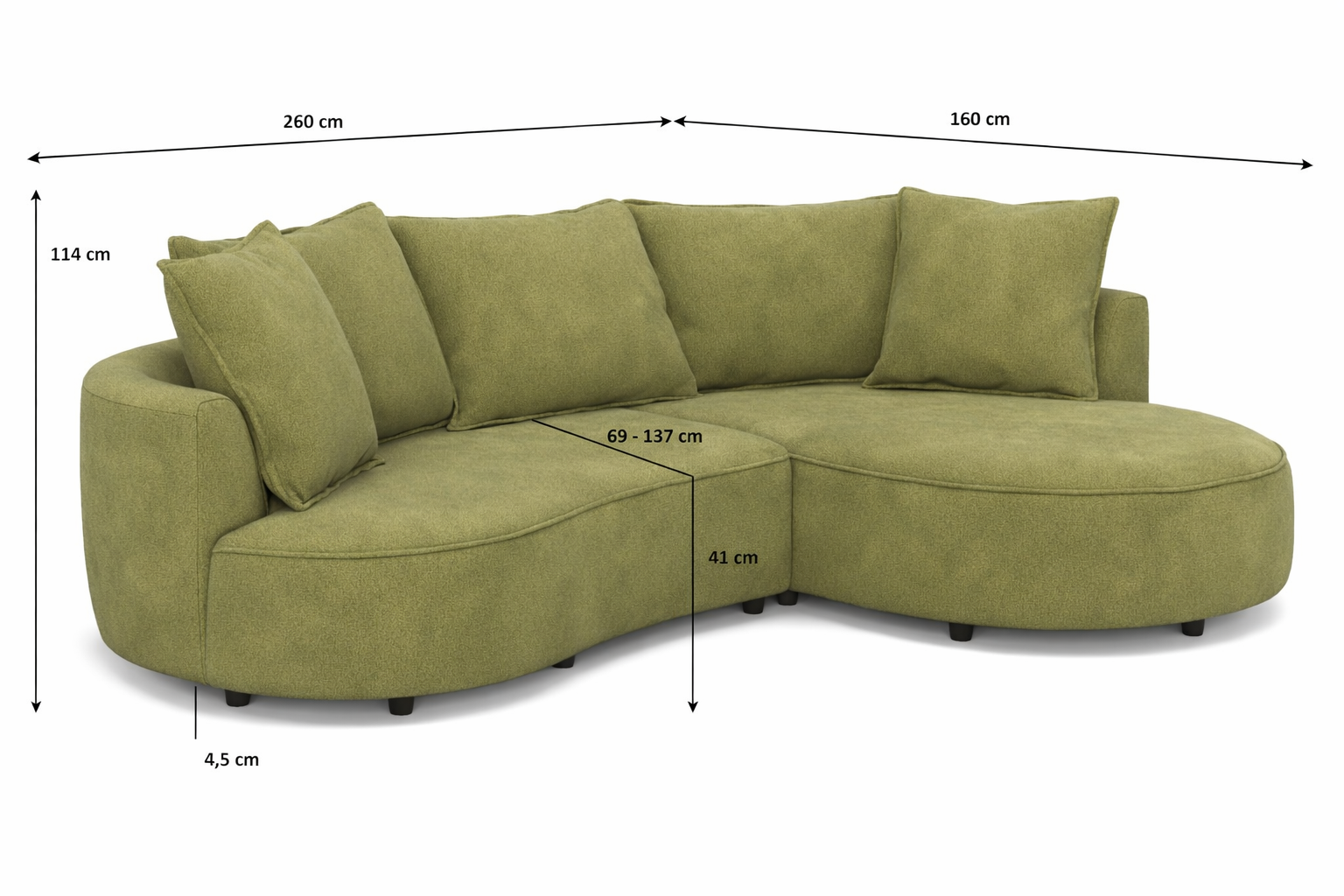 Die Grundlage des Sofas ist eine feste Konstruktion aus Hartholz und Kiefer in Kombination mit spanplatten ohne Formaldehyd. Die Sitzflächen sind mit Stahlwellfedern ausgestattet und mit hochwertigem PUR-Schaum ohne FCKW gefüllt, der optimale Unterstützung und Komfort beim täglichen Sitzen gewährleistet. Die Rückenlehnen bestehen aus hochgewichtiger Polsterklebefolie, die die Formbeständigkeit der abgerundeten Teile und statischen Gurten sicherstellt, was zur ergonomischen Körperhaltung beiträgt. Ein großer Vorteil ist, dass große und kleine Kissen im Preis enthalten sind. Das Sofa enthält keine Lederimitation und bietet die Möglichkeit, Materialien für Sitzfläche und Korpus zu kombinieren.