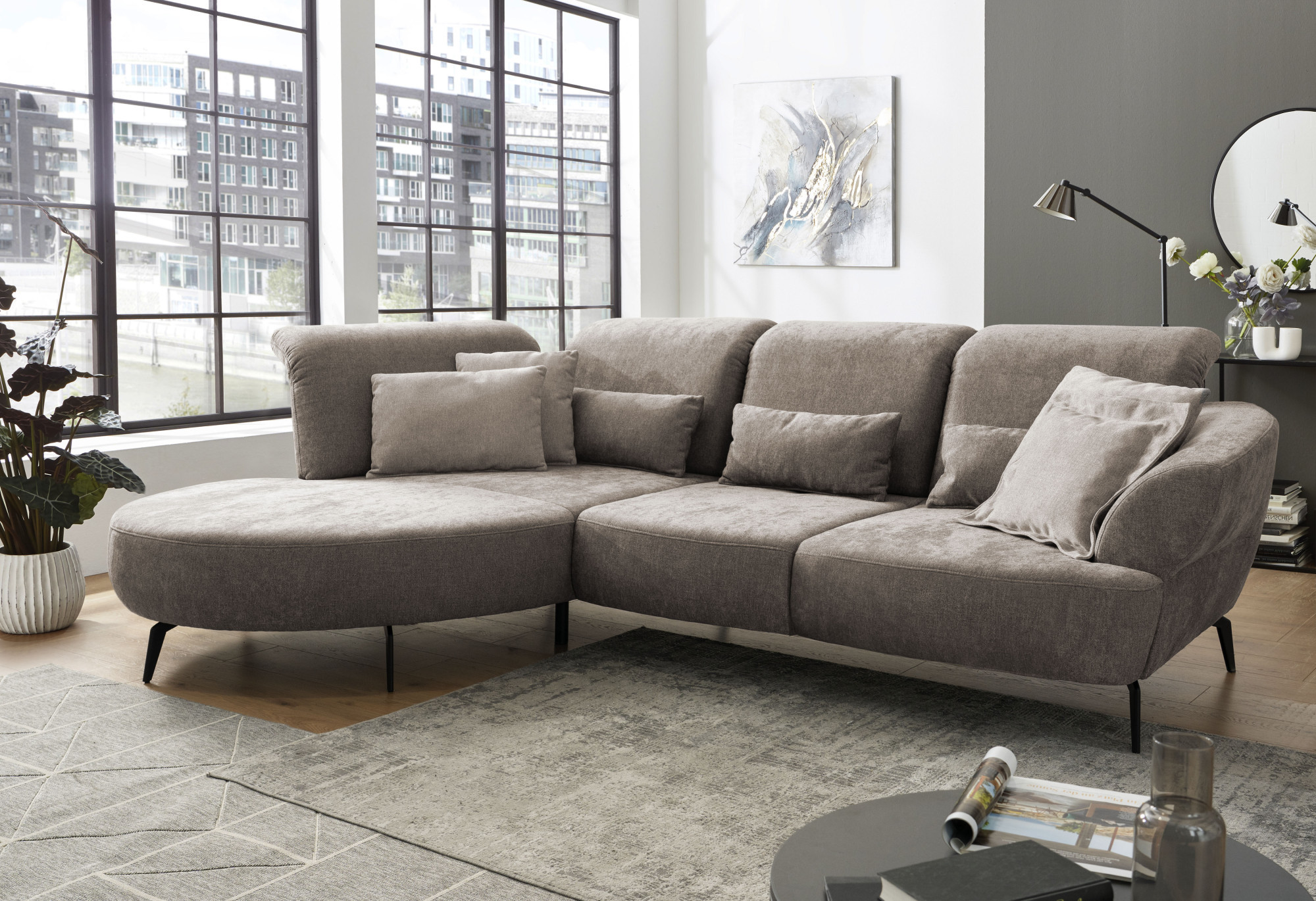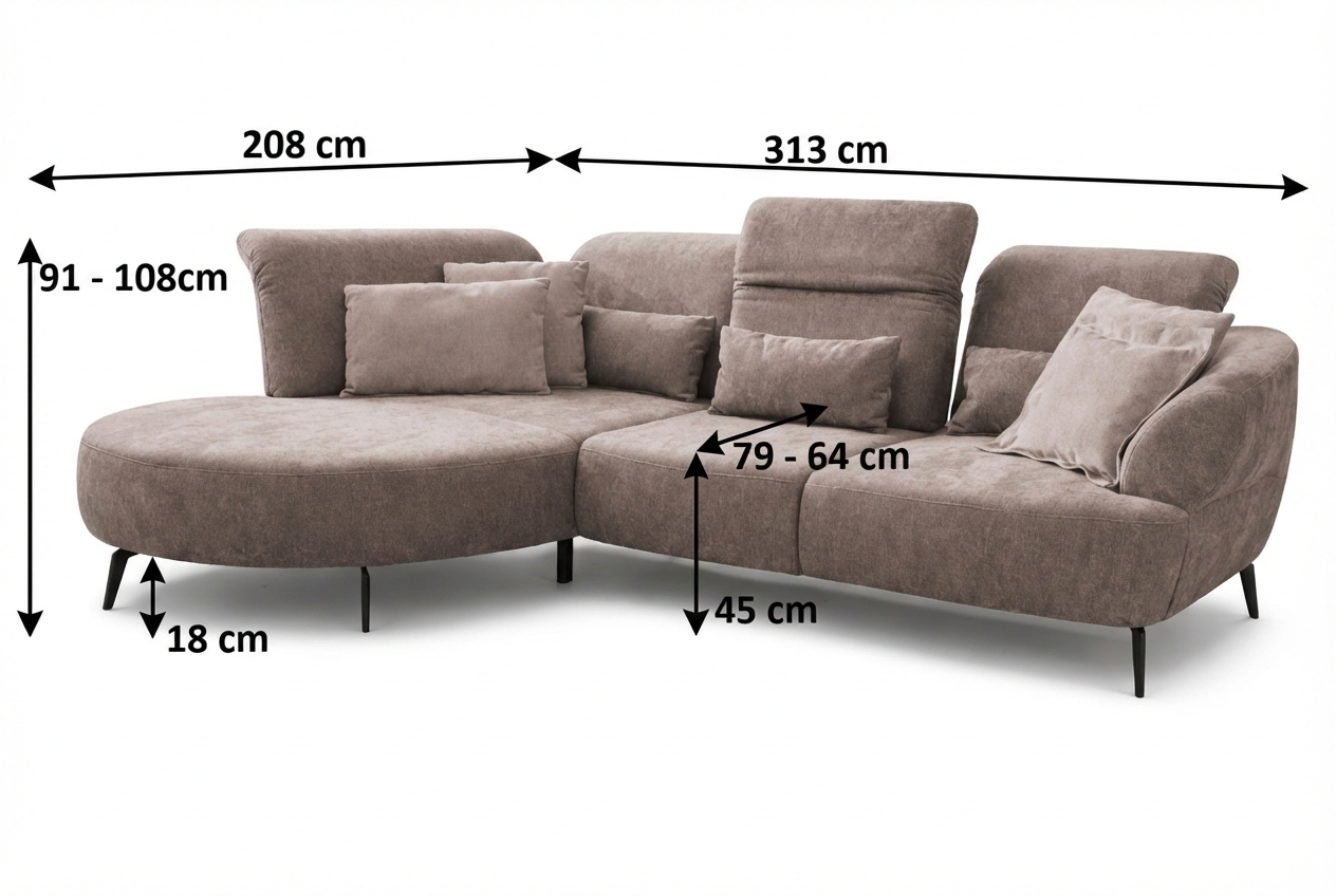 Die Sitzgruppe DANCE ist ein modernes Polstersofa mit elegant abgerundeten Formen, das perfekt in moderne und zeitlose Innenräume passt. Dank des modularen Systems bietet es vielfältige Kombinationsmöglichkeiten – als Ecksofa, Variante mit Longchair, Ottoman oder klassischem Sofa. Auf dem Foto ist die Eckkonfiguration in Softclean-Stoff Cora Clean in der Farbe Taupe zu sehen, die sich durch einfache Pflege und angenehme Oberfläche auszeichnet. Das Sofa wird in der EU hergestellt und erfüllt strenge europäische Qualitäts-, Umwelt- und Arbeitsnormen.