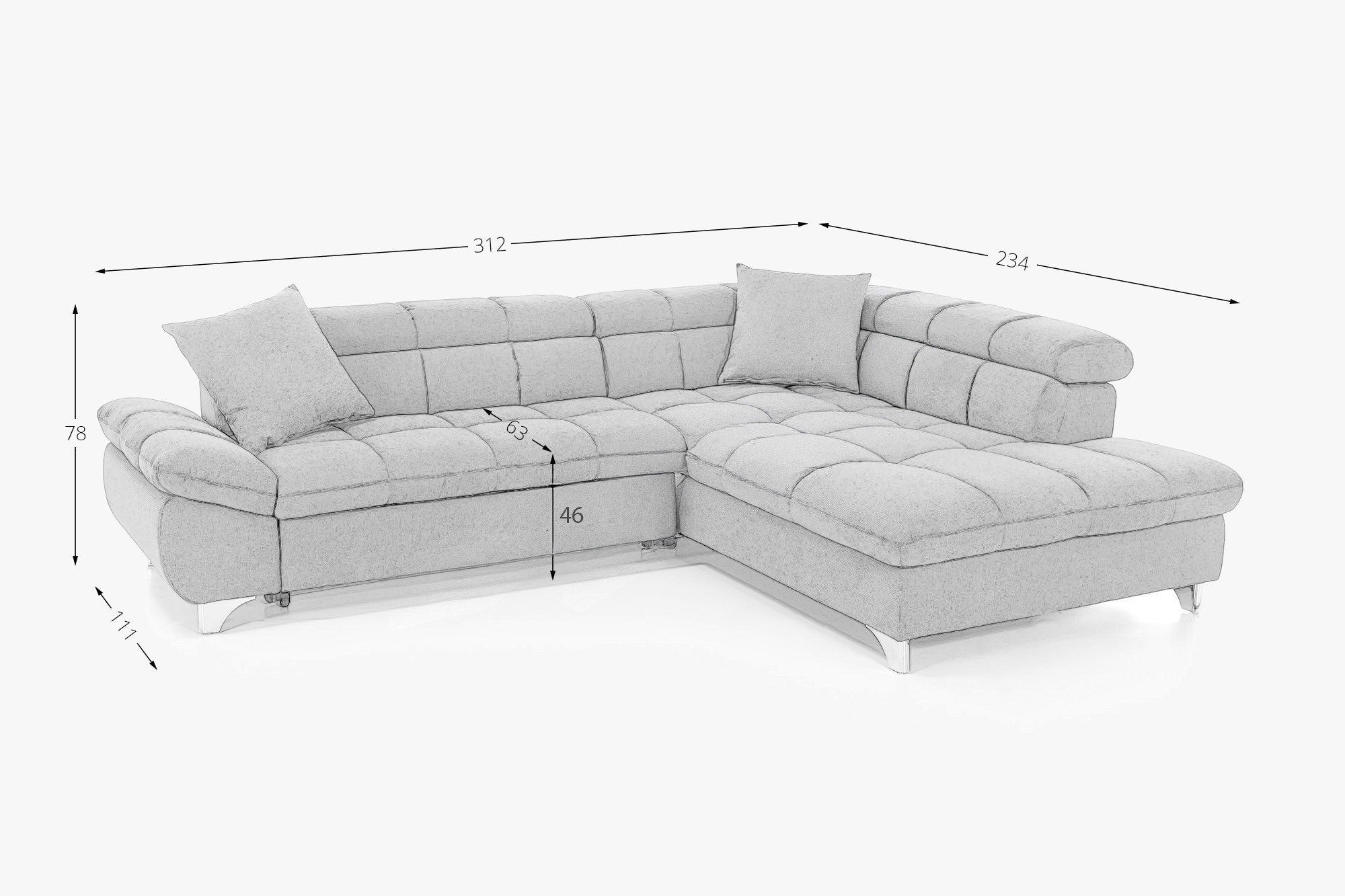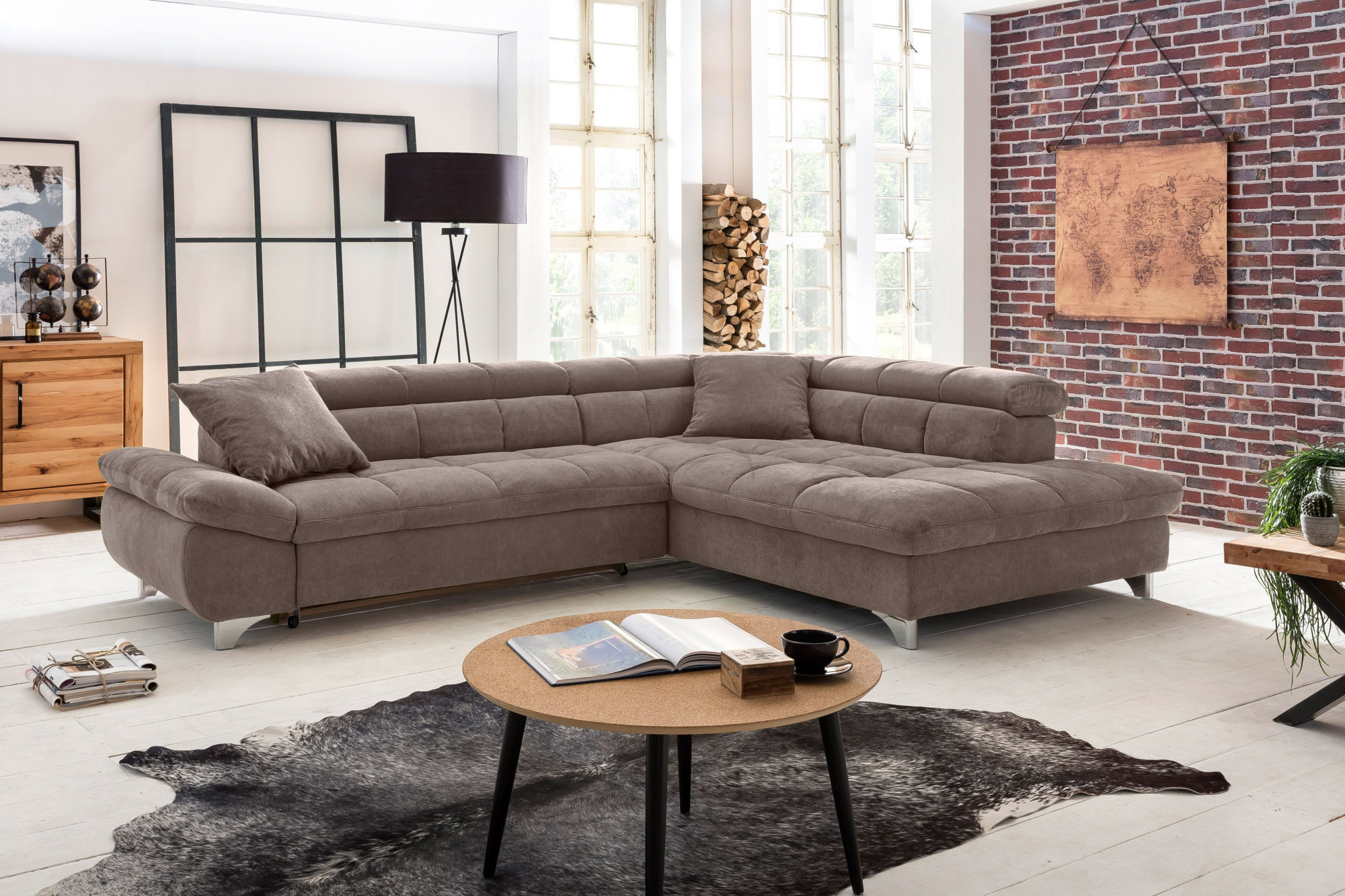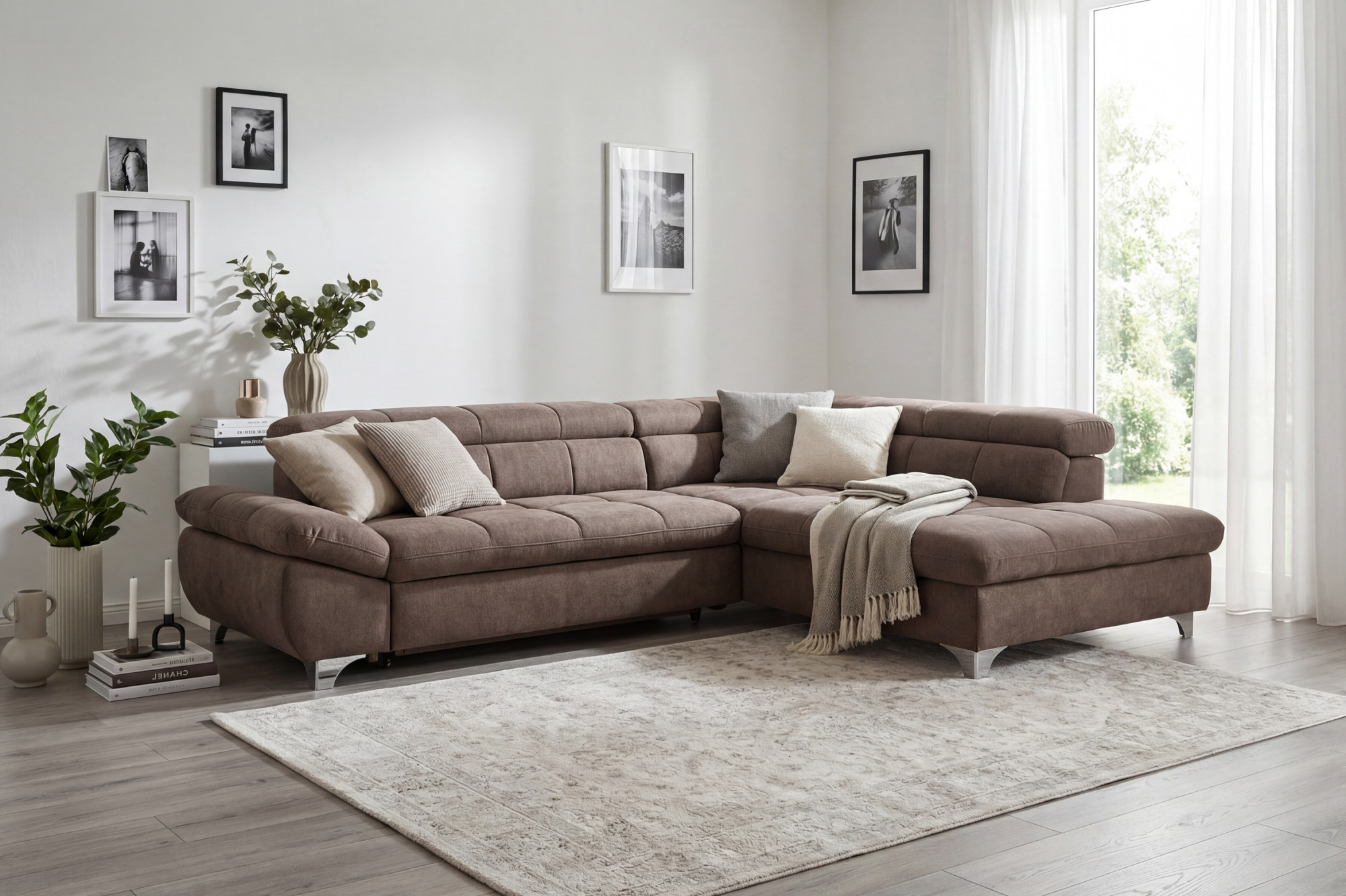 Die Couchgarnitur ist auf Ihre Bedürfnisse ausgerichtet – sie bietet eine praktische Schlaf-Funktion für gelegentliches Übernachten von Gästen und sorgt für maximalen Komfort beim Entspannen. Verstellbare Kopfstützen ermöglichen noch mehr Entspannung beim Fernsehen oder Lesen. Die Maße des Sofas betragen Breite 312 cm und Tiefe 234 cm, erhältlich ist eine Variante mit Ecke links oder rechts, je nach Anordnung Ihres Raumes. Metallbeine mit einer Höhe von 10 cm verleihen der Garnitur ein leichtes und luftiges Aussehen und ermöglichen eine einfache Reinigung des Bodens unter dem Sofa. Diese Eckcouchgarnitur mit Schlaf-Funktion in zeitlosem Grau-Braun ist die perfekte Wahl für Familien sowie Komfortliebhaber, die hochwertige Verarbeitung und zeitloses Design schätzen.